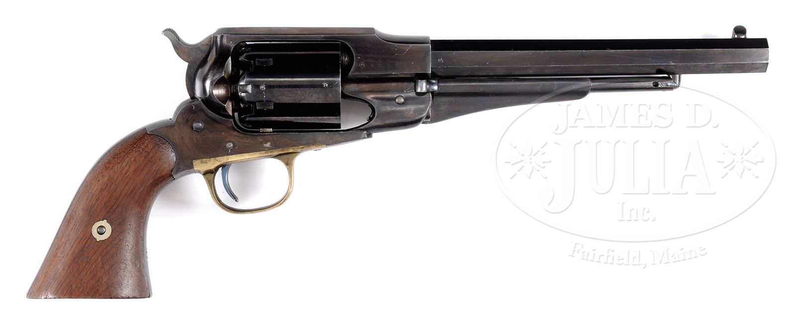 REMINGTON MODEL 1863 “NEW MODEL” ARMY REVOLVER.SN 92673. Cal. 44 8″ bbl, blue finish, plain walnut grips. CONDITION: Very fine. Bbl retains 95% bright blue finish with slight muzzle high point wear. Bbl address is sharp. Bore is frosty with sharp rifling. Rammer retains 90% bright blue with some thinning. Cylinder retains 90% bright blue with a slight drag mark and some high point wear at front and rear of cylinder. Frame retains 80% bright blue with some erosion and dents on left side of top strap. Some minor scratches and slight fading on bbl lug. Brass trigger guard is nice mustard patina. Trigger retains 90% fire blue. Hammer retains 90% dull case color with some oil stains. Grips are very fine with a strong cartouche and only a few slight handling marks. Bbl, rammer, frame, cylinder, trigger guard, and bottom of grip all show military inspector marks. SN is well struck on bottom of bbl. A very fine Remington New Model Army revolver that would be hard to improve upon. 49548-9 TEP C&R (3,000-5,000) – Lot 1131