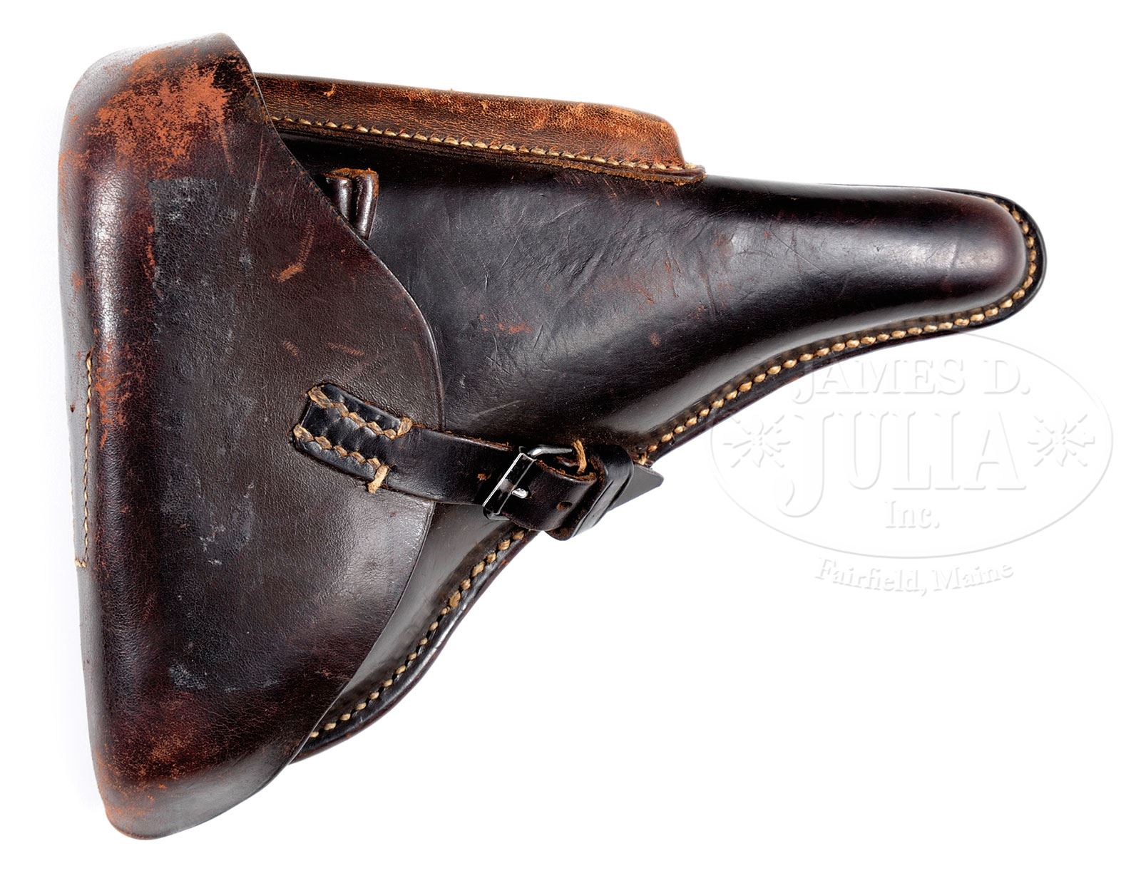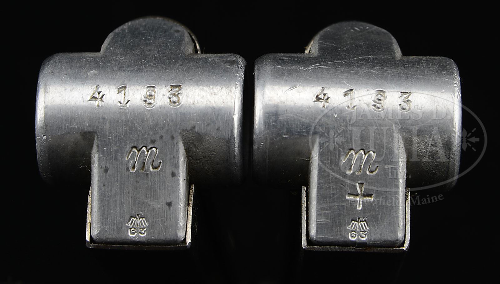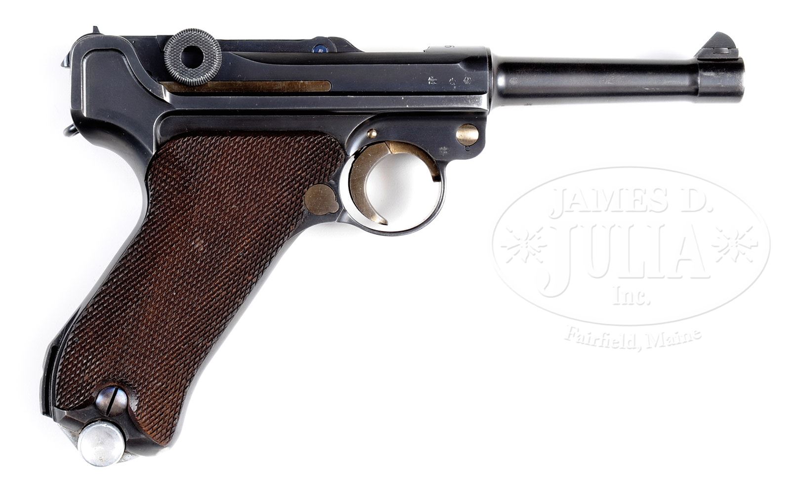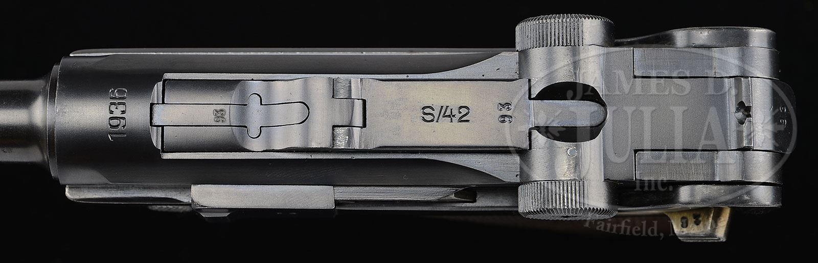 *BEAUTIFUL MAUSER 1936 S/42 LUGER RIG AS ISSUED WITH TWO MATCHING MAGS.SN 4193. Cal. 9mm. 4″ bbl with 4-digit SN on bottom and tiny Eagle/63 proof on upper left. “1936” date above chamber. “S/42” (code for Mauser manufacture) on center toggle link. 4-digit SN on left receiver. Eagle/63 proofs on right receiver. Full SN on front of frame. All numbered parts are matching down to firing pin and both orig Eagle/63 proofed aluminum bottom mags. Checkered walnut grips are unnumbered. In a “1939” dated dark brown Eagle/WaA101 proofed Stuttgart made holster. With proper Eagle/63 proofed takedown tool. PROVENANCE: Ed Johnston Estate Collection. CONDITION: Retains 97% bright blue and straw with normal wear on sharp edges and corners. Bright fire blue on small parts. Grips are lightly worn and oil soaked with wood grain still visible. Sharp mirror bore. Mags are excellent with little wear. Mechanics are excellent. Holster is very good with some flaking on lid and on mag pouch. Stitching retains orig color. Structure is solid. Takedown tool retains 70% blue and has light corrosion. 4-51415 BWS58 (3,500-6,000) – Lot 1132