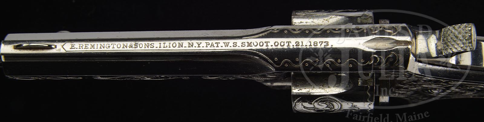 RARE ENGRAVED REMINGTON NO. 1 SMOOT SPUR TRIGGER REVOLVER.SN 1170. Cal. 30 RF Short. Nickel finish with 2-13/16″ ribbed oct bbl that has integral ejector housing and half moon front sight with 1-line address. Cylinder is fluted with five chambers. Mounted with 2-pc checkered hard rubber grips. Revolver is engraved, probably by L.D. Nimschke, with about 60-70% coverage foliate arabesque patterns with pearled background. Left side of ejector housing is engraved with a snake & dot pattern and both sides of top & bottom straps around cyl opening are engraved in leaf & vine patterns. Back strap is engraved with matching foliate arabesque patterns at top & bottom with snake & dot edge patterns. Cylinder is matching engraving on lands between the flutes with a snake pattern around the rear edge. There were about 2,300 of these little revolvers produced 1875-1877, with only a few engraved and of those very few survive with orig finish. These little revolvers were very popular with ladies as muff pistols, gentlemen as pocket pistols and gamblers. PROVENANCE: The Elliott Burka Estate Collection. CONDITION: Very fine to extremely fine. Overall retains 95-97% strong orig nickel with minor flaking losses and fine pitting around forcing cone area; cyl has minor flaking in the flutes and otherwise retains strong bright nickel. Grips are sound showing very light diamond point wear. Mechanics are fine, worn dark bore with rifling. 4-56449 JR166 (3,000-5,000) – Lot 1132
