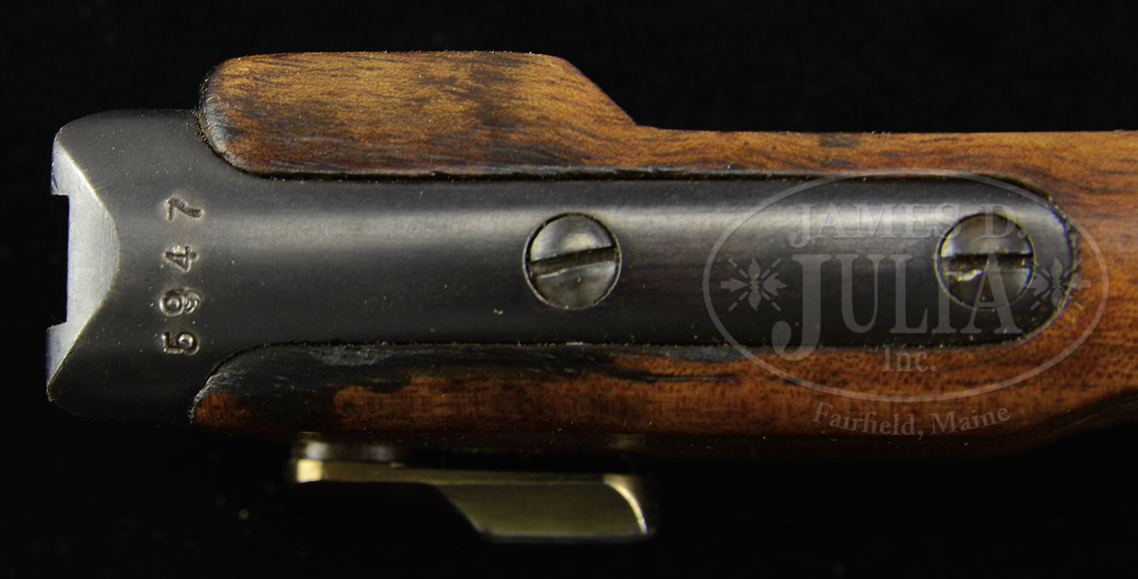 *GERMAN WWI ISSUE DWM 1917 ARTILLERY LUGER RIG.SN 5947d. Cal. 9mm. 8″ Artillery bbl, fine tune front sight with matching numbered sight blade. Fine tune adjustable rear sight with matching numbers. Full SN on bottom of bbl. “1917” date above chamber. DWM scroll on center toggle link. 4-digit SN on left receiver. Imperial proofs on right receiver. Full SN on front of frame. Numbered parts on gun are matching down to the firing pin, except for checkered walnut grips which do not match. Plain wood bottom mag. With proper Imperial proofed walnut Artillery stock that has been renumbered to match the gun. Brown “1916” dated Artillery holster by “ERNST SIEGEMUND/DRESDEN” with orig cleaning rod and proofed takedown tool. Double mag pouch by the same maker is dated “1915” and has two orig plain wood bottom mags inside. PROVENANCE: Ed Johnston Estate Collection. CONDITION: Retains 97% blue with normal wear on sharp edges and corners. Front grip strap has minor fading. 95% orig straw. Light wear on grips that retain orig color with visible wood grain. Bore is worn with light pitting. Mechanics are fine. Stock is in excellent condition with minor wear, retains 95% blue on lug and lever has been restrawed to near new. Very good holster with normal wear and cracking and flaking on strap. Cleaning rod is excellent, showing little signs of use. Takedown tool retains 85% blue. Extra mags are very good with very little wear on wood bottoms. Mag pouch is solid, retaining orig color and has some cracking and flaking on flap. 4-51414 BWS57 (3,500-5,500) – Lot 1133