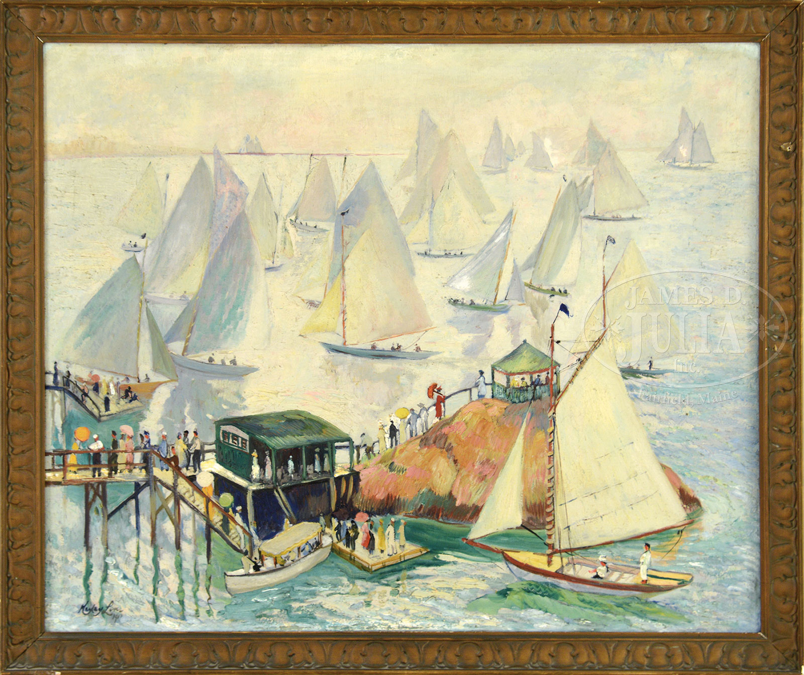 HAYLEY LEVER (American, 1876-1958) EASTERN YACHT CLUB REGATTA, MARBLEHEAD, MASS.Oil on canvas Housed in a molded wood frame Signed and dated lower left “Hayley Lever 1917″, bears fragments of a Worcester Art Museum label and an exhibition label from the Daniel Gallery, New York SIZE: 30″ x 36″. Overall: 33-1/2″ x 40”. CONDITION: Craquelure throughout sky, restoration in several areas mostly along bottom and in center, surface grime. 52097-1 (20,000-30,000) – Lot 1133