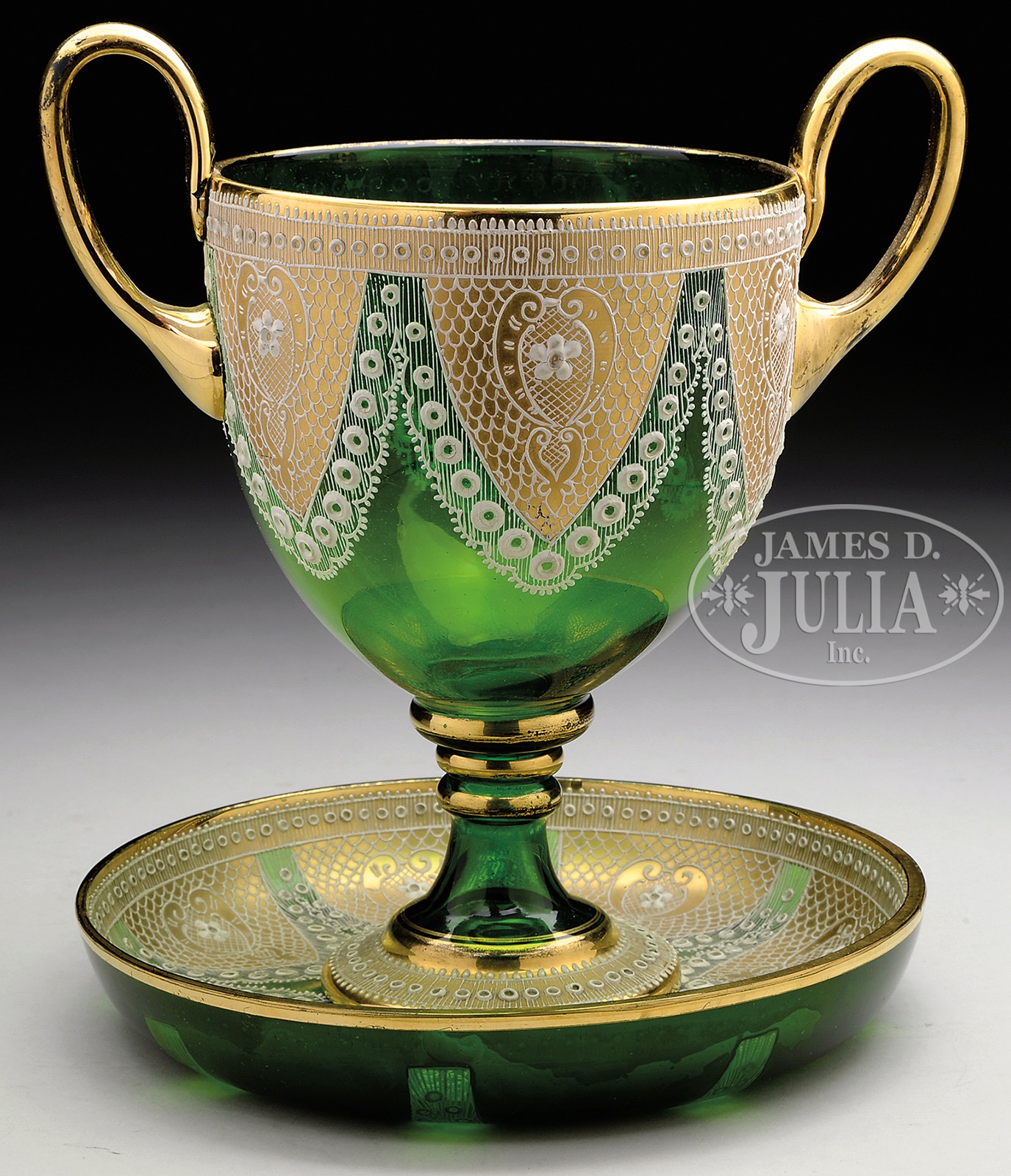 MOSER DOILY-WORK LOVING CUP AND BOWL.Outstanding Moser loving cup and bowl are decorated with gilded panels overlaid with white enamel lace decoration resembling doilies. The decoration is set against a green glass background and the loving cup is finished with two gilded and applied handles. These pieces are pictured in the book Moser Glass: The George Klabin Collection by Gary D. Baldwin, pg. 81, plate 99. Unsigned. SIZE: Loving cup: 9-1/4″ t to top of handle. Bowl: 8-1/4″ dia. PROVENANCE: George Klabin Collection. CONDITION: Very good to excellent, with some minor wear to gilding on the lip. 5-67254 (800-1,200) – Lot 1134