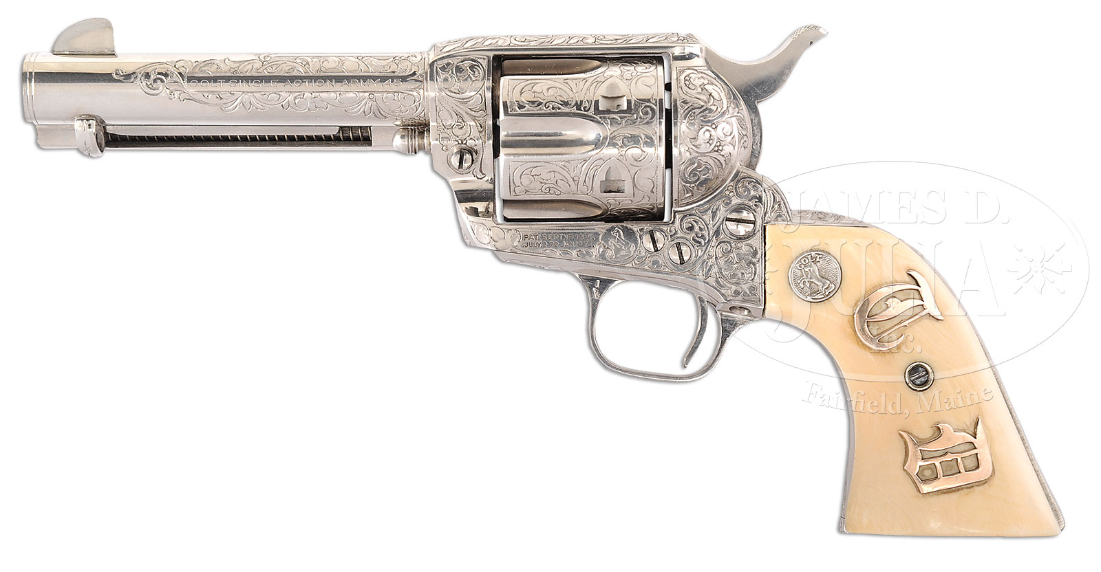 *MINTY WILBUR GLAHN FACTORY ENGRAVED COLT SINGLE ACTION ARMY REVOLVER WITH TEXAS HISTORY SHIPPED TO WOLF & KLAR, FORT WORTH, TEXAS WITH GOLD MOUNTED CARVED IVORY GRIPS.SN 353118. Cal. 45. Nickel finish with 4-3/4″ bbl, full thick front sight, 2-line address and “COLT SINGLE ACTION ARMY 45” on left side. Left side of frame has 2-line, 3-patent dates and rampant Colt in a circle. Mounted with spectacular 2-pc ivory grips with a raised carved ox head on right side. Revolver is engraved by master engraver Wilbur Glahn in his deluxe full coverage flowing foliate arabesque patterns with extremely fine punch dot background. Top of back strap, top of back strap ears & corresponding area of frame are engraved in Mr. Glahn’s trademark “V” patterns. Back strap is full coverage engraved in tulip patterns with acanthus leaf patterns on butt strap & foliate arabesque patterns on trigger guard. Foliate arabesque patterns extend 3/4 of the way up each side of bbl with a snake & dash pattern in ejector rod housing gullet and foliate arabesque patterns on outer radius. Ejector rod housing boss on frame is engraved with a large flower blossom. Cyl has full coverage foliate arabesque pattern engraving around the outer diameter, strikingly offset by the bright nickel flutes. SN was observed in the usual place on bottom of frame and on right sides of front & back straps under grip. Last two digits of SN are found on rear face of cylinder. Accompanied by a Colt factory letter fully identifying this revolver, as found, in caliber 45 Colt, 4-3/4″ bbl, nickel finish, rubber stocks, factory engraved in Class “C” coverage, shipped to “Loan Account” Wolf & Klar, Fort Worth, TX on July 15, 1929 to Account #16671/1 in a 1-gun shipment. Under remarks section it states that “This revolver was purchased by Wolf & Klar on Jan. 16, 1931.” The first time this gun came to auction and sold at a California auction house in 2006, revolver was described as showing “beautiful raised relief carved medallion ivory grips with Wolf & Klar accents to the carving consisting of gold steerhorns, nose ring and ruby eyes inset in the right grip; large gold medallions which appear to be “TD” on the left grip. Wolf & Klar were one of the bigger dealers in Colt firearms at this period of time, and this pistol was loaned as a display piece by Colt. The quality of the engraving is excellent and is one of the finest examples of Wilbur Glahn’s work. The initials on the left grip purportedly belong to a Texas oilman who was a regular customer of Wolf & Klar and purchased very ornate Colts and S&Ws of which several are known to old-time collectors. This pistol recently surfaced in Arizona in the hands of an elderly gentleman whose father obtained it in a trade for a horse, along with its fancy tooled S.D. Myers, El Paso marked holster in the 1930’s. One of the best unknown Single Actions to surface in a decade”. Since this gun was sent to Wolf & Klar’s on account in 1929, gold mounted carved grips appear orig from this date and similar are seen on several other special guns in the Wilbur Glahn era. See SN 341995, pgs 564-565 of The Colt Engraving Book – Volume One, R. L. Wilson. Also, of note, is SN 353113, only five SNs different from this gun is also a grade “C” Wilbur Glahn revolver shipped in 1930 with carved ivory steer head grips. This is indeed a stunning Single Action. PROVENANCE: Ex-David Crocker Estate Collection. Special Note: This item(s) contains plant or animal properties that may be covered by the Endangered Species Act (ESA). We have taken care to ensure that this item(s) meets the standard for sale under the ESA. However, certain states and other countries have laws that are more restrictive than the ESA. It is the bidder’s responsibility to ensure that it is lawful to purchase or transport this item(s) into their state, and to obtain the necessary import and export approvals. Delay or failure to obtain any such permit or approval does not relieve the buyer of paying for the item(s) and consummating the purchase. CONDITION: Extremely fine, all matching including cylinder, grips are unnumbered. Has been fired, but very little and retains virtually all of its fine orig factory nickel with possible re-polishing and touch-up on front & back straps which is not detectable. “Elephant ivory” grips are also extremely fine, fit well with good patina. Mechanics are crisp, brilliant shiny bore. 50412-32 (30,000-50,000) C&R; ESA – Lot 1136 | Click here to view provenance