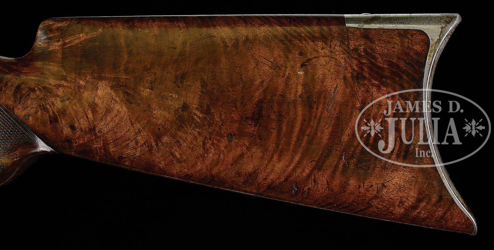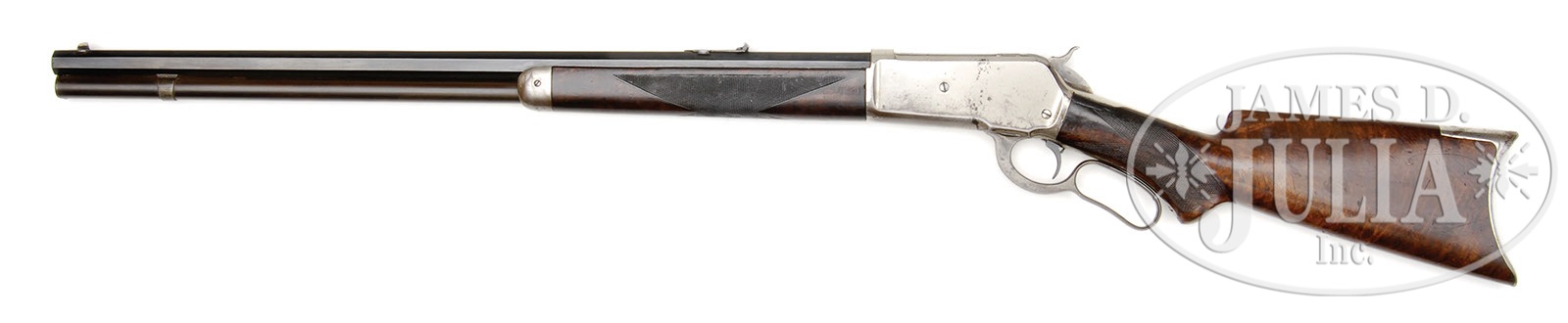 SPECIAL ORDER DELUXE WINCHESTER MODEL 1886 LEVER ACTION RIFLE.SN 10451. Cal. 40-82. Rare special order ’86 with 26″ oct bbl, full magazine, half nickel front sight with screw and a 3-leaf platinum line express rear sight. Top flat of the bbl is full length matted with the 2-line bbl address rolled through the matting. Caliber marking is on top left flat over chamber area to accommodate the matted top flat. Mounted with very nicely figured, 2-3X, burl & flame grain American walnut with H-style checkered forearm and black insert serpentine grip buttstock and crescent buttplate. Receiver has sgl set trigger. Left side of lower tang, under the wood is marked with assembly number “1125” and “XX”. Matching assembly number is also found in top tang channel of the buttstock and inside toe of buttplate. Receiver, forend cap & buttplate are all nickel plated. Accompanied by a Cody Firearms Museum letter identifying this rifle in caliber 40-82 with matted oct bbl, set trigger, checkered pistol grip stock with Lyman sights and “nickel trims”, received in warehouse Nov. 12, 1887 and shipped same day. Such early ’86s with special plated finishes are extremely rare and were likely ordered as a gift to an important person or for use by a trick shooter or a Wild West show man. CONDITION: Fine. Bbl & magazine tube retain about all of a professionally restored finish with magazine tube turning a little plummy; receiver retains about 85% strong orig nickel with some light spotting on the left side and showing wear on the bottom; lever & hammer retain faded case colors turned brown on outer faces of the lever; forend cap retains about 60% orig nickel and the buttplate about 70%. Bolt may have been refinished. Stock has a repaired sliver at the top left side of the wrist, otherwise wood is sound with nicks, dings & scratches showing moderate wear and retains most of an old restored finish. Mechanics are fine, strong bright bore with fine pitting. 4-41531 JR488 (9,000-12,000) – Lot 1137