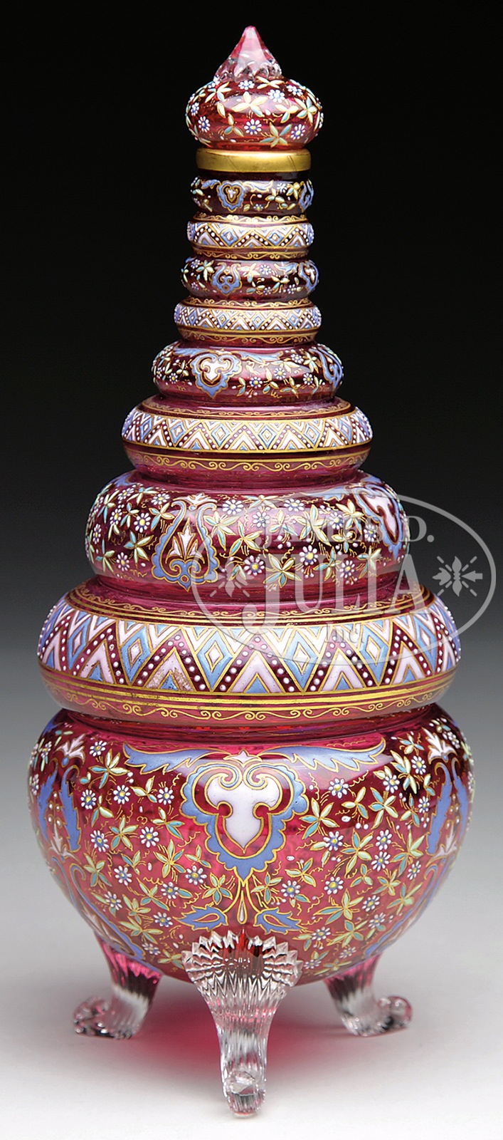 MOSER DECORATED DECANTER.Moser decanter shows strong Islamic influence with stepped shape. The decanter is colorfully enameled with alternating floral and geometric panels against a cranberry glass background. The decanter is supported by three applied reeded feet and is finished with a matching enameled stopper. Decanter is pictured in the book Moser Glass: The Klabin Collection by Gary D. Baldwin, pg. 73, plate 87. SIZE: 10-1/2″ t. PROVENANCE: George Klabin Collection. CONDITION: Very good to excellent. 5-67457 (500-700) – Lot 1137