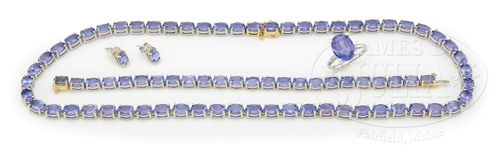 TANZANITE SUITE.Comprised of a necklace, bracelet, earrings and ring. 1) Necklace is comprised of fifty-seven natural oval tanzanites with a total weight of 54.47cttw in sterling silver four prong basket mounts with a 14kt yellow gold clasp. Stamped “14K 925 54.47CT” and is accompanied by EGL USA Gemstone Analysis Report #US 310835004C. 2) Bracelet is of similar design to necklace and is comprised of twenty-six oval tanzanites with a total weight of 22.59cttw in sterling silver four prong basket mounts with a 14kt yellow gold clasp. Stamped “14K 925 22.59CT” and is accompanied by EGL USA Gemstone Analysis Report # US 310561901C. 3) Earrings are oval tanzanite studs in sterling silver four prong basket mount with post backs. 4) Oval 6.06ct solitaire tanzanite ring in a four prong 18kt white gold basket mounting. SIZE: Ring is 8-1/4. CONDITION: Diamond International/Tanzanite International Appraisals accompany the necklace, bracelet and ring. All pieces are very good to excellent. 50485-1 (12,000-16,000) – Lot 1138 Click here to view appraisal