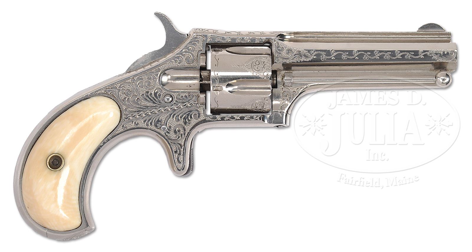 SCARCE ENGRAVED REMINGTON SMOOT NO. 2 SPUR TRIGGER REVOLVER.SN 285. Cal. 32 RF Short. Nickel finish with 2-3/4″ oct bbl that is integral to the upper frame & ejector housing. Cylinder is fluted with five chambers and revolver is mounted with smooth 2-pc birdhead certifiable antique ivory grips. Revolver is beautifully engraved in New York style with about 75% coverage foliate arabesque patterns that has fine pearled background. Top strap & side flats of the bbl are engraved in vine patterns with very fine foliate arabesque patterns on the back strap and toe of the grip frame. Cylinder has matching engraving on lands between the flutes and has a fine leaf & vine pattern around the rear edge. According to Flayderman’s Guide to Antique American Firearms there were only about 1,400 of these revolvers produced in the time frame 1877-1885. Very few were engraved and of those few survive today. These little revolvers were in great demand for their small size and ease of concealability for ladies as muff pistols and gentlemen for pocket pistols. Special Note: This item contains or is made of ivory. Do not bid on this lot unless you have read and agreed to our“Ivory Position Statement”and the “Waiver of Legal and Financial Risk to James D. Julia in regards to your Purchase of an Ivory Object”. This information is located in our catalog on pages 30 and 31. PROVENANCE: The Elliott Burka Estate Collection. CONDITION: Extremely fine plus. Overall retains 99%+ crisp orig nickel finish. Grips are equally fine. Mechanics are crisp, strong bright bore with a few scattered spots of pitting. It would be difficult to improve on this piece. 4-56356 JR132 (3,000-5,000) – Lot 1139