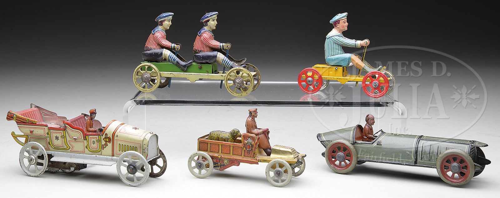 FIVE AUTOMOTIVE PENNY TOYS.Nice select grouping of unusual penny toys. A wonderful pair of Irish mail – both a single (Meier) & a double (probably Kellermann?), a unique elongated race car #4, truck with open bed containing a sheep manufactured by Meier, and a large fanciful limousine with windup motor manufactured by Fischer. Overall a great & desirable lot. Penny toys are in very good plus to fine condition, slightly heavier wear to wheels on double Irish mail, and some very light scuffing to grey body of race car. A light cleaning would remove years of dust on a few of these & bring back the original litho lustre. SIZE: Varies from 3-1/4″ to 5″ l. PROVENANCE: The Estate of Carol and Jerry Soling. CONDITION: Overall as stated above. 1-14761 (750-950) – Lot 1139 Auction: Advertising, Toy & Doll Auction - Fall 2014 Please Note: All prices include the hammer price plus the buyer’s premium, which is paid by the buyer as part of the purchase price. The prices noted here after the auction are considered unofficial and do not become official until after the 46th day. |