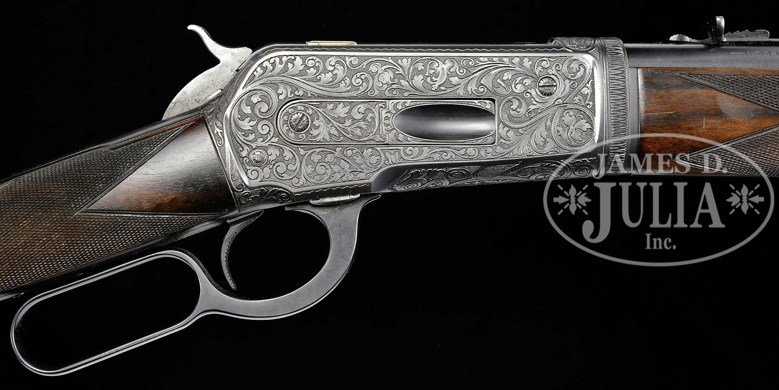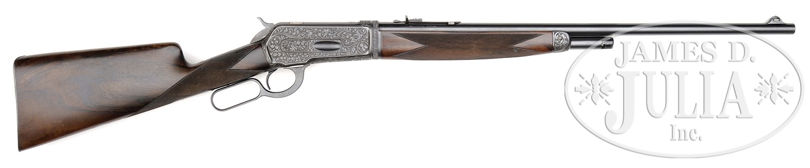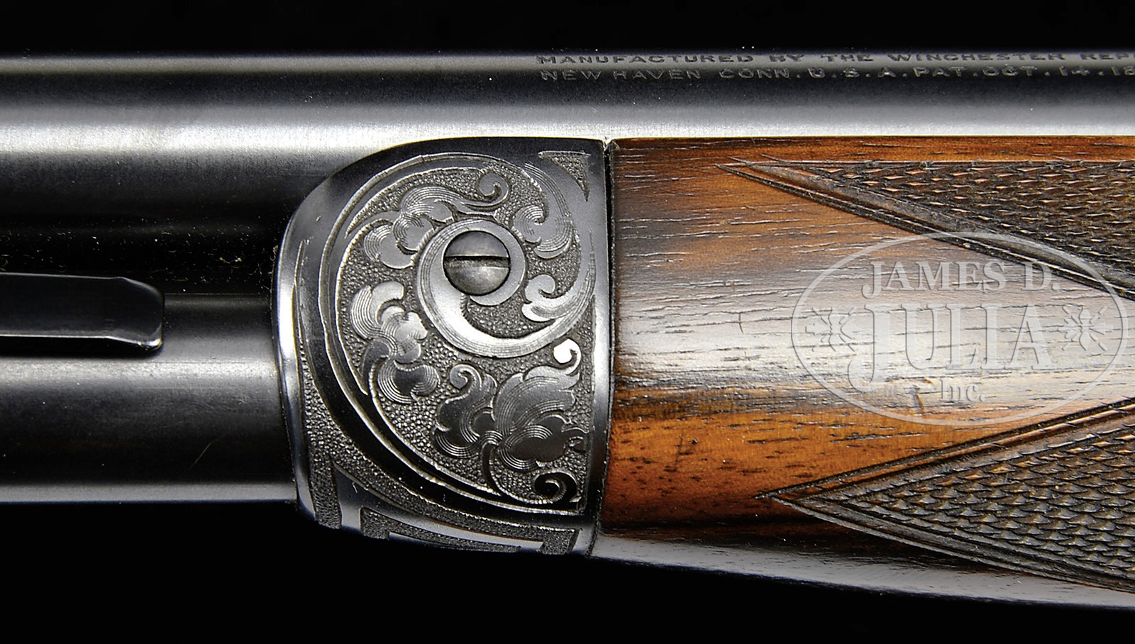 *CUSTOM ENGRAVED LIGHTWEIGHT WINCHESTER MODEL 1886 TAKEDOWN LEVER ACTION RIFLE.SN 159012. Cal. 33 WCF. Fine custom rifle, probably by Griffin & Howe, with 24″ lightweight tapered rnd bbl, half magazine, takedown, with Lyman ivory bead hunting front sight on pedestal and flat top rear sight. Mounted with exceptional, custom French walnut with widely checkered semi-beavertail forearm and straight stock with deep shadow cheekpiece and steel buttplate with trap. Receiver, forend cap & takedown ring are beautifully deep engraved with full coverage foliate arabesque patterns that have a fine shaded background. Takedown ring is engraved in scallop patterns. Buttplate is also engraved to match at the heel & toe with full hand checkered face. Trigger is also hand checkered and screws are nicely engraved. Bottom of the stock has an empty silver initial plate. PROVENANCE: Robert H. Haskell, III Estate Collection. CONDITION: Very fine. Overall retains about 99% beautiful custom finish to both metal & wood. Stock has a couple of minor nicks, otherwise retains its beautiful oil finish. Mechanics are crisp, bright shiny bore. 4-50281 (8,000-12,000) – Lot 1140