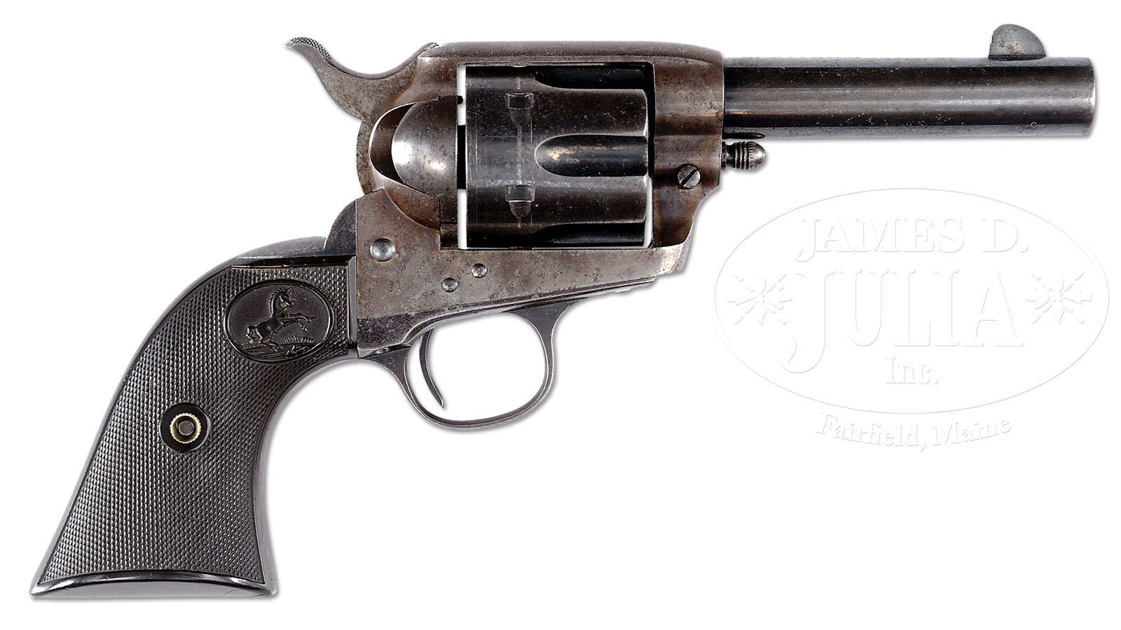 *RARE COLT SINGLE ACTION ARMY SHERIFF’S MODEL WITH TEXAS HISTORY.SN 305412. Cal 45. This fine Colt Single Action Army has factory letter stating its rare configuration as Sheriff’s Model. Shipped September 28, 1910 to H. L. Dyer (address not listed), though sold to Hibbard, Spencer Bartlett Co, Chicago. Cal is listed as 45 with 4″ bbl, blue finish. H. L. Dyer was a hardware dealer in Richmond, Ft. Bend County, TX. Gun appears fine and “as found”. All orig with matching SNs found on frame, trigger guard and backstrap. Last 4 digits of SN are also found inside each of the orig hard rubber Colt medallion grips. This is a rare found fine example of a Colt Single Action Sheriff’s Model with factory letter. PROVENANCE: Ex-Bruce Bartlett. CONDITION: Fine overall. Bbl and cyl retain 40-50% thinning bright blue finish. Backstrap and trigger guard retain about 20% thinning blue finish. Traces of case color are found on frame and hammer, thought mostly grey with pinprick pitting on right side. Grips are in fine matching condition, well fit with left side losing some of its color to a dark olive/brown. Mechanically gun functions well with crisp bright bore and cyl chambers which still retain blue finish. 50412-31 (20,000-40,000) C&R – Lot 1140 Click here to view provenance