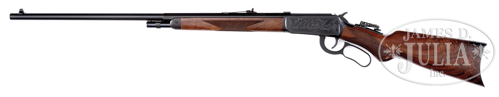 *U.S. REPEATING ARMS CO. MODEL 1894 DELUXE FACTORY ENGRAVED CENTENNIAL RIFLE.SN CN07530. Cal. 30-30. 26″ half oct half rnd bbl. Half magazine. Brass beaded front sight, adjustable rear sight, and adjustable tang sight. Receiver is engraved on both sides with a vignette of a running deer on left side and a vignette of a standing deer of right side. Both are surrounded by decorative scroll work with border. Stocks are highly figured checkered walnut with pistol grip and crescent buttplate. With original box. CONDITION: Very fine to excellent overall. Bbl and receiver retain 99% of orig blue finish with only slightest high point wear. Bore is bit frosty with very strong rifling. Engraving is of Winchester style and well executed. Stocks are excellent with only minor handling marks. Checkering is sharp and crisp. Pistol grip cap is excellent. Crescent buttplate retains 99% of orig blue with only high point wear on toe. A very nice rifle that was made by the U.S. Repeating Arms Co. to commemorate the 100th year anniversary of the Winchester Model 1894 rifle. 49971-75 TEP (750-1,250) – Lot 1142