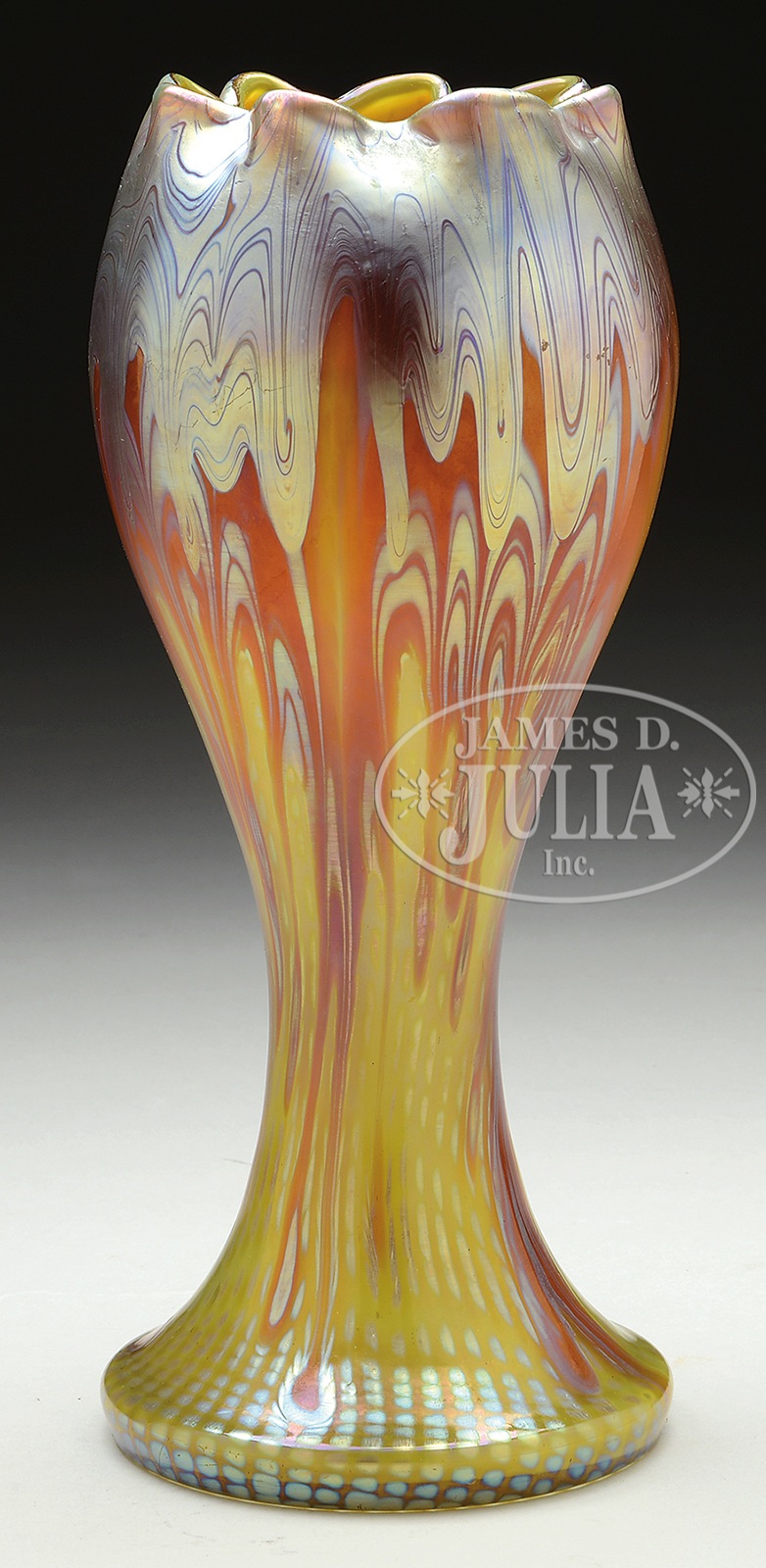 LOETZ PHAENOMEN VASE.Large Loetz vase in the rare PG/691 genre is decorated with platinum iridescent drag loop descending from the ruffled lip giving way to a rust colored pattern of drips descending towards the foot with random lines in areas of platinum iridescence. Decoration is completed with a platinum iridescent zipper design ascending from the foot all against a yellow background. This is an exhibition quality decor attributed to Franz Hofstoetter 1900. Signed in the polished pontil “Loetz Austria”. SIZE: 12″ t. PROVENANCE: Dr. Mark Jackson Collection. CONDITION: Very good to excellent. 49863-5 (3,000-5,000) – Lot 1143