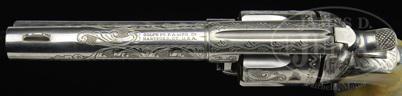 *ENGRAVED COLT BISLEY SINGLE ACTION REVOLVER WITH BELT AND HOLSTER.SN 193124. Cal 38 WCF (38-40). Nickel finish with 4-3/4″ bbl, full front sight and 2 line address, marked on left side “(BISLEY MODEL) 38 W.C.F.”. Left side of frame has 2 line 3 Patent dates and Rampant Colt in a circle. Mounted with 2-pc pearl grips with raised carved spread-winged eagle on left side. Engraving appears to be factory from the Cuno Helfricht shop. Engraving consists of about C coverage foliate arabesque patterns with pearled background and Mr. Helfricht’s trademark sunbursts on the recoil shield & loading gate. Top of the backstrap, around the hammer slot is engraved in his trademark fan pattern with geometric patterns down the backstrap, on the buttstrap & trigger bow. Matching patterns to the frame extend up both sides of the bbl and around the address. Top strap has leaf & vine patterns with a snake pattern in top gullet of ejector housing. Cylinder is engraved with Mr. Helfricht’s trademark alternating patterns on the lands between the flutes. Accompanied by a Colt Factory letter which identifies this revolver in caliber 44 with 4-3/4″ bbl, nickel finish, type of stocks not listed, factory engraved and shipped to Hibbard, Spencer, Bartlett & Co. Chicago, IL February 22, 1900 in a one gun shipment. Also accompanied by an unmarked money/cartridge belt that is 34″ with a replaced tongue billet which has extended the length by about 3″. Belt is made of 2 pieces of fine russet brown leather, 2-5/8″ wide with tooled patterns and 41 sewn-on cartridge loops, Buckle billet is originally sewn on with a single rivet with a brass D-ring buckle. The belt is mounted with a fine, fully tooled double loop, left hand holster marked on the inside of the skirt “T.W. MCDONALD / LEAD, SO. DAK.”. This rare rig being left-handed with a left hand pearl grip leads one to believe that it is an orig set. According to Colt Peacemaker Encyclopedia, Cochran there were fewer than 60 Bisley revolvers factory engraved of which, at the time of the printing only 54 were known. CONDITION: Fine. Overall retains about 98-99% restored nickel finish with only slight muzzle edge wear on the left side and tip of the ejector housing. There is a small area of pitting under the finish on the cylinder. Grip has a small chip at the frame on the left side and a couple other tiny chips, otherwise is sound showing great fire & color. Mechanics are crisp, strong, sharp bore with fine pitting. Belt has a somewhat crackled surface with one broken cartridge loop. Holster shows moderate to heavy wear on the loops & toe and shows a somewhat worn dark patina. Altogether a fine rig. 51619-2 JRL (15,000-25,000) C&R – Lot 1143 Click here to view provenance