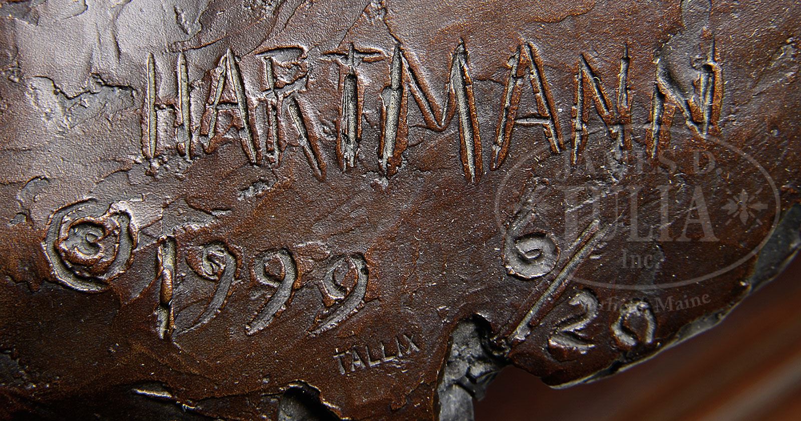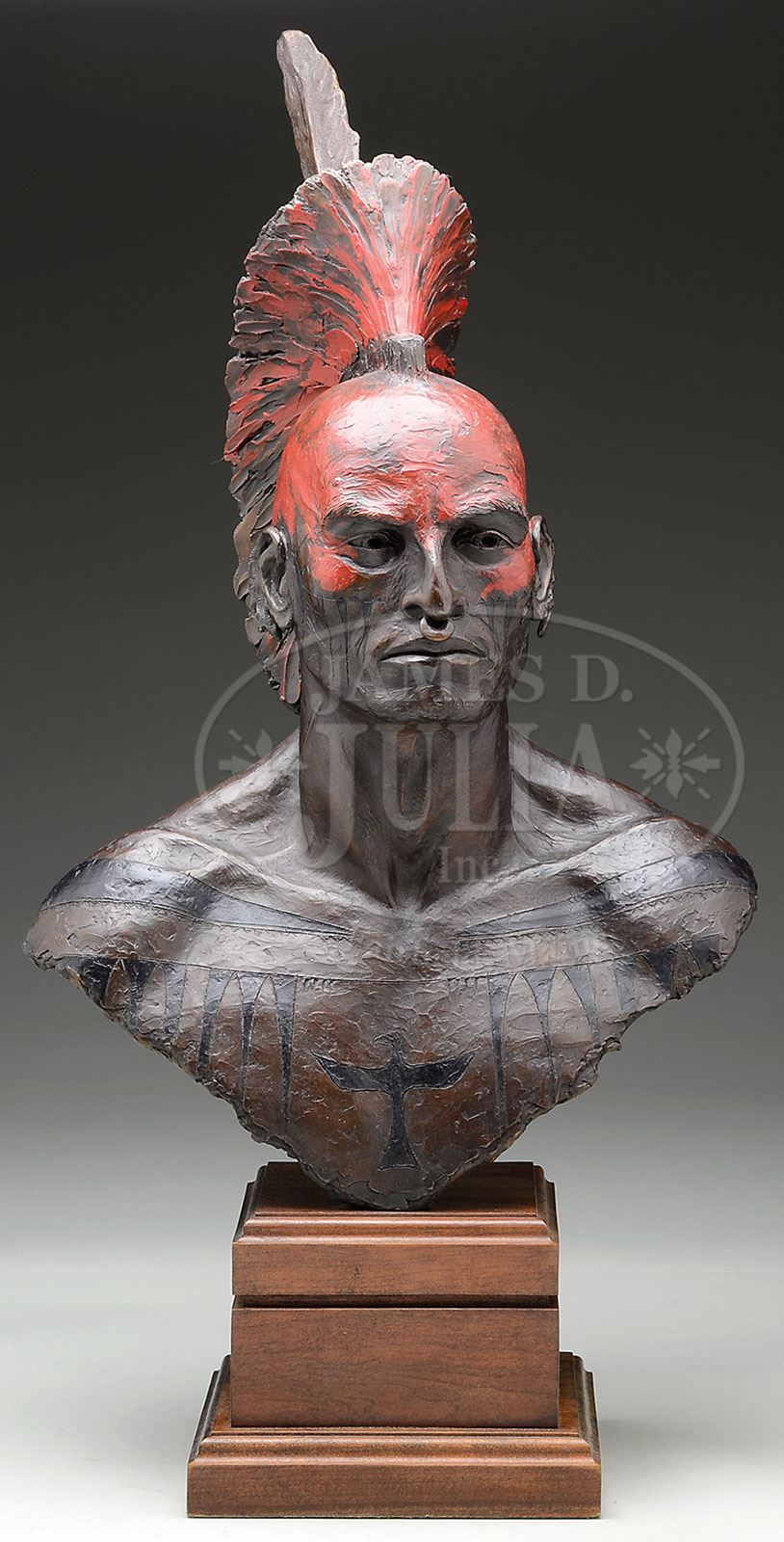 JUD HARTMANN (American, 1948-) WARRIOR BRAVE. Bronze Mounted to a wood stepped plinth Signed on shoulder “Hartman 6/20 TALLIX 1999″ SIZE: Bronze: 27″ h x 17″ w x 10-1/2″ d. Plinth: 6-3/4″ h x 9” sq. CONDITION: Very good 9-91737 (1,000-2,000)