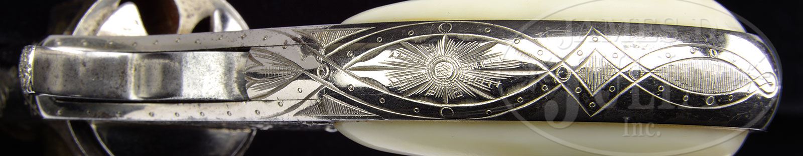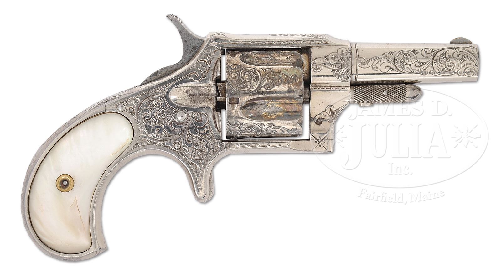 RARE ENGRAVED REMINGTON NEW MODEL NO. 4 SPUR TRIGGER REVOLVER.SN 1578. Cal. 41 RF Short. Nickel finish with 2-1/2″ rnd bbl that has half moon front sight and 1-line address. Mounted with smooth 2-pc pearl grips. Revolver is beautifully engraved by L.D. Nimschke with about 75-80% coverage foliate arabesque patterns on the frame which extend full length on each side of the bbl. Entire back strap & butt of grip frame are engraved in geometric patterns with a Nimschke trademark sunburst about center of the back strap. Cylinder is silver finished and engraved to match on lands between the flutes. There were about 23,000 of these revolvers produced 1877-1888 with the majority in caliber 38 RF. Only about 5,000 of them were in caliber 41. Of that small number very few were engraved and of those extremely few are known today. Frame screw on bottom front is battered. PROVENANCE: The Elliott Burka Estate Collection. CONDITION: Extremely fine, all matching including cylinder; grips are unnumbered. Overall retains about 99% strong orig nickel on bbl & frame and about 95% orig silver on cylinder. Left grip has a small chip and right grip a small scratch, otherwise they are sound with great fire & brilliant colors. Mechanics are fine, strong bright bore with scattered pitting. 4-56362 JR165 (3,500-5,000) – Lot 1144
