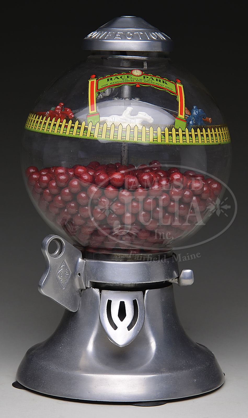 DERBY CONFECTION 1¢ VENDOR.Manufactured by Electro-Serve Inc. in Peoria, Illinois, this classic horse race gumball vending machine appears to be in very fine original condition. Polished aluminum base and ball gum cap, maker’s tag riveted to rear of base, and original race park decal within globe. When penny is deposited and lever activated ball gum would drop into shoot and horses would race around the track. Obviously the intent was to occasionally gamble but the decal indicates that this is strictly forbidden..hahaha. A nice solid all-original machine with a horse race gambling motif. SIZE: Approx 14-1/2″ t. PROVENANCE: The Estate of Carol and Jerry Soling. CONDITION: As described above. 1-14639 (800-1,200) – Lot 1144 Auction: Advertising, Toy & Doll Auction - Fall 2014 Please Note: All prices include the hammer price plus the buyer’s premium, which is paid by the buyer as part of the purchase price. The prices noted here after the auction are considered unofficial and do not become official until after the 46th day. |
