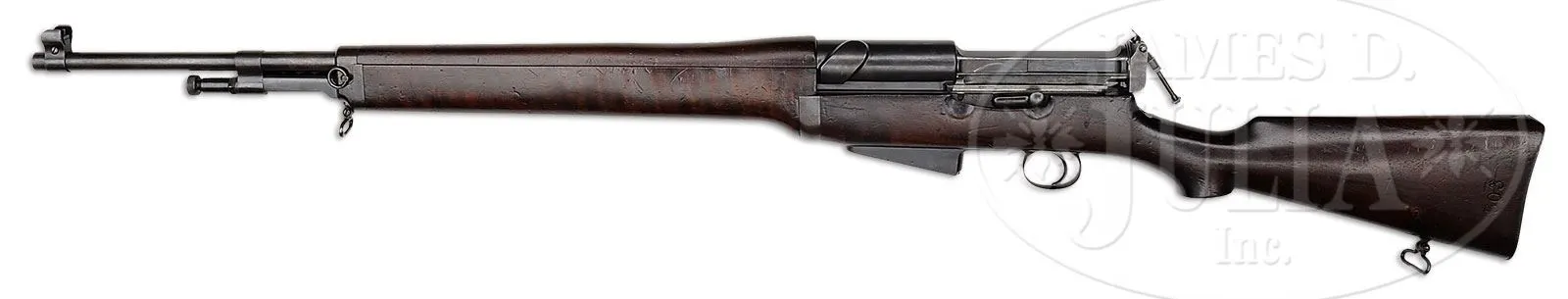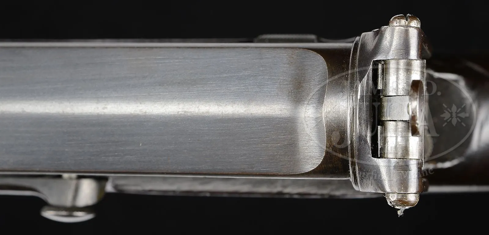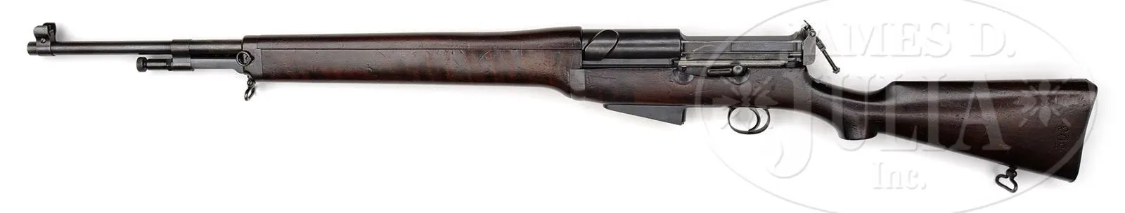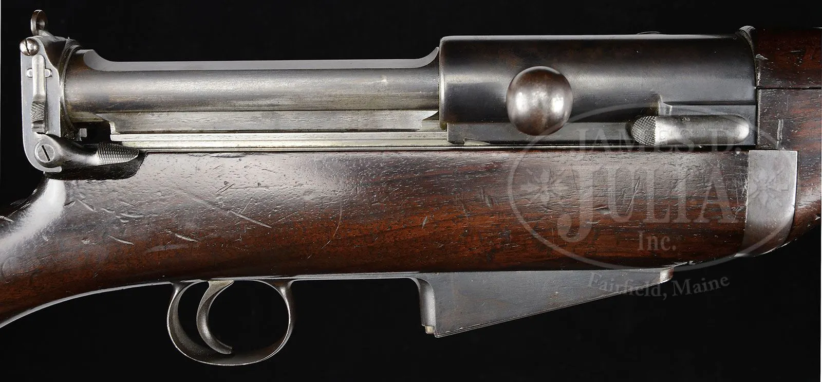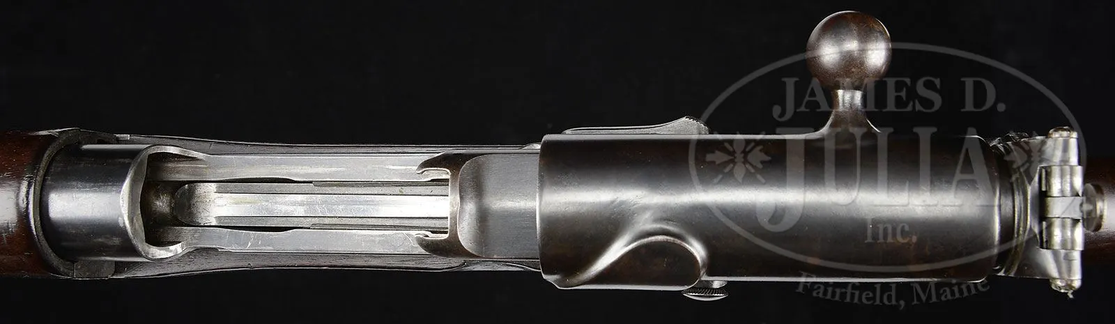 *◊ EXCEPTIONALLY RARE FARQUHAR-HILL SELF-LOADING SPORTING RIFLE.SN 5. Cal. .303 British. Exceptional Farquhar-Hill Self loading Rifle, chambered in .303, designed by Moubray Farquhar and Arthur Hill. The Farquhar-Hill was one of the first self-loading rifles developed just after the turn of the last century. The design evolved from a long recoil operated automatic aimed at British Army acceptance, with a barrel that recoiled back and forth and utilized a rotary locking bolt. However, early examples were overly complicated and not accepted. Farquhar and Hill then modified the concept ca. 1911 into what is now thought of as a more familiar gas-operated system with a fixed barrel, which resulted in simpler and faster production and an increase in reliability and accuracy. The gas system did not act directly on the bolt carrier to open the action, but initially compressed an actuating spring that effected bolt opening giving a far less violent operation and recoil than might be expected, latches and other springs that were compressed by the piston motion completing the operating cycle. The concept was initially designed for rarely encountered “.303 Rimless” but this was unsuccessful and later examples were made for the standard .303 British. Trials were conducted in 1913, with limited production following later and several of these rifles are said to have been used by British aviators before the widespread fitting of machineguns on aircraft occurred. Then, in 1918 the British Army ordered the weapon into large-scale production, but the close of WW1 ultimately ended the effort. This example is a unique factory-made sporter version of the British Army trials rifle of 1913. The bayonet lug was omitted, it has a lightened stock with conventional sling swivels and is equipped with an intricate micrometer rear sight for precision shooting. The bolt handle is British proofed and the left stock is marked “303”, denoting caliber. Instead of the interchangeable 19 round drum magazine used by the Army trials rifles, this example has an integral 5 round box magazine. One of the very rarest of the early self loaders and only rarely encountered in the very finest collections. PROVENANCE: Ex-Visser Collection, Collection of Dr. Geoffrey Sturgess. CONDITION: Excellent overall, all correct and period, retaining 98% bluing. Fit and finish very fine. Stock is also excellent, with lustrous deep brown stain and just a few handling marks and scratches. Bore is bright with strong lands and grooves. Mechanically fine, with tight, crisp mechanism. 4-53220 DW5 (20,000-35,000) – Lot 1145