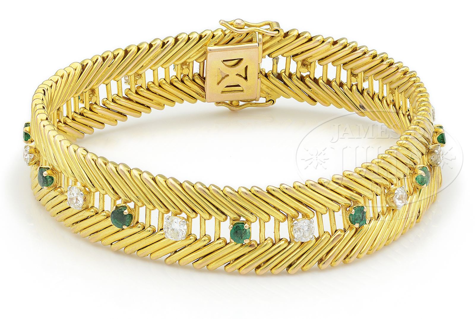 18KT GOLD DIAMOND & EMERALD BRACELET.Centered by an alternating pattern of prong set diamonds and emeralds within a slant link double row gold bracelet. Tongue and groove clasp with two safety latches. Bracelet tests 18kt, tongue is stamped “585”. SIZE: 7″ l. CONDITION: Very good to excellent. 50468-10 (1,500-2,000) – Lot 1147