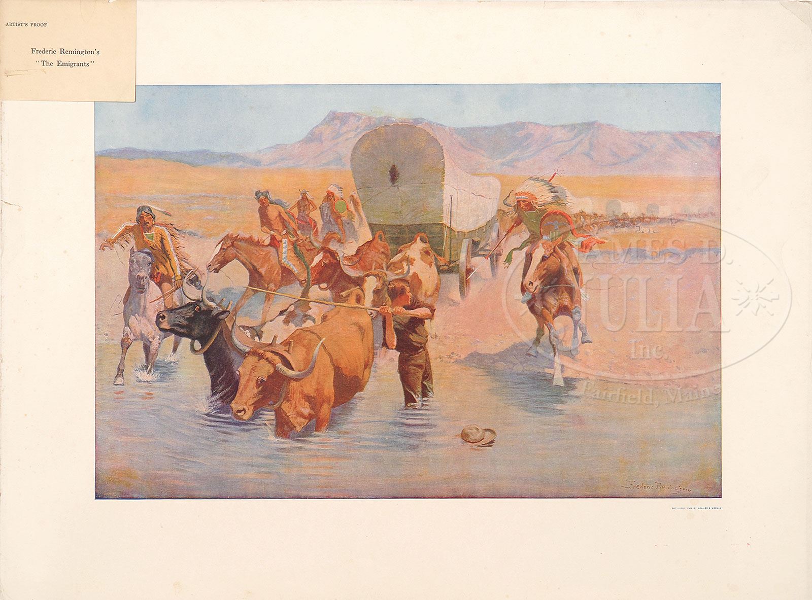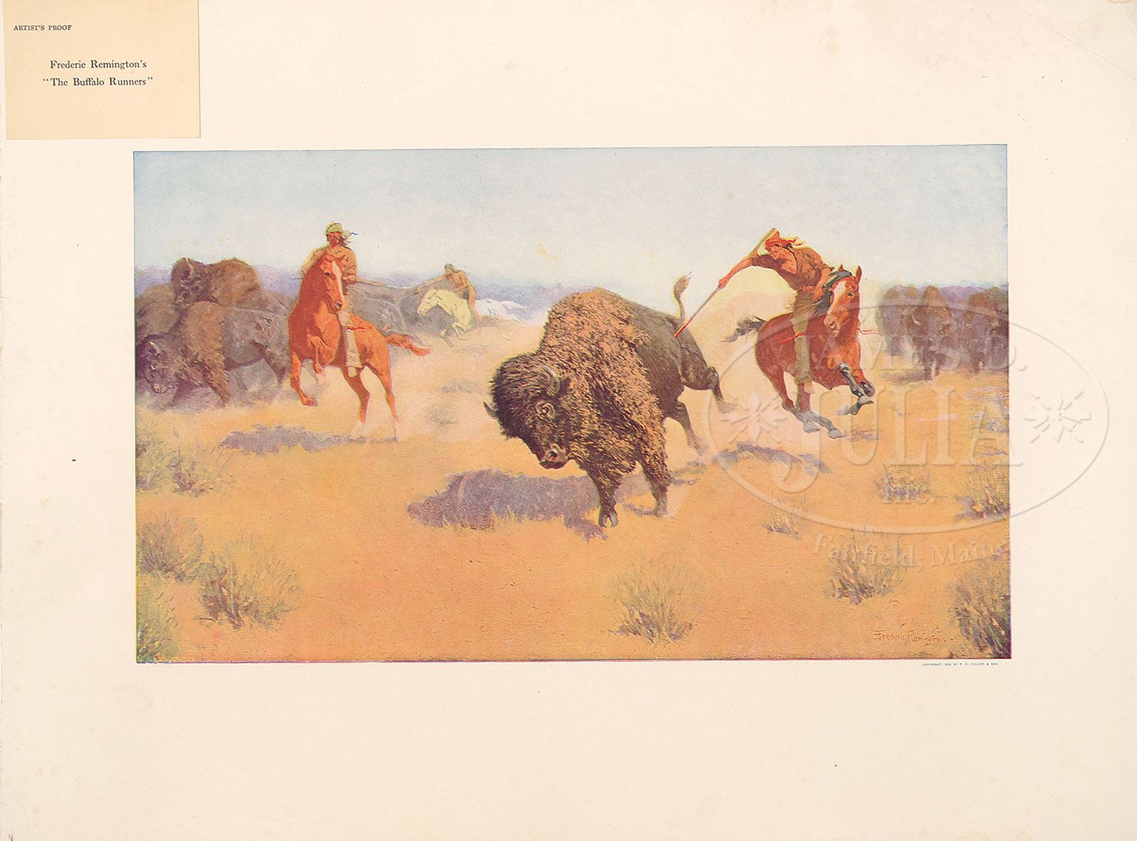 FREDERIC SACKRIDER REMINGTON (American, 1861-1909) FOUR ARTIST PROOFS FROM THE PORTFOLIO OF “SIX REMINGTON PAINTINGS IN COLOR”. Chromolithograph Housed in its original portfolio cover Three having original title labels “The Emigrants”; “The Buffalo Runners” & “The Bell Mare”; the other without label “An Argument with the Town Marshall” Published by P.F. Collier & Son SIZE: 17-1/2″ x 23-1/2″. Portfolio: 18-1/4″ x 24″ CONDITION: Images are very good, edges show wear, one with margin tears 9-90257 (800-1,200)
