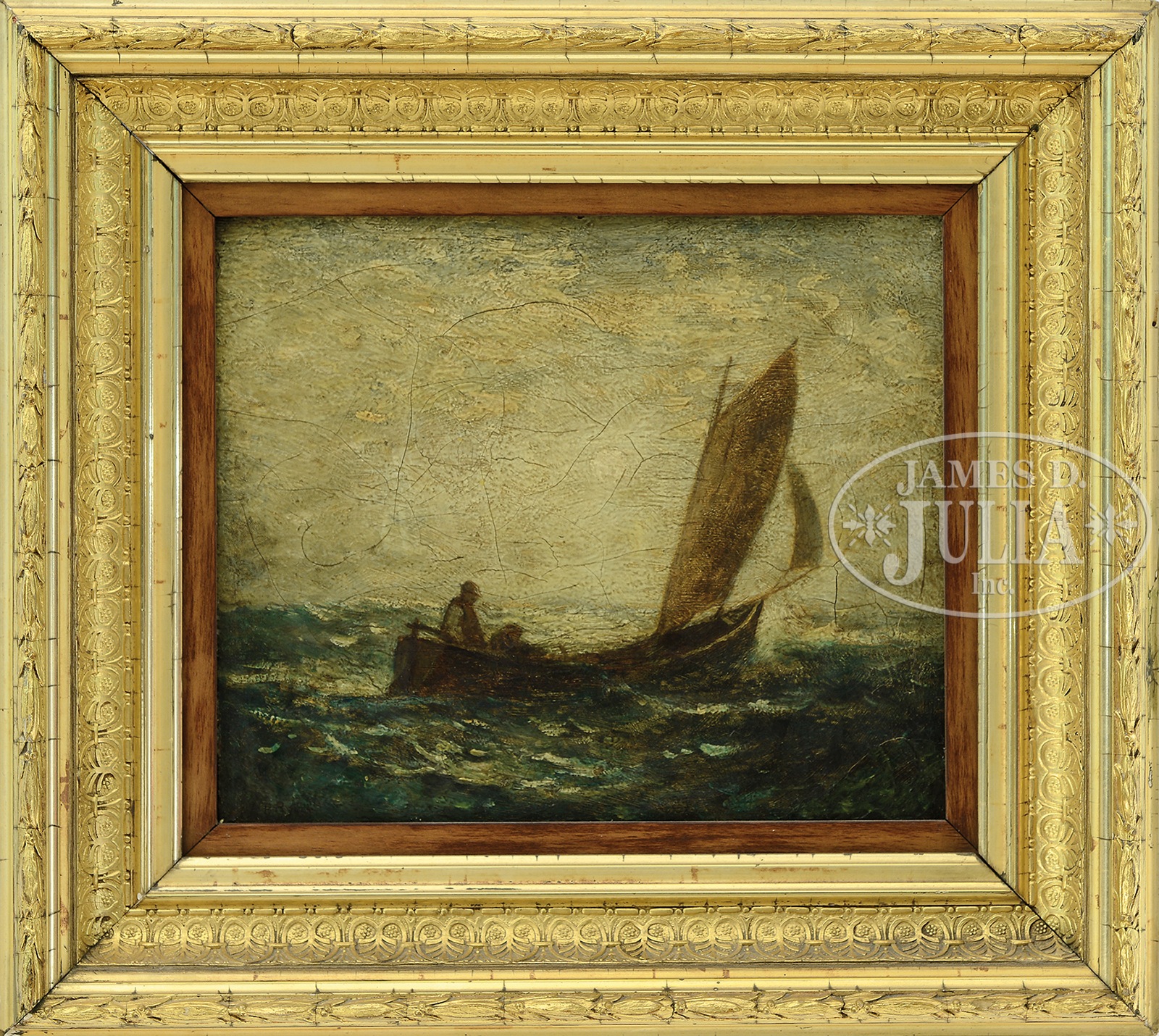 ALBERT PINKHAM RYDER (American, 1847-1917) “TOILERS OF THE SEA”.Oil on canvas Housed in a period gilt wood frame Signed lower left “A P Ryder” SIZE: 10″ x 12″. Overall: 16-1/2″ x 18-1/2″ PROVENANCE: Estate of Elissa Nassy New York city, New York CONDITION: Yellowed varnish, large craquelure, surface grime 49111-2 (10,000-20,000) – Lot 1148