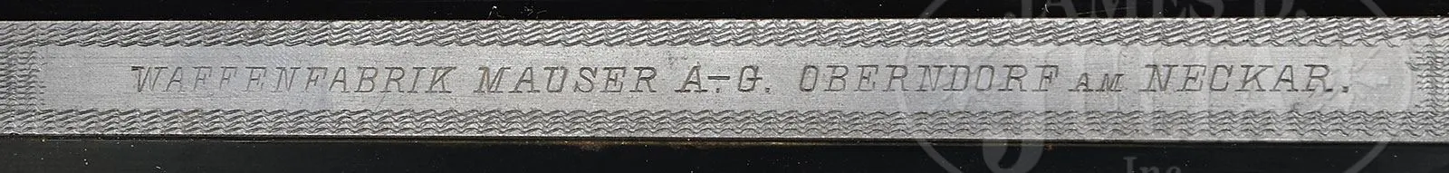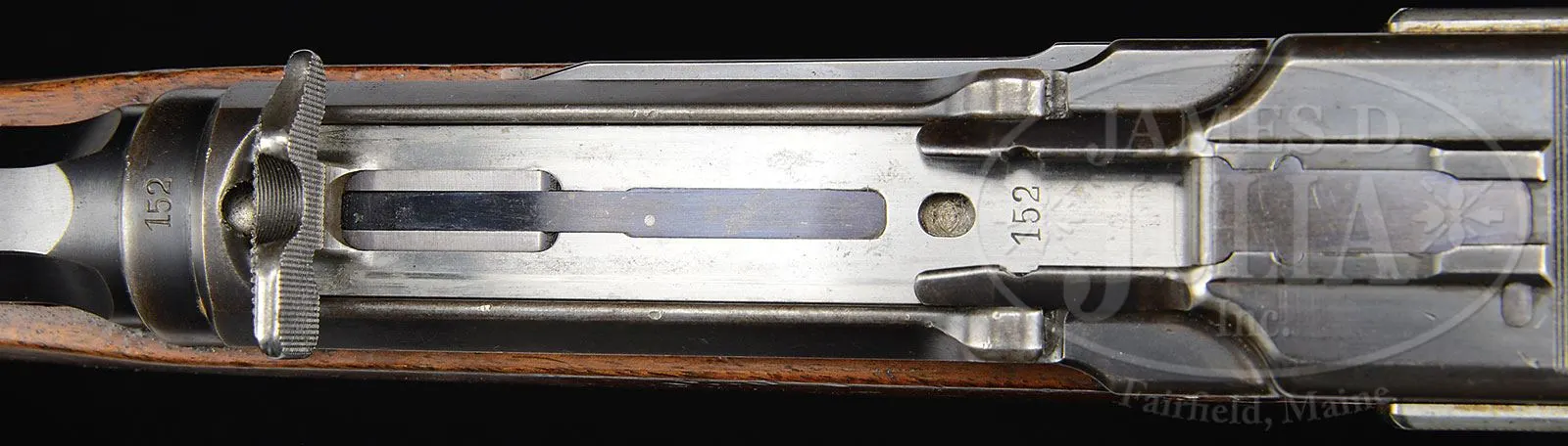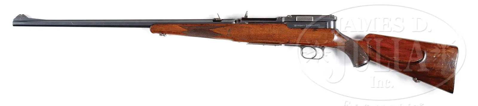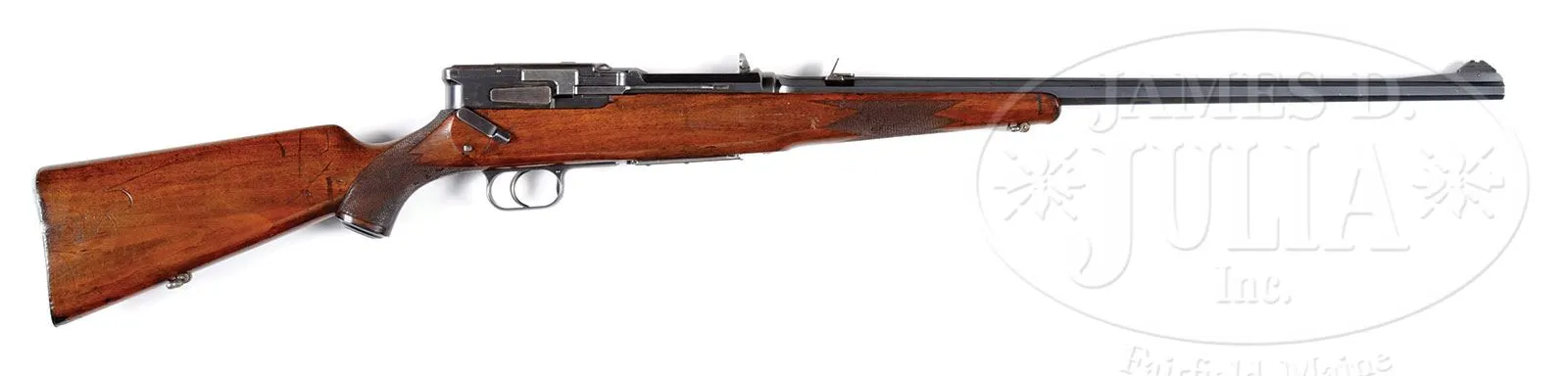 SN 152. Cal. 9X57mm. This rifle is one of a small handful of sporting self-loading rifles produced by Mauser in their developmental department under Paul Mauser’s personal supervision. Rifle has an oct bbl with an elevated rib having a length of 23-1/4″. It has 2 folding rear sight leafs, marked for 100 & 200 meters. The top flat surface on the bbl is lightly knurled & contains a panel marked “Waffenfabrik Mauser A.G. Oberndorf a.m. Neckar”. The left side of the receiver bears the engraved cursive inscription “Mauser’s Patent 1913”. There are no other inspection or proof marks on the rifle. It has a 5-rnd detachable box magazine. The walnut stock has a Monte Carlo cheekpiece. The wedge shaped telescopic sight rail for a Zeiss prismatic monocular sight is built into the rifle, but telescopic sight & mount are not present. The consignor reports that this rifle was made for a Mauser director and that the mechanism is an early precursor to the M1916 military self-loader, the inertially controlled roller cam locking flap action positioned behind the bolt being identical in function to the Aviator’s Carbine 1916. PROVENANCE: Ex Visser collection. Collection of Dr. Geoffrey Sturgess. CONDITION: Metal parts retain approx 90% bluing. Magazine floorplate is turning brown. All other components except bolt are blued and retain 95% finish. Forend & grip of the stock are nicely checkered which has worn very little. Stock has orig finish & color which have nicely mellowed to a medium brown; and has minor dents & scratches, but no chips or cracks. Magazine is fully functional, but may be missing a small piece of metal on the rib riveted to the base. Bore is shiny with strong rifling. The front sight post is present, although the protective hood is not present. Mechanics are complete & fully functional. 4-53235 JJW13 (25,000-35,000) – Lot 1149