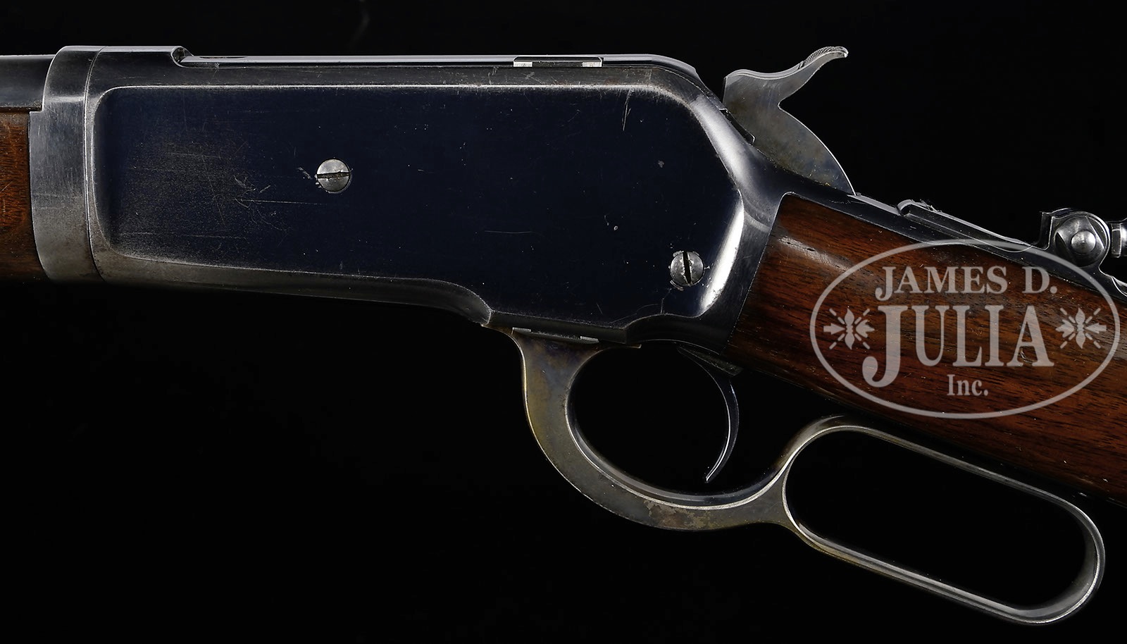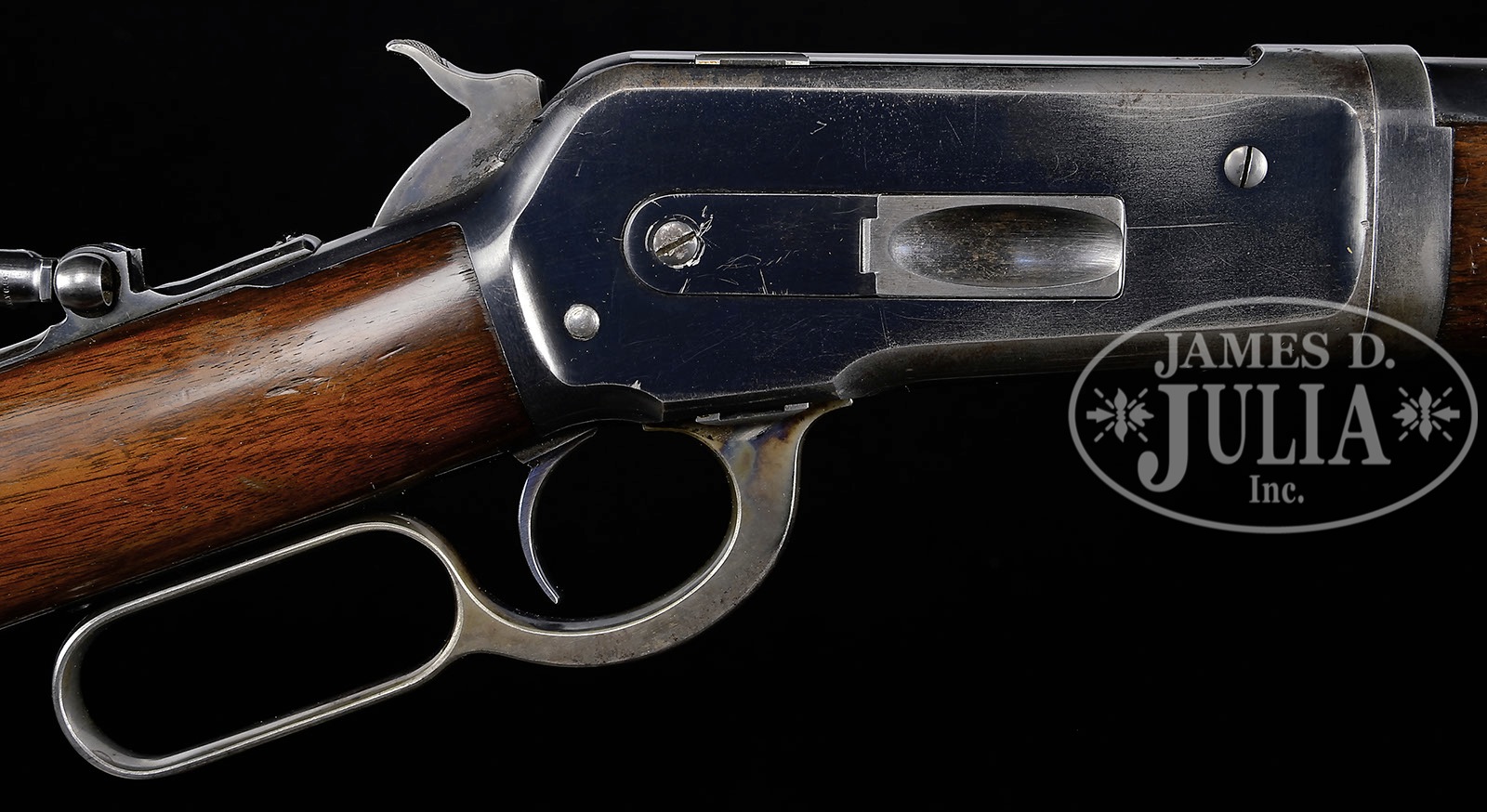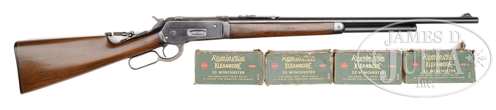 *WINCHESTER MODEL 1886 SPECIAL ORDER TAKEDOWN LEVER ACTION RIFLE.SN 126509. Cal. 33 WCF. Standard grade rifle with 24″ tapered, light weight rnd bbl, 2/3″ magazine, ramp front sight with Lyman ivory bead hunting front sight and broken, modified, semi-buckhorn rear sight and a Lyman tang sight with an extremely unusual triangle aperture. Mounted with uncheckered, straight grain American walnut with straight stock and Winchester hard rubber buttplate. Accompanied by a period of use canvas & leather takedown case and 4 boxes of Remington 200 grain ammunition. CONDITION: Very fine. Bbl and mag tube retain about 95% strong orig blue and the forend cap 96-97% bright blue. Receiver retains 85-90% glossy orig blue with wear on top and bottom at the carry point and an area of rust on top front. Lever and hammer retain faded case colors, turned silver on outer faces of lever. Wood is sound with light nicks & scratches and retains 90-95% strong orig piano varnish finish showing wear on the forearm at the carry point. Mechanics are fine, bright shiny bore. Leather on case is dry, but serviceable, canvas is showing its age, but still serviceable. Cartridge boxes show wear and missing end flaps, ammunition is fine. 4-49117 JR504 (3,000-5,000) – Lot 1150