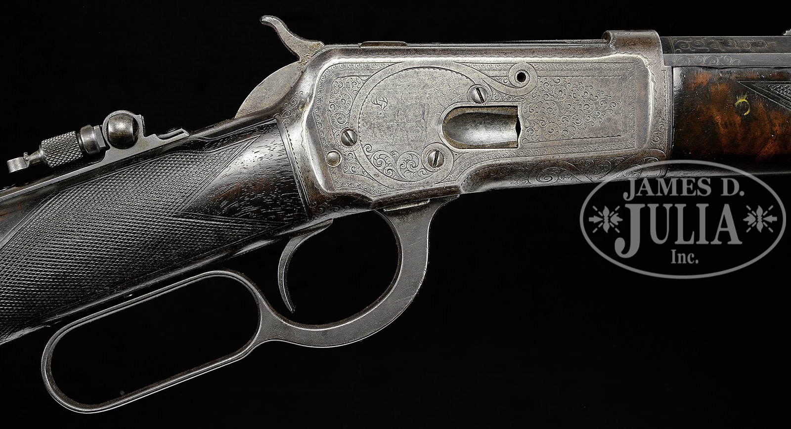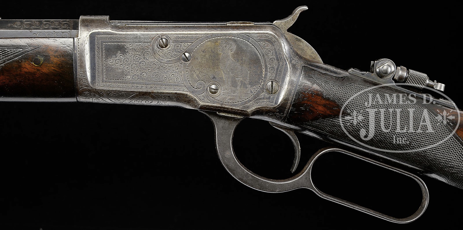 There is a tiny wood repair where forend meets the receiver. RARE DELUXE ENGRAVED WINCHESTER MODEL 1892 LEVER ACTION RIFLE.SN 10999. Cal 44 WCF (44-40). Rare deluxe engraved ’92 rifle with 24-1/4″ oct bbl, full magazine, half nickel front sight with screw, semi-buckhorn rear sight and Lyman combination tang sight. Mounted with very highly figured, about 3X American walnut with H-style checkered forearm and straight stocks with crescent buttplate. Receiver, forend cap and buttplate tang are beautifully engraved by John Ulrich in #6 patterns consisting of the large vignettes of a bighorn sheep in a mountain scene on the left side and a whitetail buck in a forest scene on the right side, all surrounded by very fine, very well executed foliate arabesque patterns with latch hook borders. Engraving patterns extend over the top of the receiver, about 1-3/4″ over the chamber area of the bbl with light patterns on the forend cap and buttplate tang. Bottom of the receiver is elaborately engraved with intertwined crossing ribbons, surrounded by very fine scrolls. Left side of the lower tang is marked with the assembly number “16” and “XXX”. Matching assembly number is also found in the top tang channel of the buttstock and inside toe of buttplate. Engraved ’92s are only a very small portion of engraved Winchesters. These little rifles were considered primarily as working tools and very few were special ordered or had extra finish wood or engraving. CONDITION: About fine. Bbl and magazine tube retain about 80% dulling orig blue with some spots of surface rust; receiver retains blue in sheltered areas, being mostly a grey metal patina; wood is sound with usual nicks, scratches and dings and retains most of an old added finish; mechanics are crisp; worn dark bore with good rifling. 4-51514 JR271 (6,000-10,000) – Lot 1151