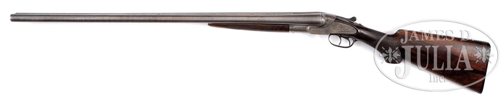 *LOVELY BAKER GUN CO. PARAGON GRADE SHOTGUN.SN 1023. Cal. 12 ga. 30″ Damascus bbls with concave matted rib, single front metal bead. 2-3/4″ chambers, Full & Full chokes. Non-ejector Paragon grade sidelock receiver. Marked “P.D.” on watertable. Breech balls engraved with scroll engraving and stippling. Touches of banknote scroll and floral engr on sides of receiver and on underside. Left lockplate engraved “Baker Gun Co.” with Setter. Right side lockplate with Pointer. Screws engraved. Snap on splinter forend with ebony tip, checkered in 2-point pattern with star engraved on iron. Trigger bow engraved with grouse in flight. Double triggers. Capped pistol grip, 2-point checkering on grip. Black “BAKER” buttplate. LOP 14-1/8″. DAC 1-1/2″. DAH 2-5/8″. Non-automatic safety. CONDITION: Fine. Barrels retain a lovely brown Damascus pattern with wear above forend area and at breeches. Bores are mirror bright. Receiver engraving sharp with orig case color in protected areas and traces on sideplates. Trigger bow has silvered. Wood is sound and fits nicely. Left stock has a scratch behind grip area. Checkering has worn over the years. Grip cap and buttplate excellent. Top lever at center. Gun is tight, operates crisply. 50980-8 TJW (3,000-5,000) C&R – Lot 1153