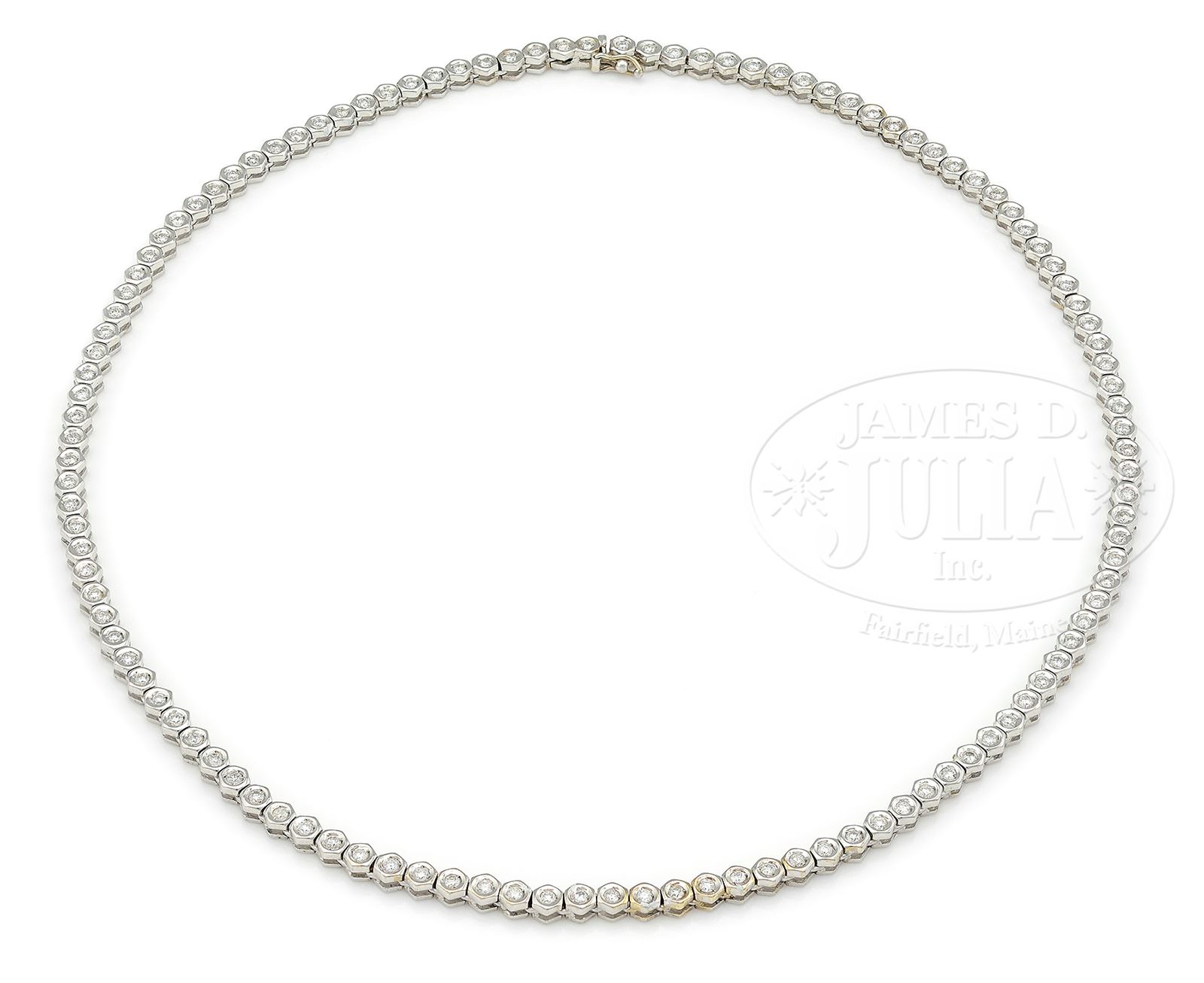 18KT DIAMOND RIVIERA NECKLACE.Set with 116 round brilliant cut diamonds in honeycomb shaped links. Approx total diamond weight is 3.48cttw. Stamped “750”. Necklace is completed with a tongue and groove clasp with safety catch. SIZE: 17″ l. CONDITION: Very good to excellent. 50468-22 (2,500-3,500) – Lot 1154