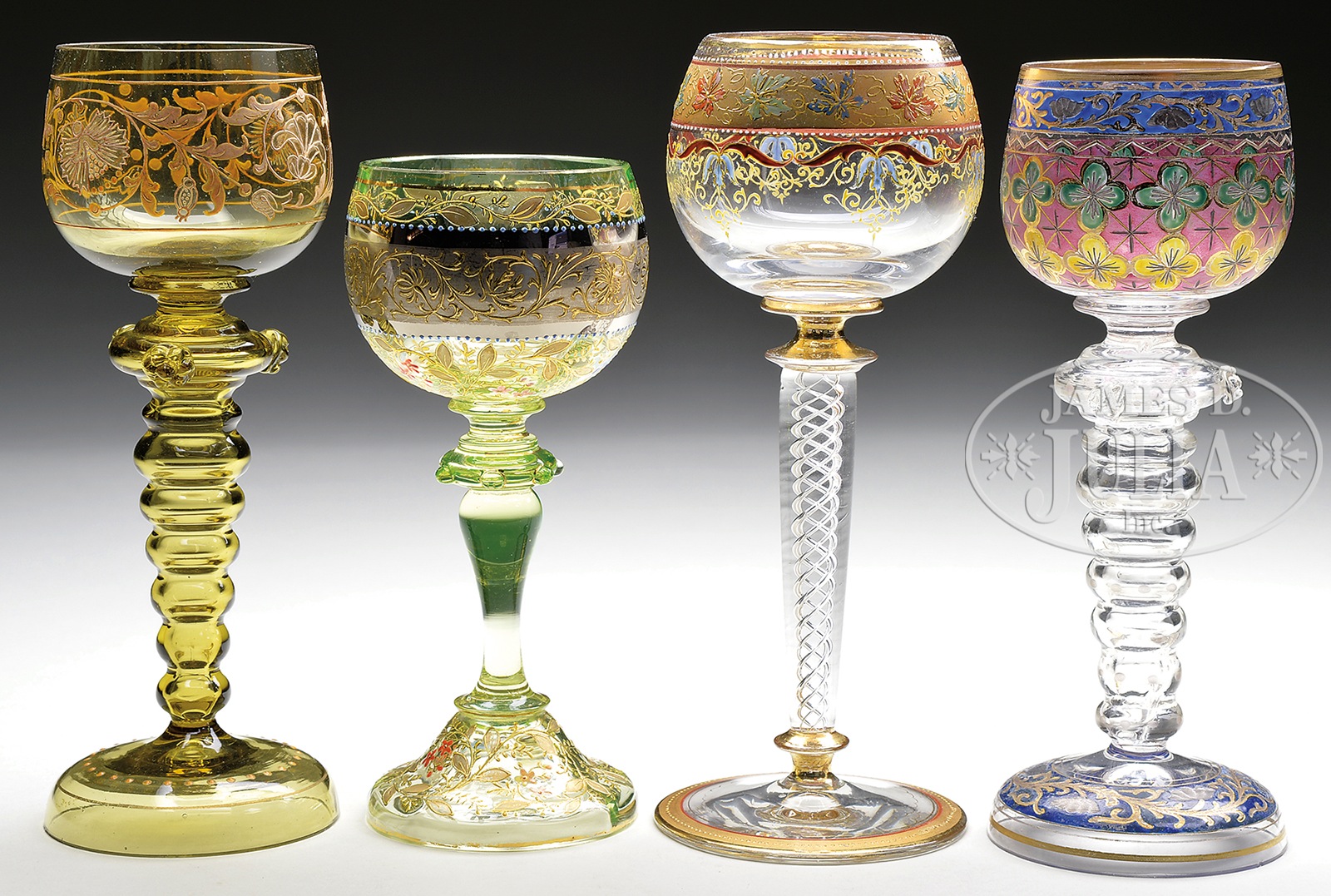 FOUR MOSER DECORATED WINES.1) Moser clear glass wine has intaglio carved and floral decoration against a red and blue stained background. Wine is finished with an intaglio carved floral wreath against a blue stained background encircling the foot. 2) Moser amber glass wine has cream colored enameled thistle decoration encircling the bowl and three applied floral prunts to the stem. 3) Moser clear glass wine has gold leaf band encircling the lip with brightly colored enameled flowers. Cup is further decorated with enameled flowers and scrolls. Cup rests on an air twist stem with inverted saucer foot with gilded edge. 4) Moser green glass wine has gold and platinum decoration encircling the bowl with delicate colorful flowers on bottom half of bowl and foot. SIZE: 7-1/2″ t; 7-5/8 t; 7-3/4″ t; 6-1/2″ t respectively. PROVENANCE: George Klabin Collection. CONDITION: All very good to excellent with some minor wear to gilding. 5-67365 (400-600) – Lot 1157