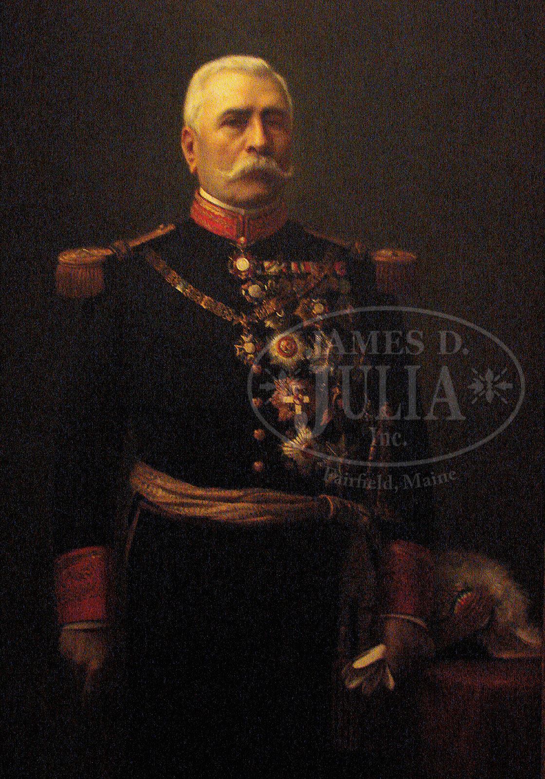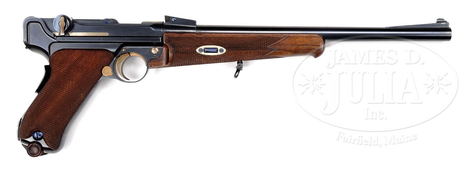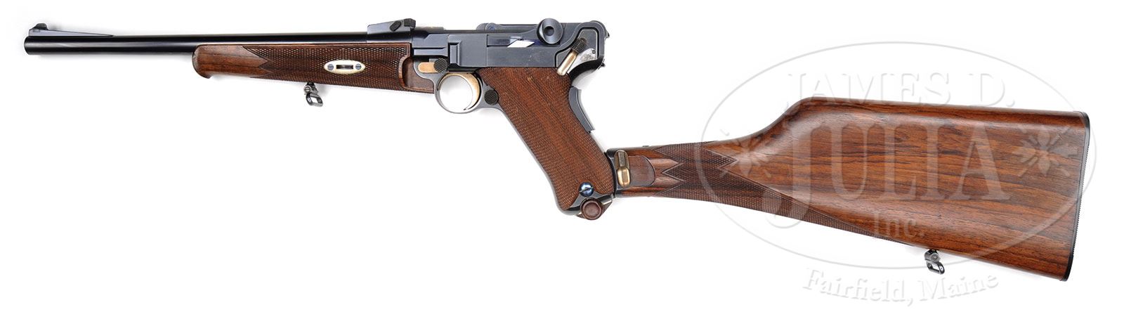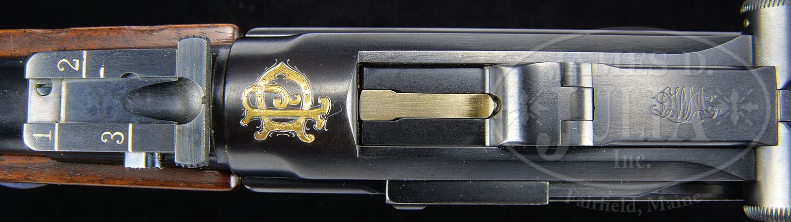 Please note: The button to open the lid of the enclosed compartment is actually ivory colored polished bone. *◊ FABULOUS PRESENTATION CASED M1902 LUGER CARBINE FOR MEXICAN PRESIDENT PORFIRIO DIAZ.SN 55C. Cal. 7.65mm. Presentation M1902 Luger carbine, unusual 2-digit (possibly only known 2-digit) SN 55C, with 11-7/8″ bbl, special features with matching stock, three spare magazines, sling, takedown tool, punch and cleaning rod. This well known Luger carbine has the standard ramped front sight with a dovetailed platinum-beaded/diamond cut post and a 4-position rear sight wherein the face of the insert has been finely checkered. Finely engraved over the chamber are elaborate gold inlaid intertwined initials “PD” whose outlines are highlighted with in-the-white metal. As correct for a presentation pistol in this serial range, the rear toggle has been marked with the overlapping Georg Luger “GL” initials. Safety has a small checkered head and the frame was made with a special lug to accept either a push-button or lever locked shoulder stock (as typical for the series). Hand fitting on this gun seems better than usual; for example, the sideplate is flush with the frame. The deluxe wood stock (possibly the only known Luger with factory deluxe wood) for this gun has a single-screw lever locking lug whose SN is on the lower arm. The checkering pattern is typical for a carbine and the buttstock, made of horn, is secured with two contoured screws whose slots have been vertically aligned. Included in the case are three unnumbered magazines whose wooden bases are secured with fire blued pins. Additional accessories include a 17″ brass stem cleaning rod/oiler, a leather sling and an unmarked blued takedown tool and punch. The takedown tool is of the very rare early pattern with long neck between thumb piece and hole. Consignor cites that this gun was presented to Diaz by Kaiser Wilhelm II as an Imperial gift to further Mexican-German relations. Multiple color photographs of this cased Luger with accessories are featured on pp. 1434 and 1435 of Borchardt & Luger Automatic Pistols by Joachim Gortz and Dr. Geoffrey Sturgess. All components are housed in a magnificent tooled red leather case, whose French fitted interior is lined with green felt. Adjacent to the cleaning rod is an ivory button to open the lid of an enclosed compartment, presumably for ammunition. An oval gold plaque on the lid is marked “Porfirio Diaz.”. The case has a matching red leather handle, a gilded brass lock, paired gilded brass latches and reinforcing gilded brass corners. PROVENANCE: Collection of Dr. Geoffrey Sturgess. CONDITION: Stunning 99% bright orig blue with comparable condition straw and fire blued small parts. The immaculate condition applies to the shoulder stock that has only the fainted, most superficial, marks on the surface. Even the horn buttplate has no defects. Comparable condition, nearly new, spare magazines of which only one has a small chip from its base. The sling, that show considerably surface crazing and no leather coverage of the buckle, may be a replacement. Excellent condition oiler, takedown tool and punch. As one would expect from such an immaculate presentation set, the carbine has a mirror bore and the manual function is perfect. One of the finest carbines in existence. 4-52095 LMA63 (90,000-150,000) – Lot 1157