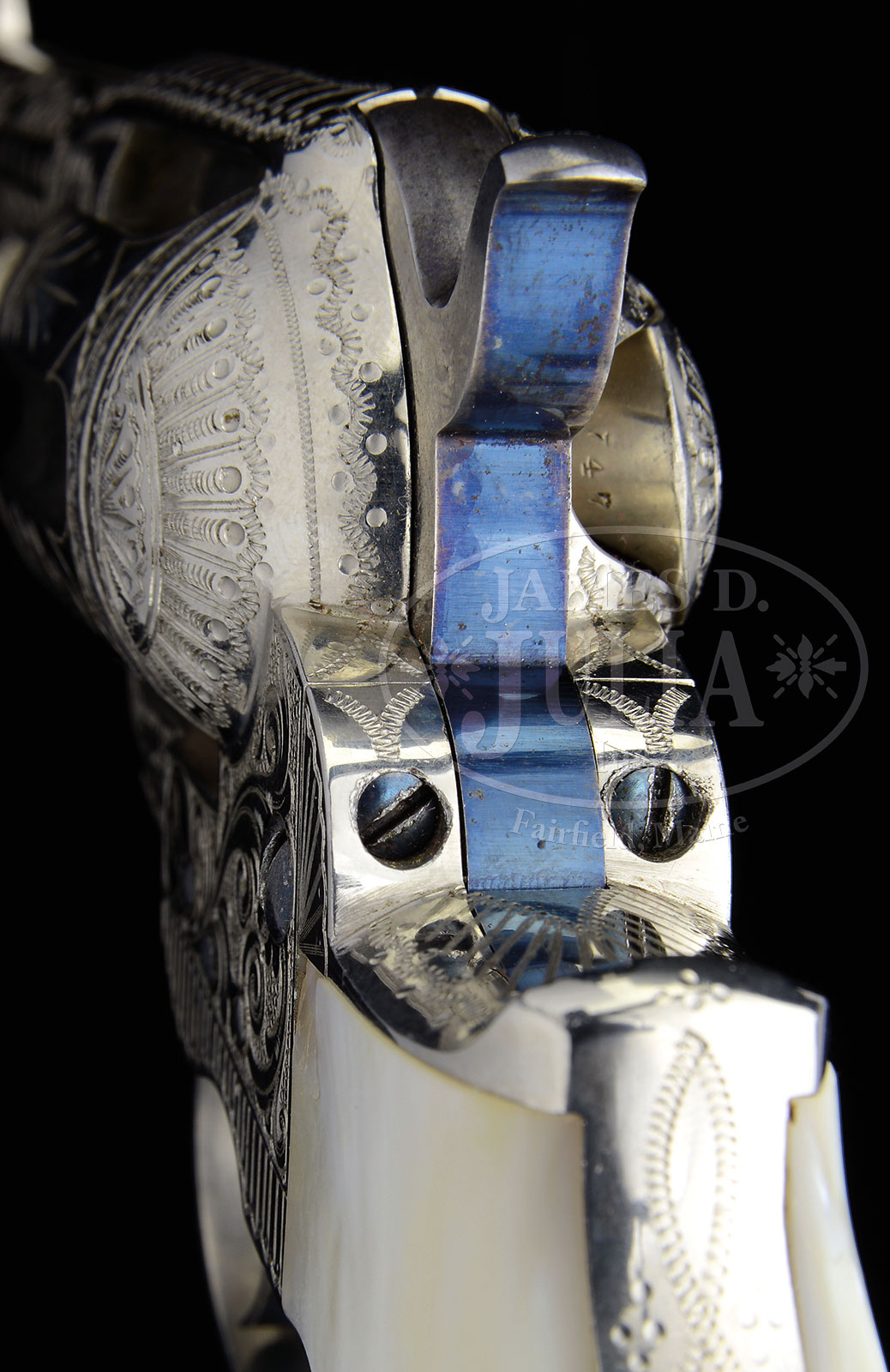 RARE ENGRAVED COLT MODEL 1877 THUNDERER DA REVOLVER THAT BELONGED TO NEW MEXICO AND EL PASO TEXAS BUSINESSMAN AND POLITICIAN FELIX MARTINEZ.SN 99319. Cal 41 Colt. Nickel finish with 4-1/2″ bbl, full front sight, 2-line address and marked on left side “COLT. D.A. 41”. Left side of frame has 3-line patent dates & the Rampant Colt logo in a circle. Mounted with 2-pc smooth pearl grips. Revolver is beautifully engraved by Cuno Helfricht with deluxe coverage of about 75-80% of the surface. Engraving consists of flowing foliate arabesque patterns that have fine pearled background. Recoil shield & loading gate have Mr. Helfricht’s trademark sunburst patterns. Top of the backstrap is engraved in an elaborate fan pattern with geometric patterns down the backstrap, on the trigger bow & trigger guard. Top strap is engraved in feather patterns with snake & dot edges. Top of the bbl is engraved, full length with geometric & snake & dot patterns. Ejector housing is engraved full length on the outer radius with snake & dot patterns and a flower blossom in the center with additional snake & dot pattern in the top gullet. Cylinder is engraved in Mr. Helfricht’s traditional alternating patterns on the lands between the flutes with geometric patterns toward the rear and snake & dot patterns around the rear edge. There are corresponding snake & dot patterns on the front edges of the recoil shield & loading gate. This is one of the most elaborately engraved Model 1877 revolvers ever examined by this cataloger. According to consignor’s family legend this revolver was the property of his great grandfather, Felix Martinez (March 1857-March 1916).El Palacio, the history magazineof New Mexico, in a feature article described him as “the most prominent Hispanic of his time”. Mr. Martinez was born in Taos County New Mexico and received his education in New Mexico. In 1876 Mr. Martinez was employed in a store in Colorado, later becoming part owner of a mercantile business there. In 1879 he moved to Las Vegas New Mexico where he opened his own mercantile business and bought & sold cattle, all at about the same time that the Santa Fe Railway reached that point. He sold out in 1886 and was elected Territorial Representative in 1888. In 1890 he purchased a Santa Fe newspaper and moved it to Las Vegas. Mr. Martinez became more involved in politics and in 1893 was appointed clerk of the U.S. Territorial Court for the fourth district of New Mexico. In 1897 he moved with his family to El Paso, TX where he owned and published a newspaper from 1899-1909, founded a Realty company, organized the Portland Cement Co. there and a small railroad that serviced the El Paso area. He continued involvement in politics serving on the Board of Directors for several banks and was instrumental in the construction of the Elephant Butte Dam in New Mexico, at that time the world’s largest irrigation project. Mr. Martinez served as liaison & advisor for the 1909 meeting between Presidents Porfirio Diaz & William Howard Taft. In April 1911 Mr. Martinez acted as an intermediary to prevent Francisco Madero’s revolutionary forces from sacking Cuidad Juarez. He was successful but only temporarily as a month later General Pancho Villa attacked Juarez and executed those he considered to be enemies. In 1912 when New Mexico was to become a state Mr. Martinez ran as a candidate for the U.S. Senate, but was finally defeated on the 8th ballot. In 1913 Mr. Martinez was appointed President of the Panama-Pacific Commission and along with other dignitaries toured much of South America and in 1915 participated in the Panama-Pacific Exposition in San Francisco. Mr. Martinez died on March 22, 1916 after a bout of pneumonia. He is buried on his ranch in New Mexico near the Colorado line.He has been the subject of feature articles in The Password, the publication of the El Paso Historical Society; and is the subject of an exhibit in the El Paso History Museum.With Colt Factory letter documenting serial number 99319 Cal, 41/c Barrel length illegible finish nickel stocks Pearl Factory engraved Yes , Sold to Ketelson & Degeau El Paso Texas Shipped to E.Alvarez Mexico City Mexico Jan 18 1895 in a 2 gun shppment. CONDITION: Extremely fine plus, all matching. Overall retains about 99& crisp orig nickel finish. Screw heads retain most of their orig bright fire blue. Hammer has polished sides with bright fire blue rear edge. Trigger retains about 60% bright fire blue. Left grip has a small chip at the frame and a couple of age lines in the right grip, otherwise the grips are sound showing great fire & color. Mechanics are crisp, brilliant shiny bore. Appears to have been fired, probably no more than one cylinder load. 51595-1 JRL (7,500-15,000) – Lot 1157 Click here to view provenance