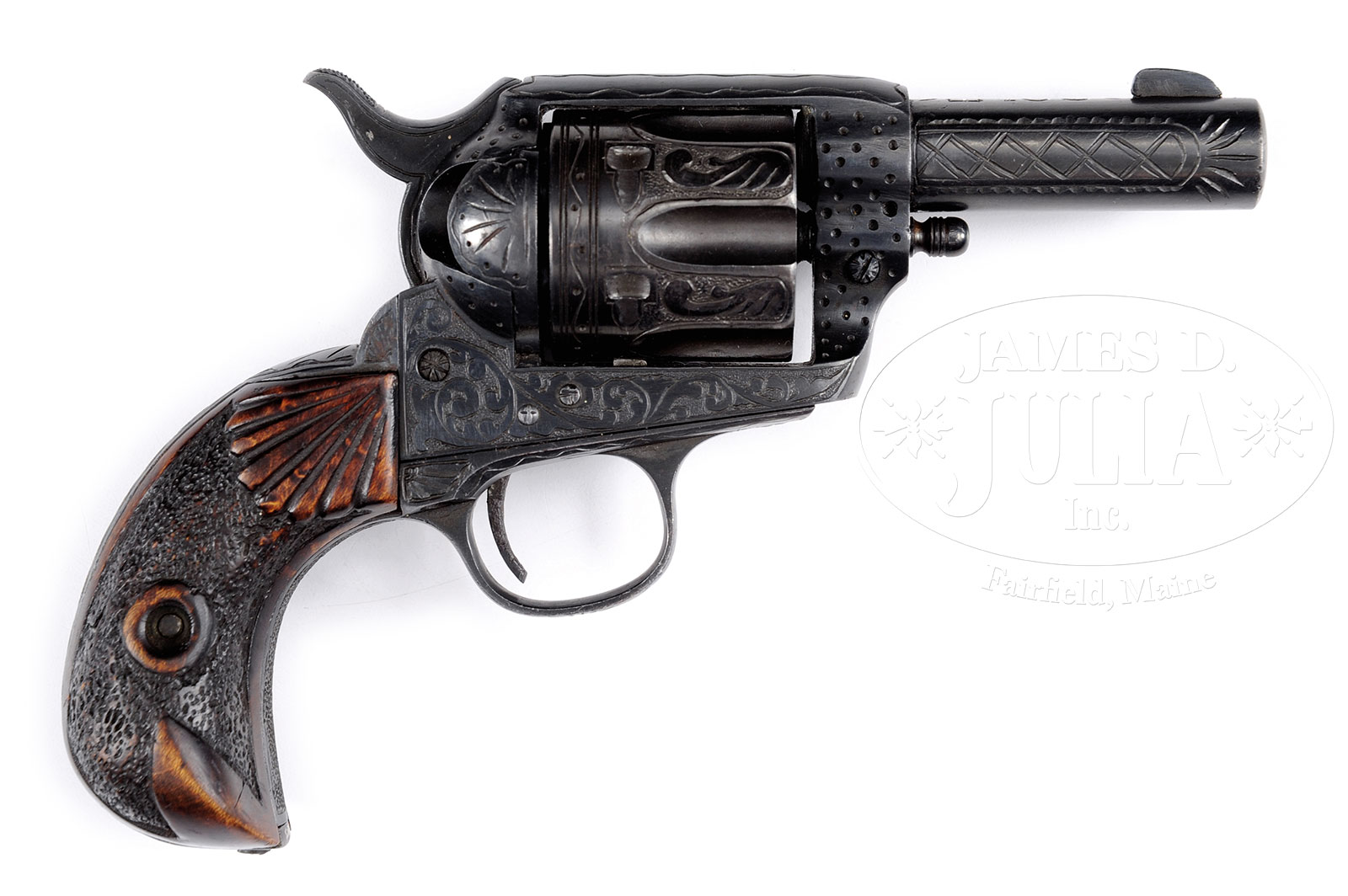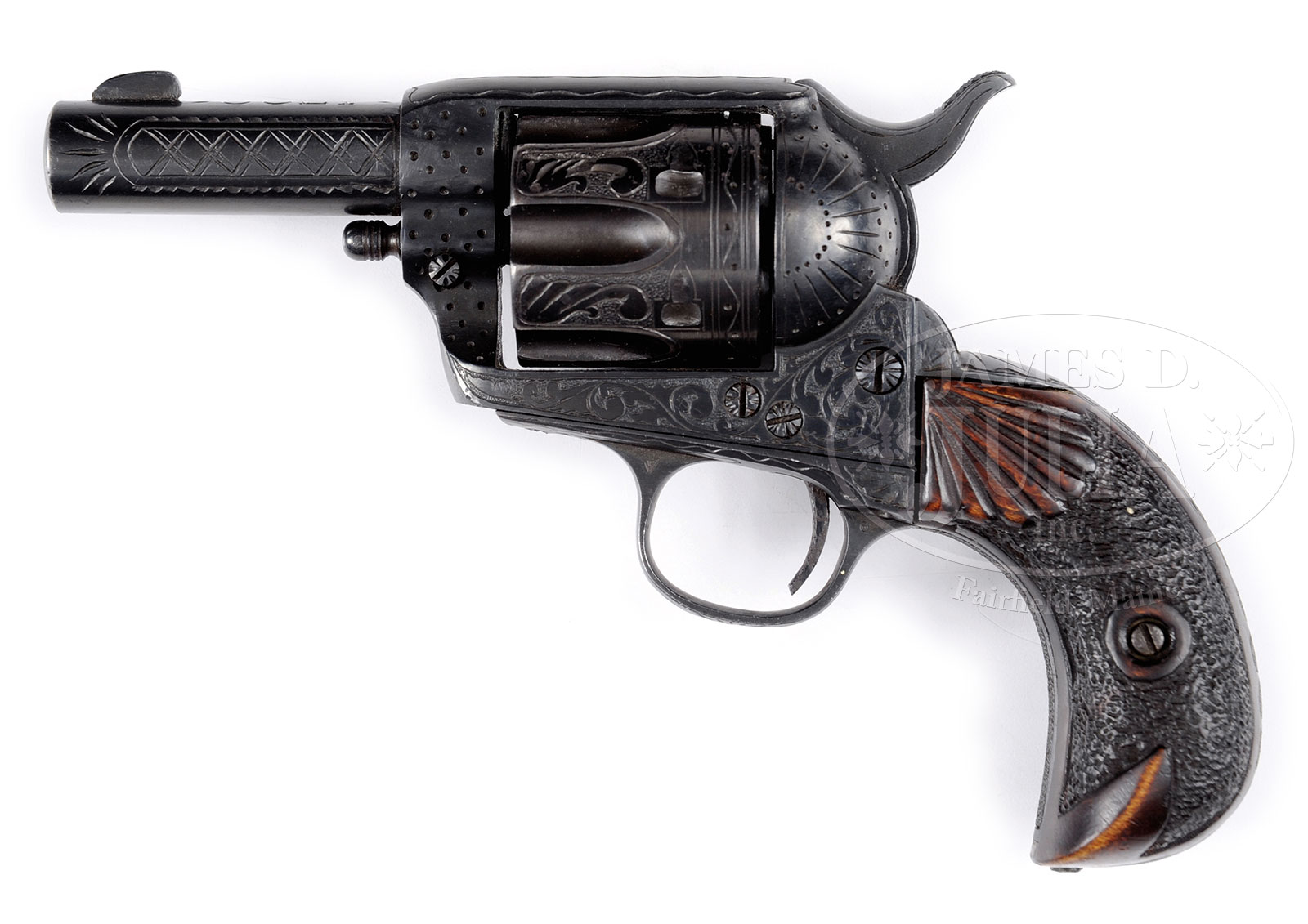 *UNUSUAL CUSTOM COLT SINGLE ACTION ARMY REVOLVER.SN 298226. Cal 22. All blue finish with 3″ bbl, replaced front sight with hand engraved “COLT” on top. Grip frame has been altered to bird head shape and is mounted with 2-pc carved wood grips. Cylinder has been sleeved from what appears to be about 38 Special or possible 32-20 and the hammer nose has had a rnd firing pin installed with the frame altered to accommodate the rimfire firing pin. Revolver is amateurishly engraved in foliate patterns with cross-hatching on sides of the bbl and a fan pattern at top of backstrap. Backstrap is engraved in a series of connected circles. Front strap is stippled and trigger bow is engraved with sun pattern. Recoil shield & loading gate are engraved in fan patterns and front sides of the frame have deep punch marks. Cylinder is engraved to match with a snake & dot pattern around rear edge. Base pin is first type with dimpled ends and screw heads are engraved. All together a most unusual revolver. CONDITION: Very good. Overall retains about 98% custom blue finish. Trigger is pitted. Grips are sound showing light to moderate wear. Mechanics are fine, bright shiny bore. 51505-6 JRL (1,500-2,500) C&R – Lot 1158