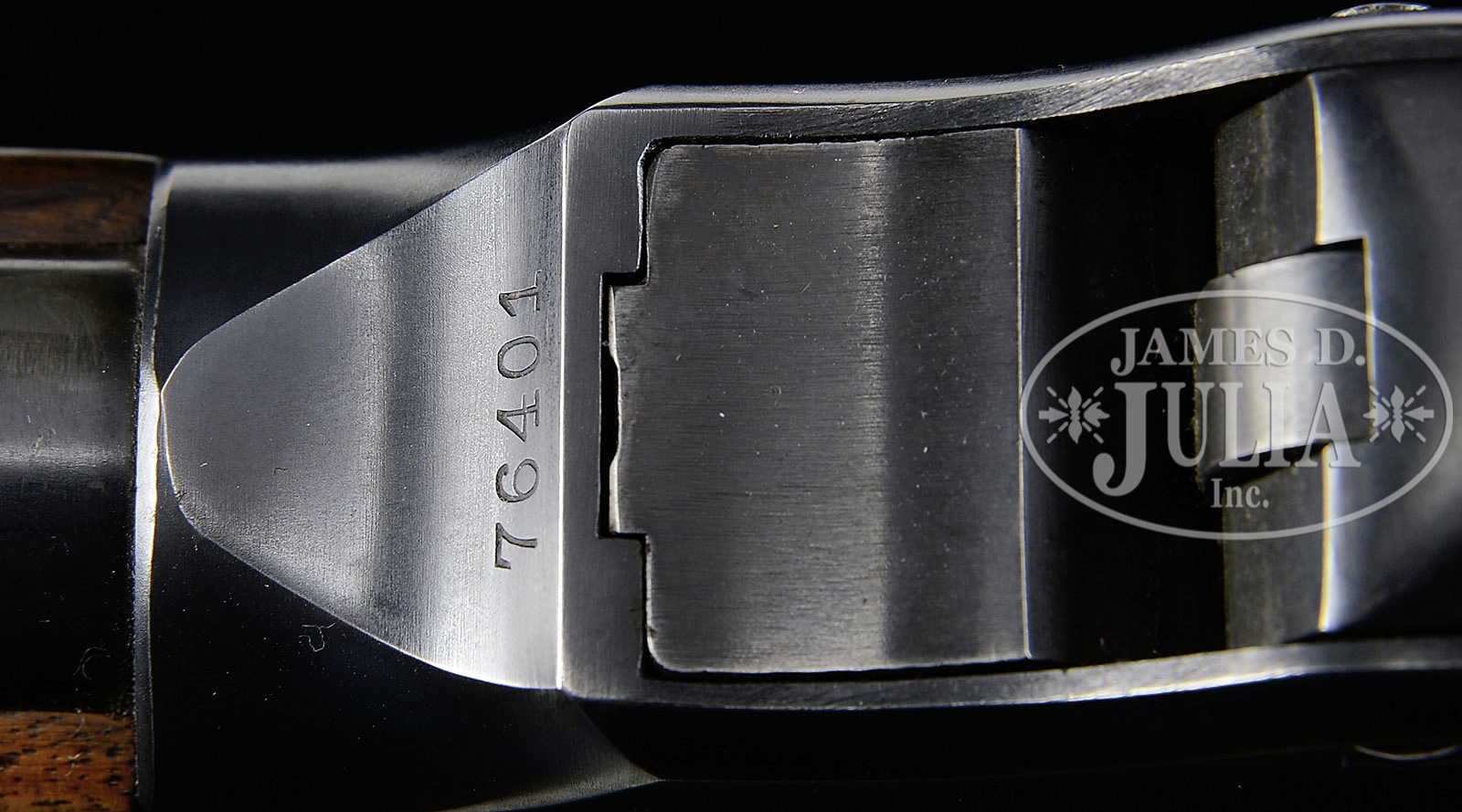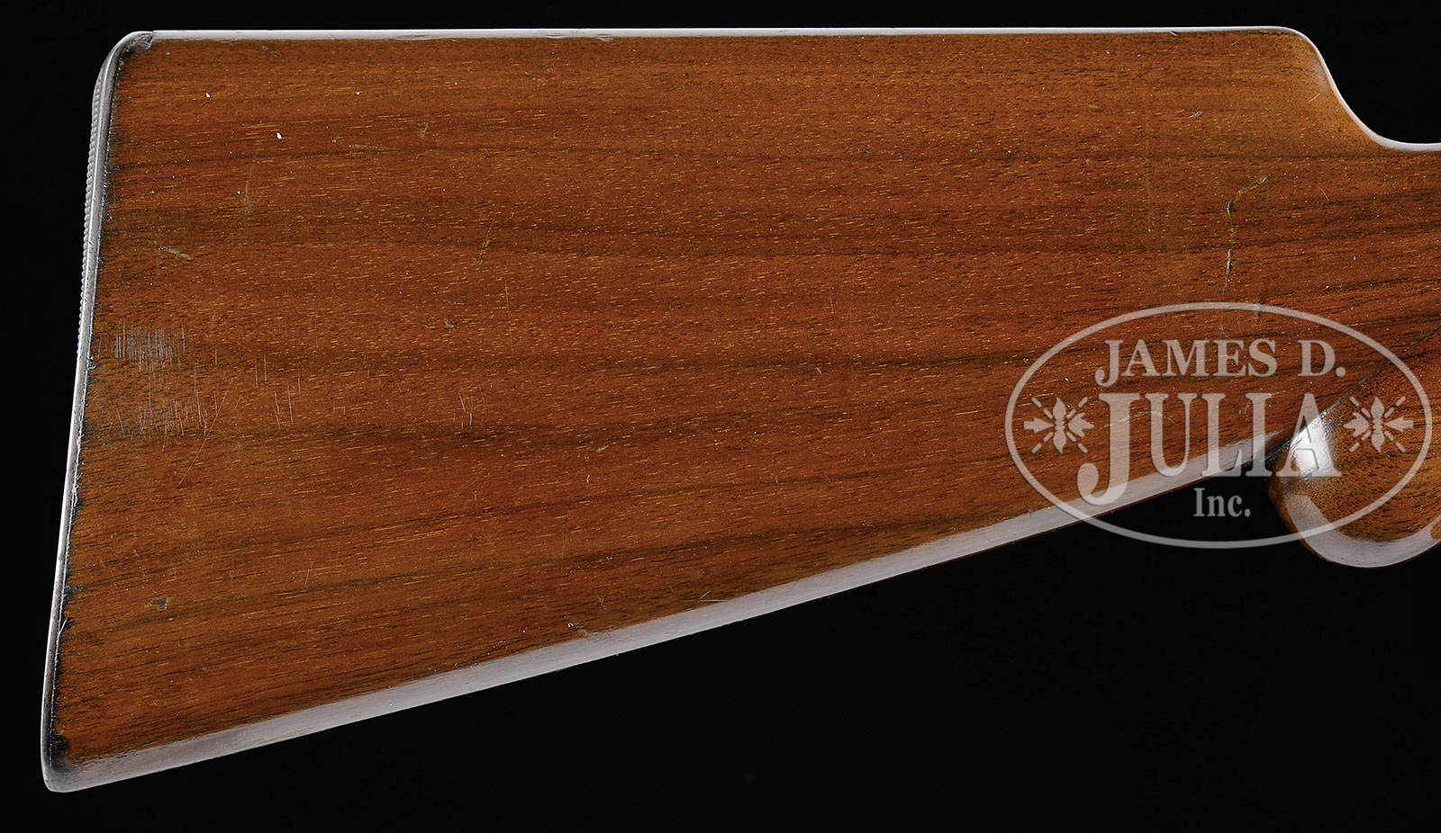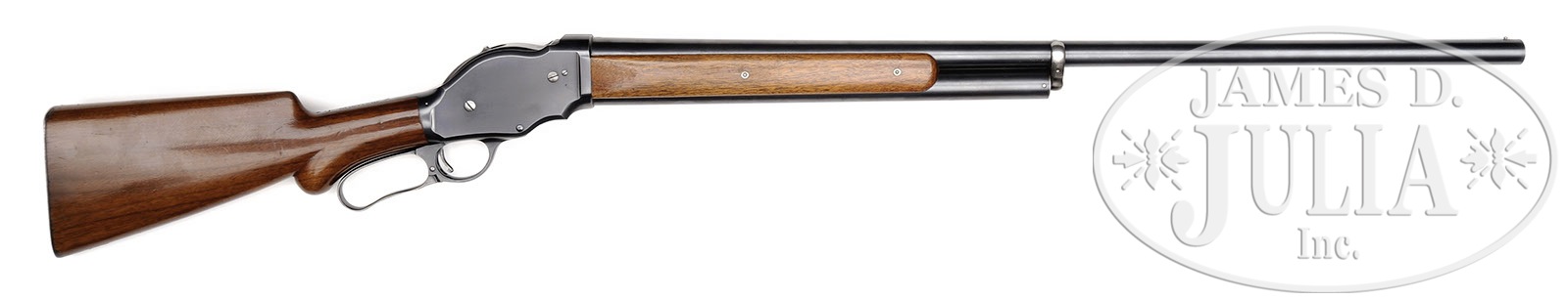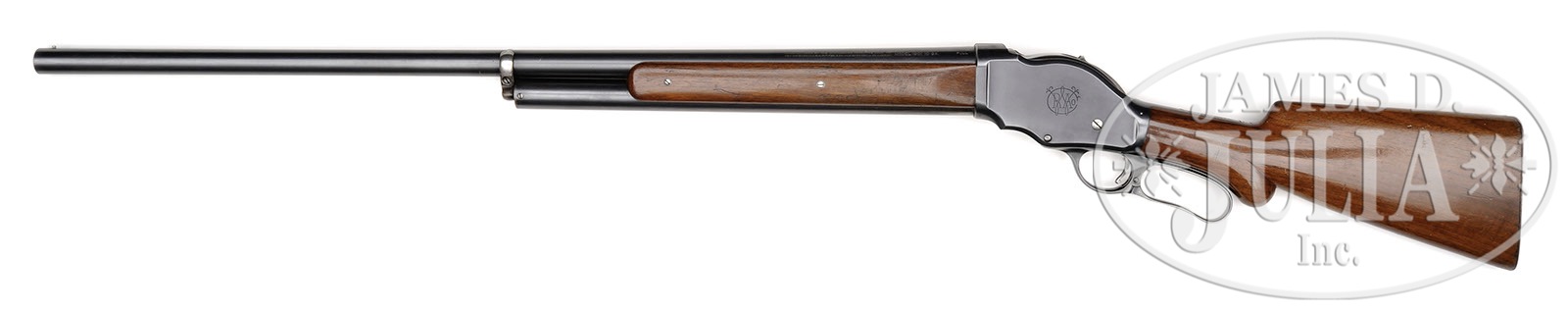 *SCARCE WINCHESTER MODEL 1901 LEVER ACTION SHOTGUN.SN 76401. Cal. 10 ga. Standard grade shotgun, blue finish with 32″ steel bbl, half magazine and silver front bead; receiver has the “WRACO” trademark on the left side; mounted with very nicely figured, uncheckered American walnut with rnd knob buttstock that has checkered steel buttplate. Bbl & magazine tube have matching walnut panels on each side. According to The Winchester Book, Madis, there were only about 13,000 of these scarce shotguns produced between 1901 & 1920, with a few assembled from parts until about 1930 when all the remaining parts were shipped to Mexico. These shotguns were only produced in 10 ga and were simply a continuation of the Model 1887 with a few minor improvements. They were a strong reliable shotgun but were unable to compete with the “new” slide-action repeaters. The Model 1901 Winchester has been used in various movies, but most famously by Arnold Schwarzenegger in several of his movies. PROVENANCE: Robert H. Haskell, III Estate Collection. CONDITION: Extremely fine. Bbl retains 97-98% strong orig blue with only a few small nicks & faint muzzle edge wear; magazine tube retains about 95% orig blue with a series of small nicks & light wear around the carry point; receiver, top tang & lever retain 98-99% orig blue with only faint sharp edge wear. Wood is sound with the buttstock showing a few light nicks & scratches and retains about 98% bright orig varnish. Forearm panels have a few light scratches with light wear & dulling at the carry point. Mechanics are crisp. Bright shiny bore. 4-50201 JR34 (2,500-4,000) – Lot 1161