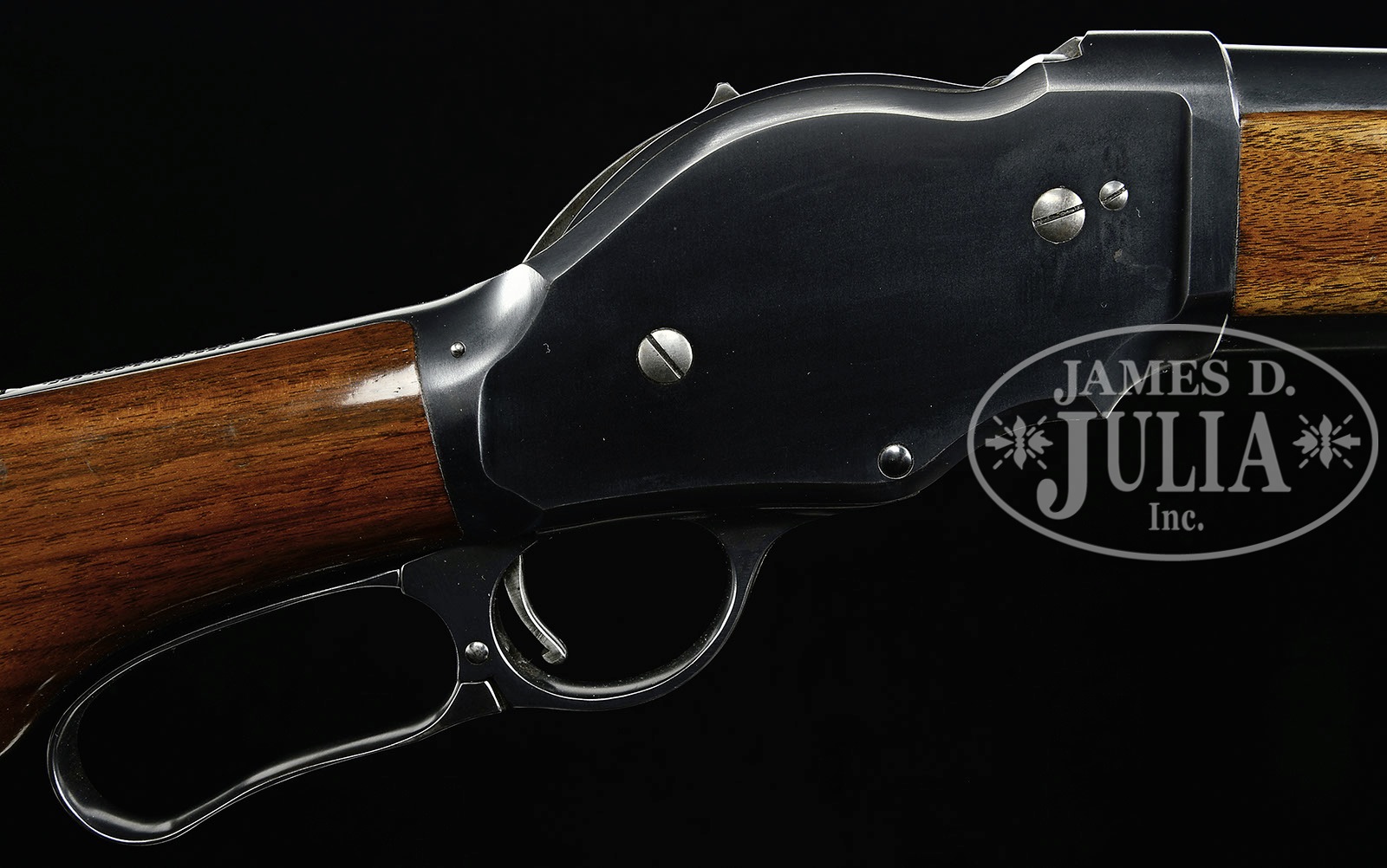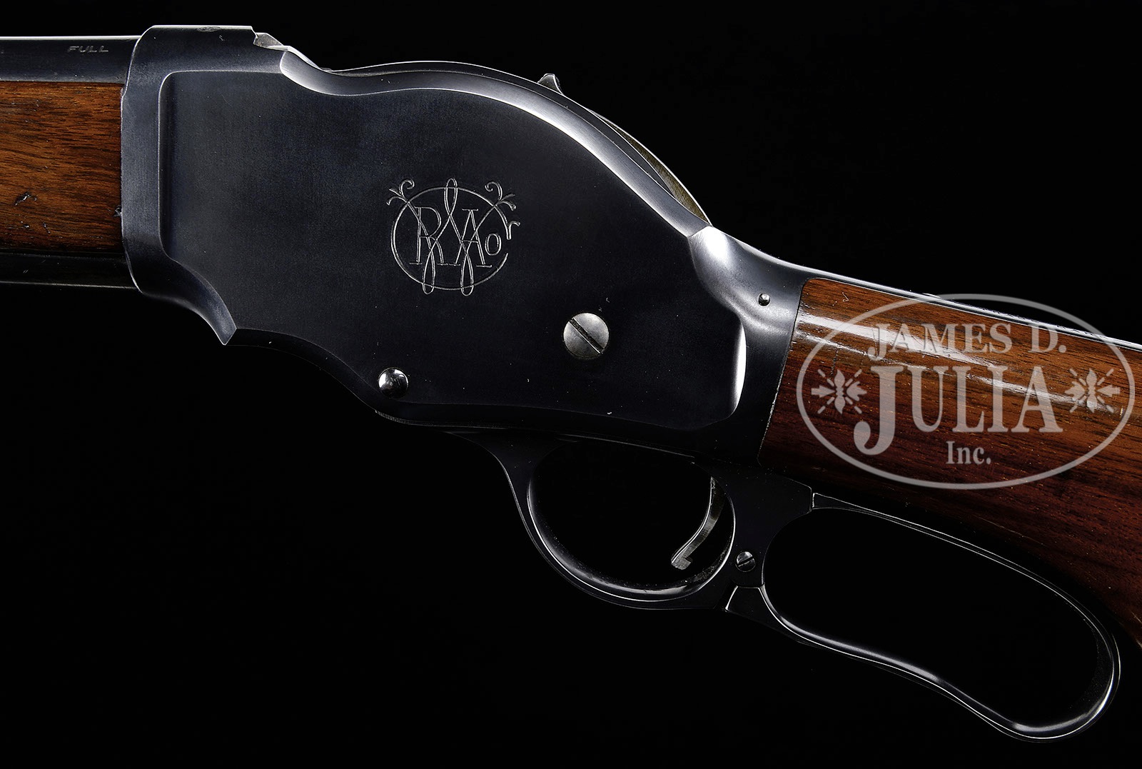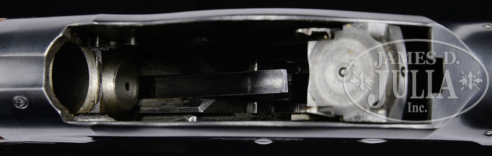 *SCARCE WINCHESTER MODEL 1901 LEVER ACTION SHOTGUN.SN 76401. Cal. 10 ga. Standard grade shotgun, blue finish with 32″ steel bbl, half magazine and silver front bead; receiver has the “WRACO” trademark on the left side; mounted with very nicely figured, uncheckered American walnut with rnd knob buttstock that has checkered steel buttplate. Bbl & magazine tube have matching walnut panels on each side. According to The Winchester Book, Madis, there were only about 13,000 of these scarce shotguns produced between 1901 & 1920, with a few assembled from parts until about 1930 when all the remaining parts were shipped to Mexico. These shotguns were only produced in 10 ga and were simply a continuation of the Model 1887 with a few minor improvements. They were a strong reliable shotgun but were unable to compete with the “new” slide-action repeaters. The Model 1901 Winchester has been used in various movies, but most famously by Arnold Schwarzenegger in several of his movies. PROVENANCE: Robert H. Haskell, III Estate Collection. CONDITION: Extremely fine. Bbl retains 97-98% strong orig blue with only a few small nicks & faint muzzle edge wear; magazine tube retains about 95% orig blue with a series of small nicks & light wear around the carry point; receiver, top tang & lever retain 98-99% orig blue with only faint sharp edge wear. Wood is sound with the buttstock showing a few light nicks & scratches and retains about 98% bright orig varnish. Forearm panels have a few light scratches with light wear & dulling at the carry point. Mechanics are crisp. Bright shiny bore. 4-50201 JR34 (2,500-4,000) – Lot 1161