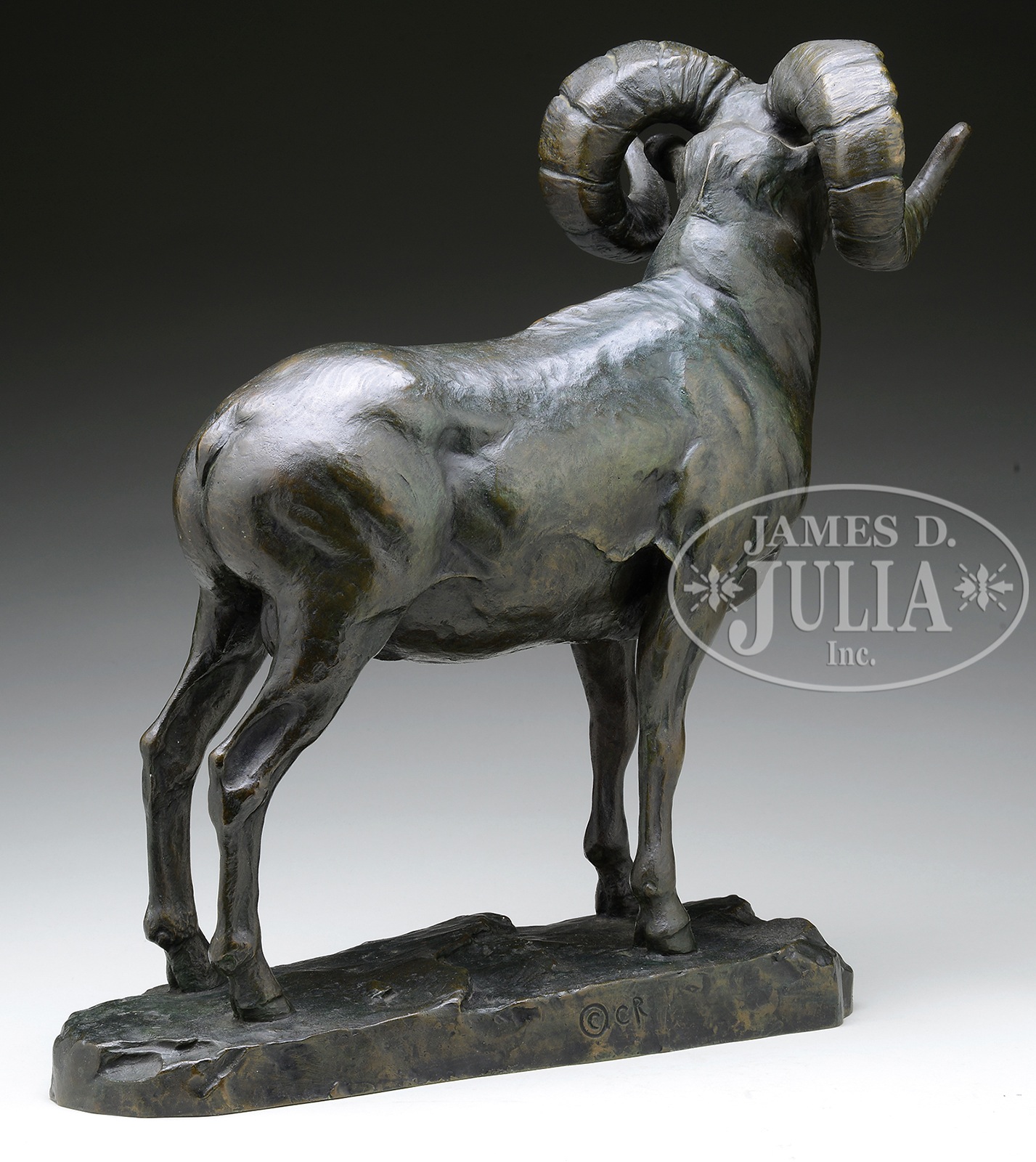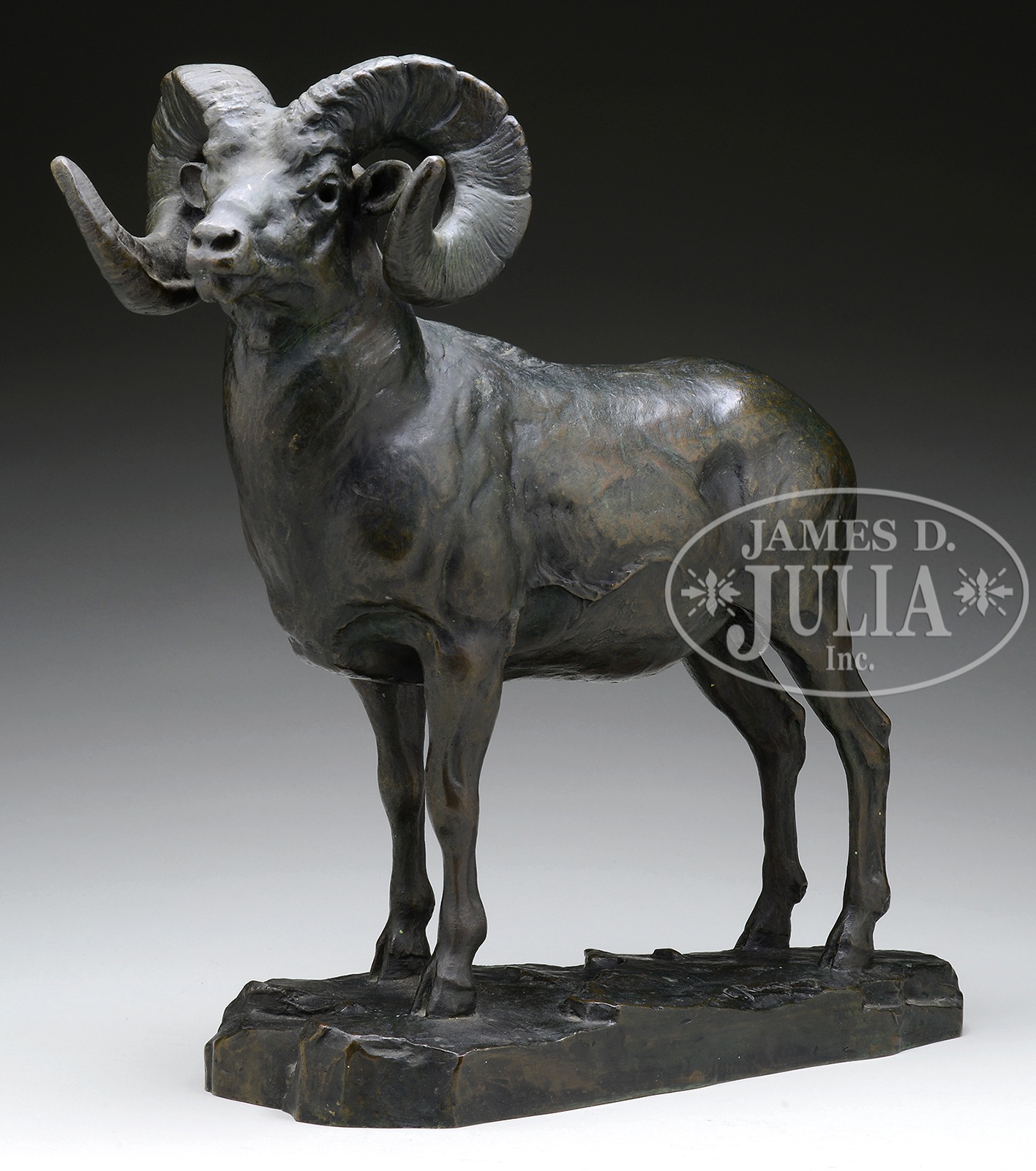 CARL CLEMENS MORITZ RUNGIUS (American, 1869-1959) BIG HORN SHEEP.Bronze Signed on base “C. Rungius” SIZE: 16-1/2″ h. x 17″ w PROVENANCE: From a fine Downeast Maine home. NOTE: Accompanying the bronze are hand-written and typed letters between the artist Carl Rungius and the buyer, dated 1929/30. One letter dated September 15, 1930, discloses the price of $450.00 that was being paid. Also a letter from the General Bronze Corporation indicating shipment of the bronze in 1930. CONDITION: Very good with a wonderful bronze/green patina 1074-1 (125,000-175,000) – Lot 1162