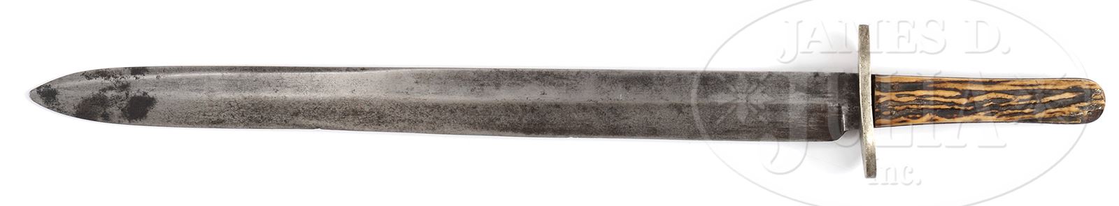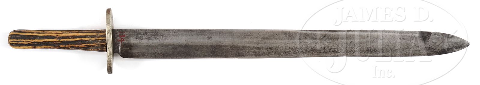 MASSIVE WILLIAM JACKSON SHEFFIELD BOWIE.This exact knife is pictured on pg. 375 of Norm Flayderman’s monumental text The Bowie Knife. This knife measures 22-3/4″ overall with a 17-3/4″ blade, and is pictured to the far left in photograph of five of these monsters made circa 1850-1860. Knife is made by and marked on ricasso “WM. JACKSON & CO. / SHEAF ISLAND WORKS / SHEFFIELD”. Ricasso is marked with red paint “No. 134″, probably meaning this knife was also from the famous Bob Abel’s collection prior to Mr. Flayderman’s. PROVENANCE: Ex-Robert Abels. Ex-Norman Flayderman Collection; The Estate Collection of Phil A. Bleakney, Jr. CONDITION: Good to very good overall. Blade is gray with worn point, scattered areas of staining & pitting. Large thick German silver crossguard is loose & there is about 1/2” chip in one grip which can also be seen in Flayderman book. 49059-218 JS (2,000-3,000) – Lot 1163