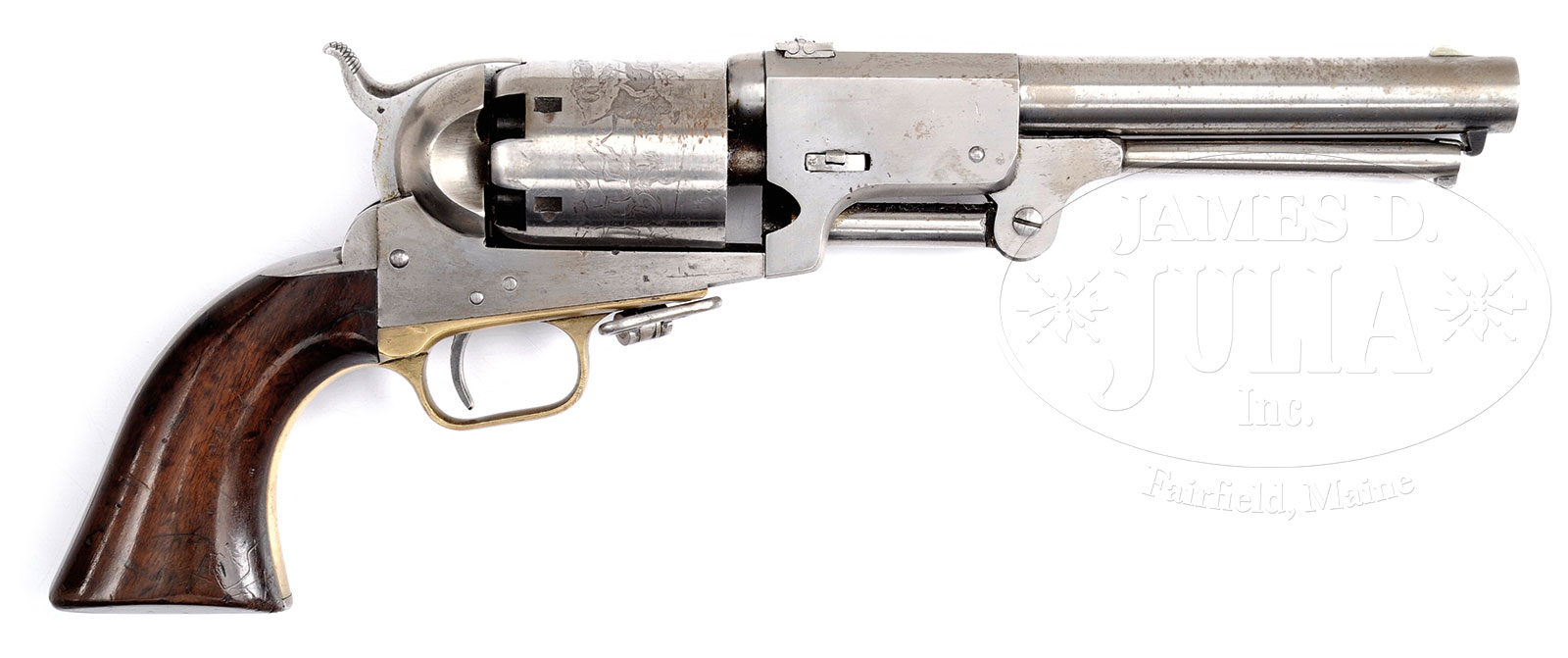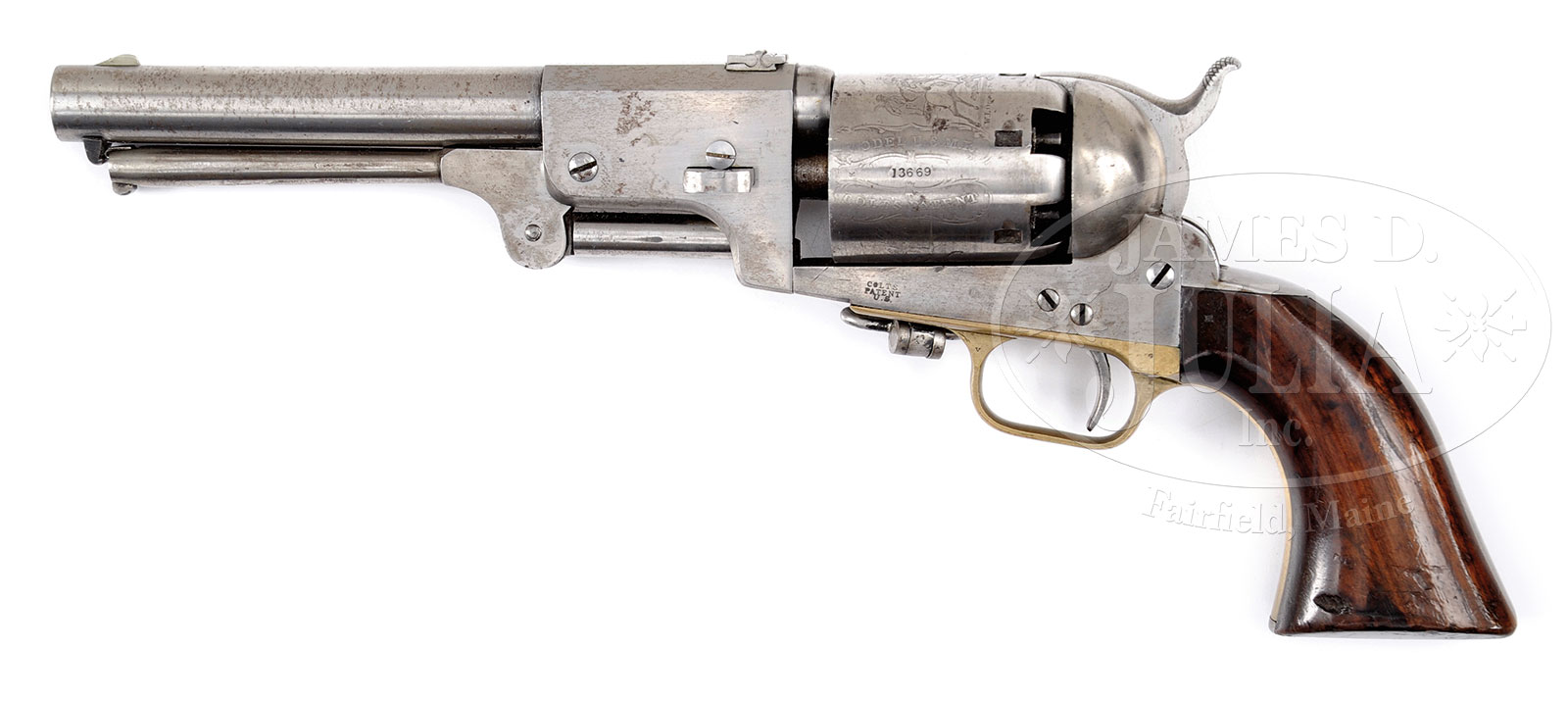 FINE MARTIAL COLT THIRD MODEL DRAGOON PERCUSSION REVOLVER.SN 13669. Cal. 44. Usual configuration with 7-1/2″ oct to rnd bbl, German silver front sight and 1-line New York address. Front sight has been trimmed and 3-leaf rear sight has been dovetailed and fitted into back of bbl. Left side of the frame has a small “COLTS PATENT” over “US”. Trigger guard is fitted with sling swivel just in front of trigger guard and backstrap has rectangular cutout for detachable stock. Cylinder is usual 6 shots with excellent Dragoon/Indian fight scene roll marking. The brass trigger guard and backstrap should contain a 1-pc walnut grip. These Dragoon revolvers were produced from about 1851 to 1861 with a total production of about 10,500 revolvers, of which about 4,330 were purchased on military contracts and this particular gun being made in 1854. This is a particularly nice crisp example. Unfortunately, gun has been cleaned in the European style removing all orig finish except for hidden case colors inside frame. CONDITION: Very fine overall as polished and SNs freshened or re-struck on frame and bbl housing, see photos. Gun appears orig and authentic otherwise with matching numbers though no number on wedge and wedge screw is restored. Small sub-inspector letters are found on most parts. Rolled cylinder scene is almost entirely discernible with scattered scratches and scuffs. Stocks are sound and well fit, though refinished and varnished partially obscuring inspector’s cartouches on either side. Mechanically gun has crisp action, retaining all safety pins and bright well defined bore. 51605-3 JS (5,000-7,000) – Lot 1164