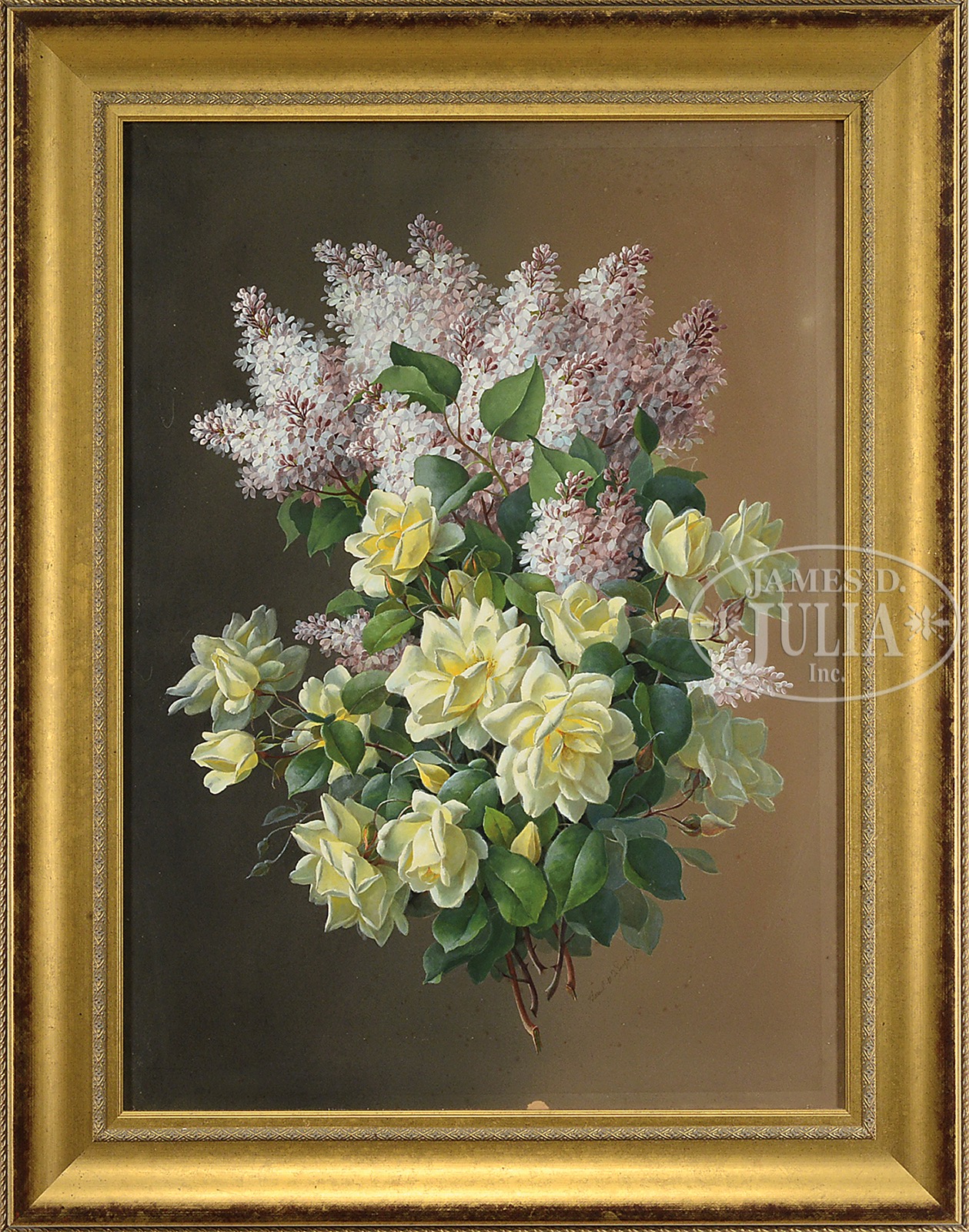 RAOUL MAUCHERAT DE LONGPRE (French, 1843-1911) FLORAL STILL LIFE WITH LILACS AND YELLOW ROSES.Gouache Housed in a giltwood frame, under glass Signed lower right “Raoul M De Longpre”, bears Brockton Art Museum Label on verso SIZE: Sight 28″ x 20″. Overall 35″ x 27-1/2″ PROVENANCE: Alfred T. Morris, Sr.; Gift to Brockton Art Museum by Mr. Mortis, de-accessioned in 2004 CONDITION: Overall discoloration with small chip loss lower center, evidence of prior mat burn, minor foxing (not examined out of frame) 51246-2 (3,000-5,000) – Lot 1165
