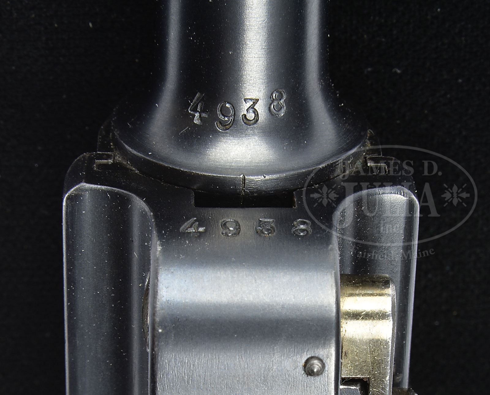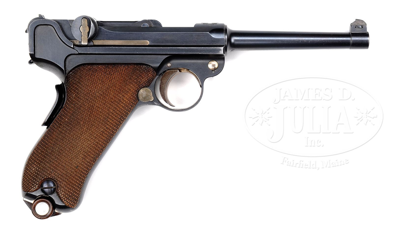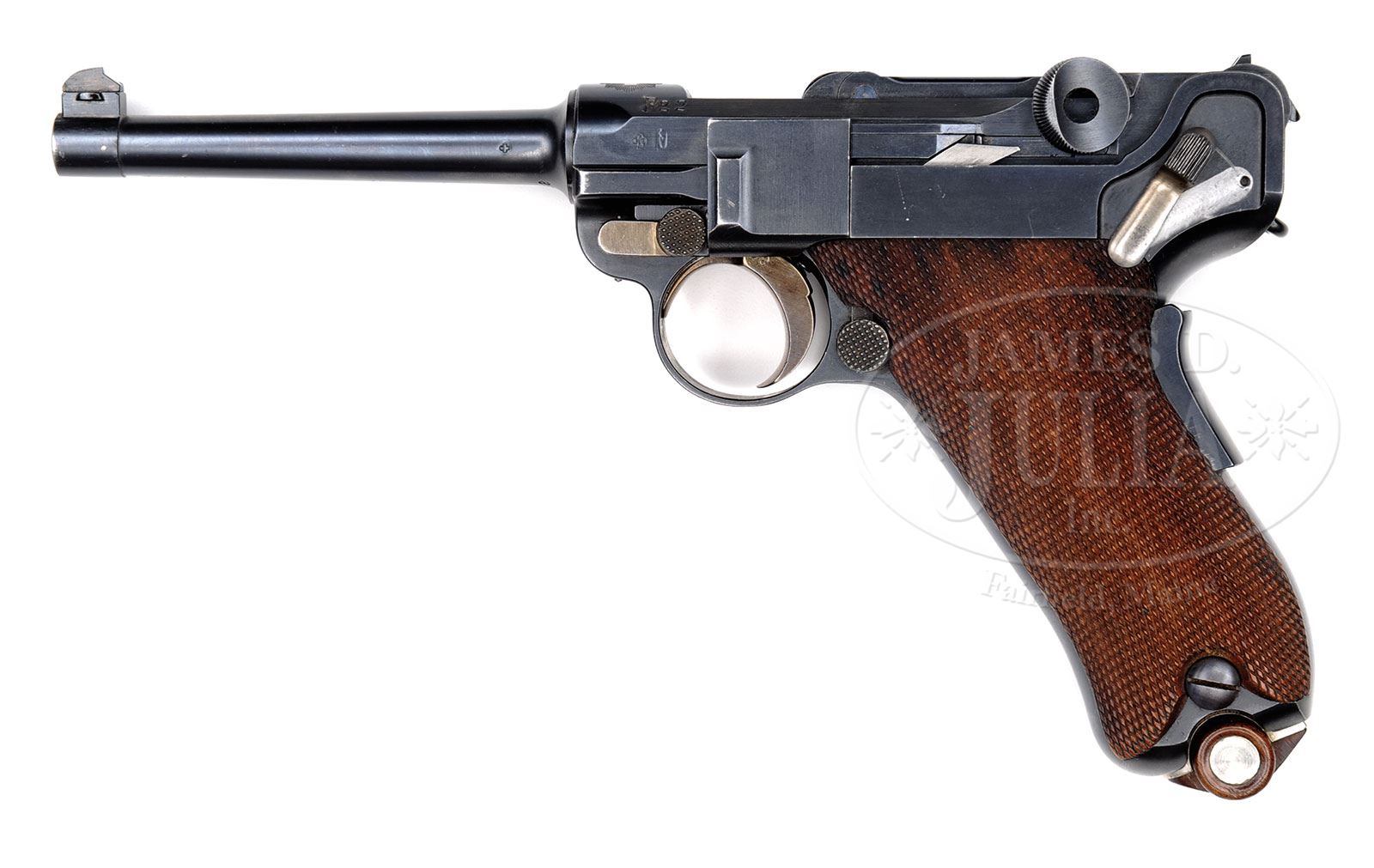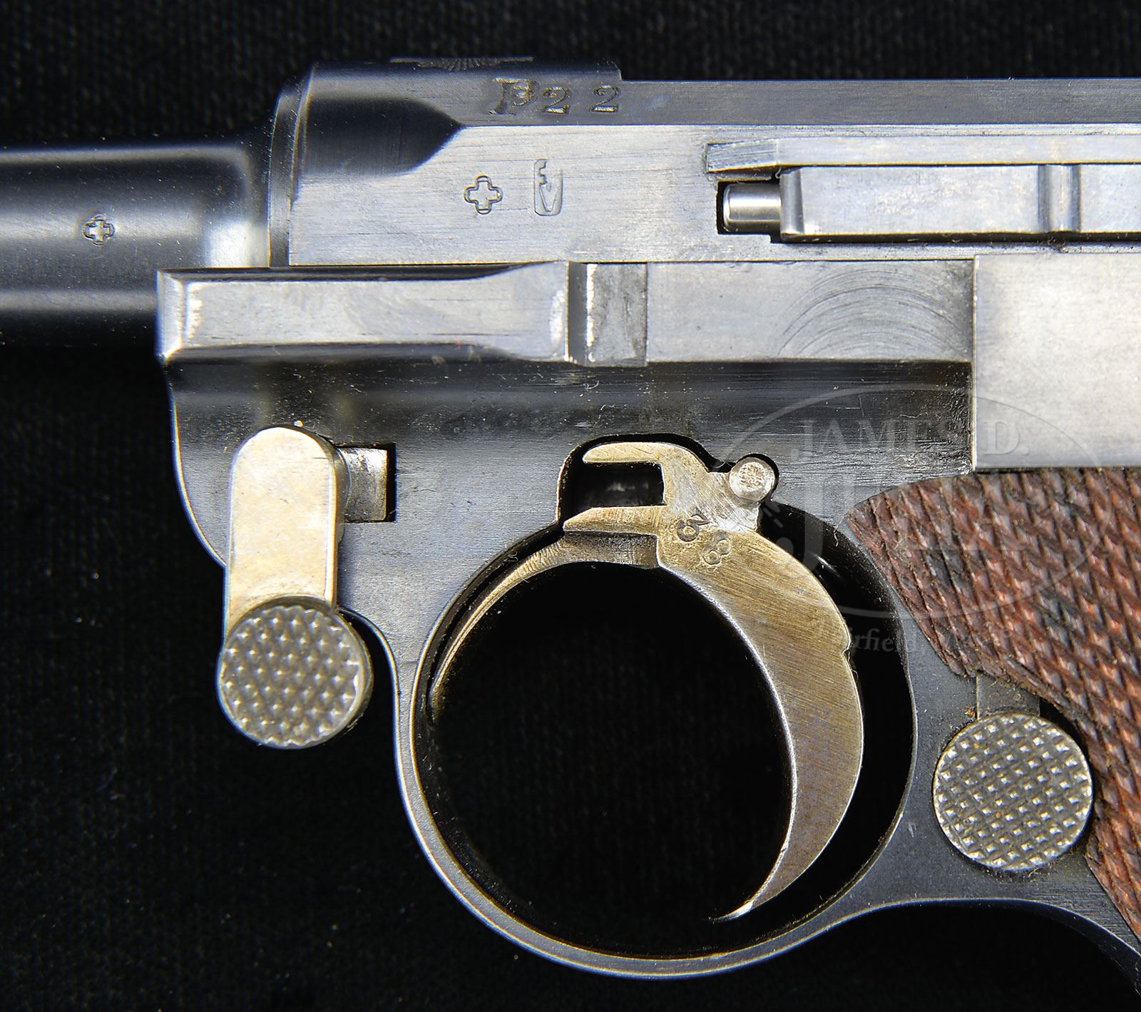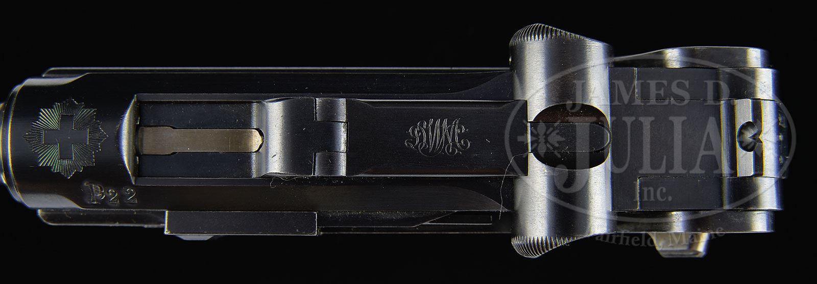 *◊ BEAUTIFUL 1900 WIDE TRIGGER SWISS MILITARY CONTRACT LUGER.SN 4938. 4-3/4″ 7.65 mm Cal bbl with full SN on bottom. Swiss cross in sunburst above chamber with “P22” (indicates military release in 1922) above left side of chamber. DWM scroll on center toggle link. Dished toggles with toggle latch. Swiss proofs on left side of receiver and bbl. Grip safety with type 3 safety lever. Matching numbered wide trigger (fitted on last 1500 Swiss 1900 Military Lugers). All numbered parts are matching down to the checkered walnut grips. Swiss wood bottom magazine with metal disks. This gun is featured on pp. 215, 217, 220, 228, 551, 643 and 648 of The Borchardt & Luger Automatic Pistols by Joachim Gortz & Dr. Geoffrey Sturgess. PROVENANCE: Collection of Dr. Geoffrey Sturgess. CONDITION: Excellent. Retaining 97% orig blue with wear on sharp edges and some fading on grip straps. 90% orig straw. Bore is bright and sharp. Grips have little wear and few minor chips to checkering with wood grain still showing. Magazine has very little wear and some light corrosion on body. Mechanics are excellent. 4-52830 BWS139 (4,000-6,500) – Lot 1168
