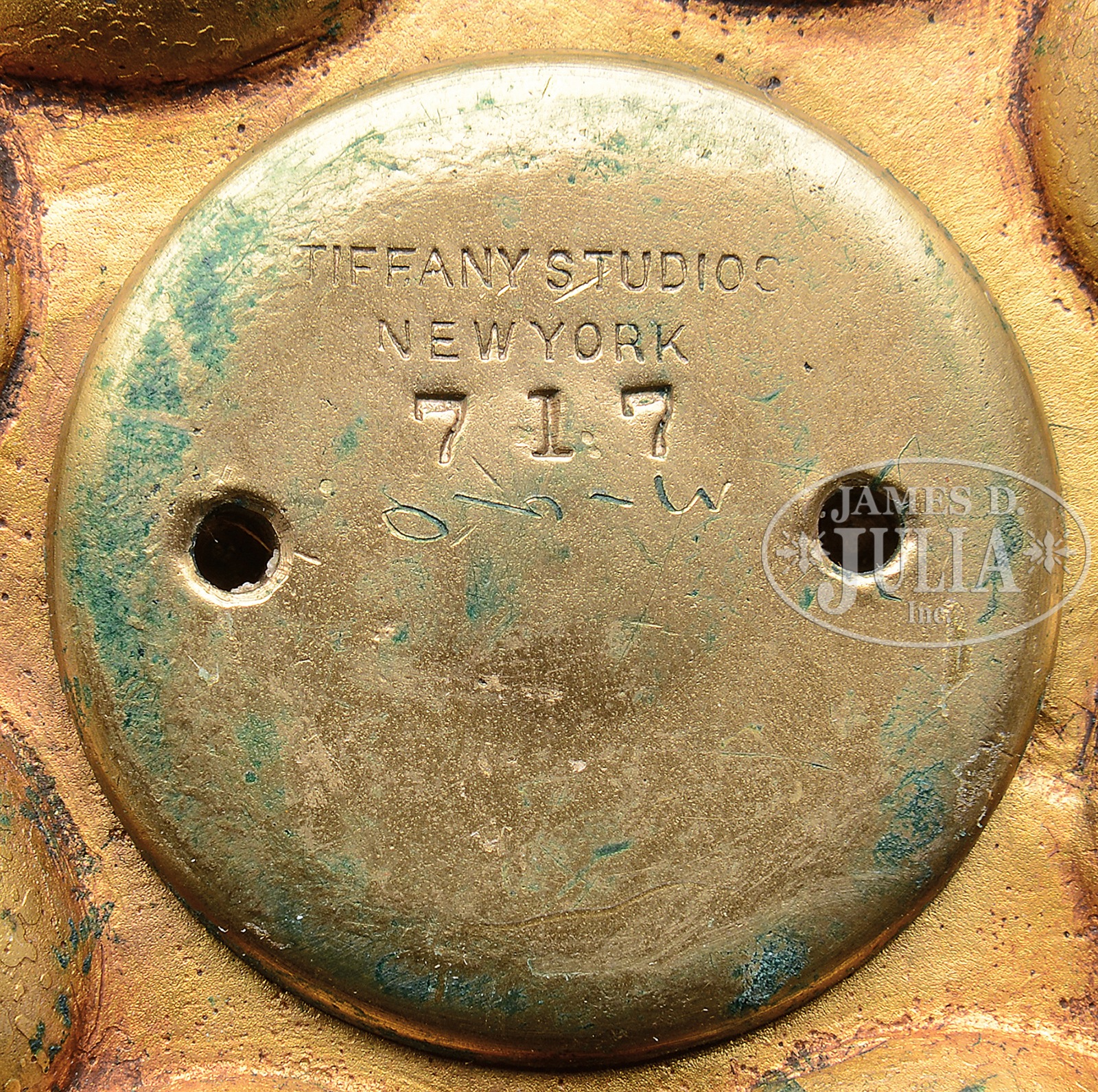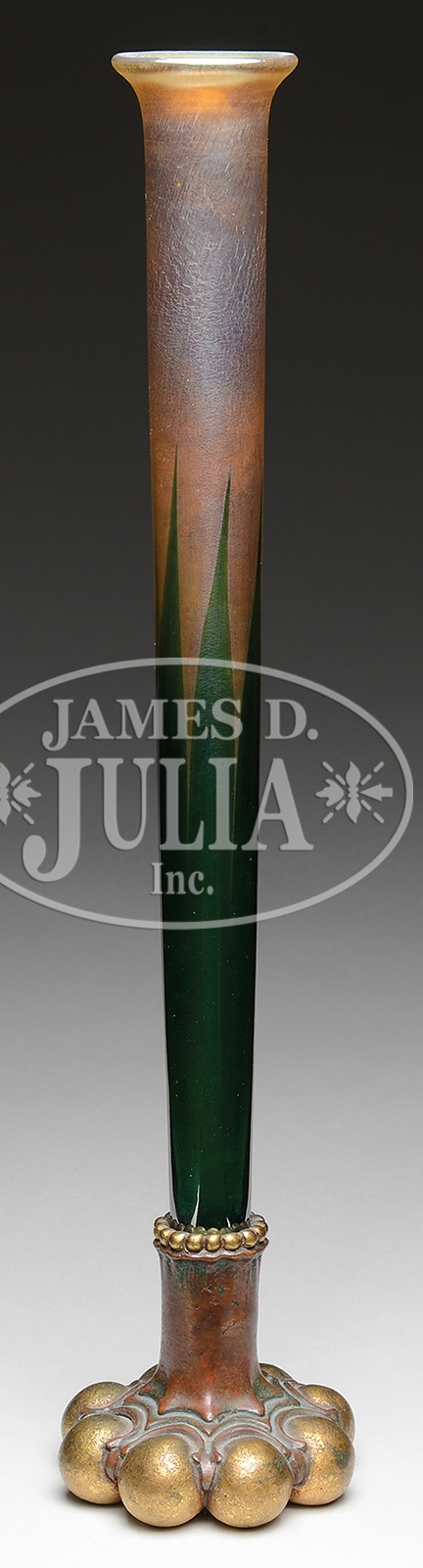 TIFFANY STUDIOS BUD VASE.Tiffany Studios bud vase has bronze foot with eight cast bronze balls surrounding the foot and supporting the hollow stem vase holder with beaded top. The beaded trim and ball foot are finished in gold dore while the rest of the bronze holder is finished in a reddish-brown patina. The base holds a tall slender favrile glass insert with green pulled feather design ascending from the bottom against a gold iridescent background. Vase is signed on the bottom “L.C.T.” while the bronze holder is signed on the underside “Tiffany Studios New York 717”. SIZE: 13-1/4″ t. CONDITION: Very good to excellent with some minor discoloration to gold dore. 42052-35 (800-1,200) – Lot 1168