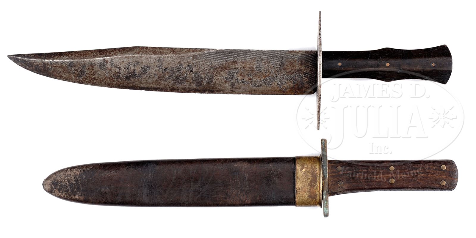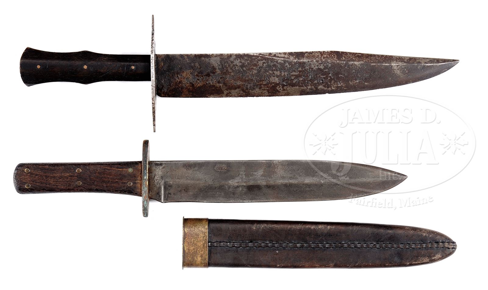 2 CLIP POINT BOWIE KNIVES OF POSSIBLE CONFEDERATE ORIGIN.1) 11-1/4″ clip point blade made obviously from file, 16-1/4″ overall, 1-5/8″ width with shaped wood handle with three brass pins attaching grip. 4-1/2″ lozenge shaped iron crossguard. 2) 9-3/4″ clip point blade, 14-3/4″ overall side knife with spurious “MACON / ARSENAL” stamped on blade. Thick brass 3″ crossguard with weathered wood handles retained with six brass pins. It is difficult to date this knife and may be of quite recent manufacture, the markings are quite modern. PROVENANCE: The Estate Collection of Phil A. Bleakney, Jr. CONDITION: 1) Good overall. Blade is gray with staining & pitting. Numerous small chips in cutting edge. Grip is sound & solid with hand worn patina with small nicks, scratches. 2) Good overall. Old sharpening. Accompanying scabbard appears to be new fabrication. 49059-208, 49059-210, JS (1,000-2,000) – Lot 1168 Click here to view provenance