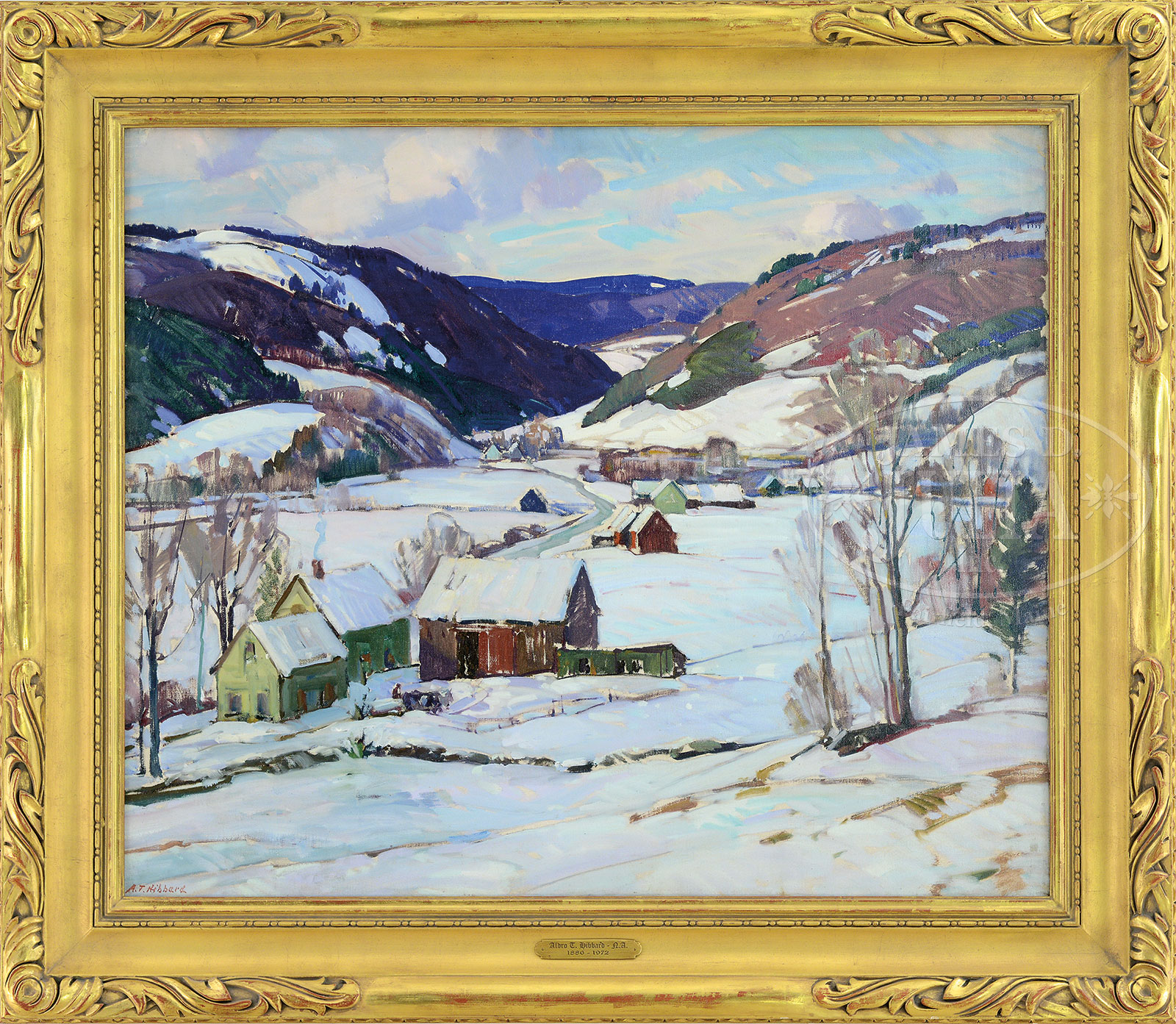 ALDRO THOMPSON HIBBARD (American, 1886-1972) WEST RIVER, VERMONT.Oil on canvas Housed in a modern carved giltwood frame with presentation plaque Signed lower left “A.T. Hibbard”, inscribed on verso “63-4″ SIZE: 30″ x 36”. Overall: 39-1/4 x 45-1/4″ CONDITION: Very good 51854-1 (15,000-25,000) – Lot 1168