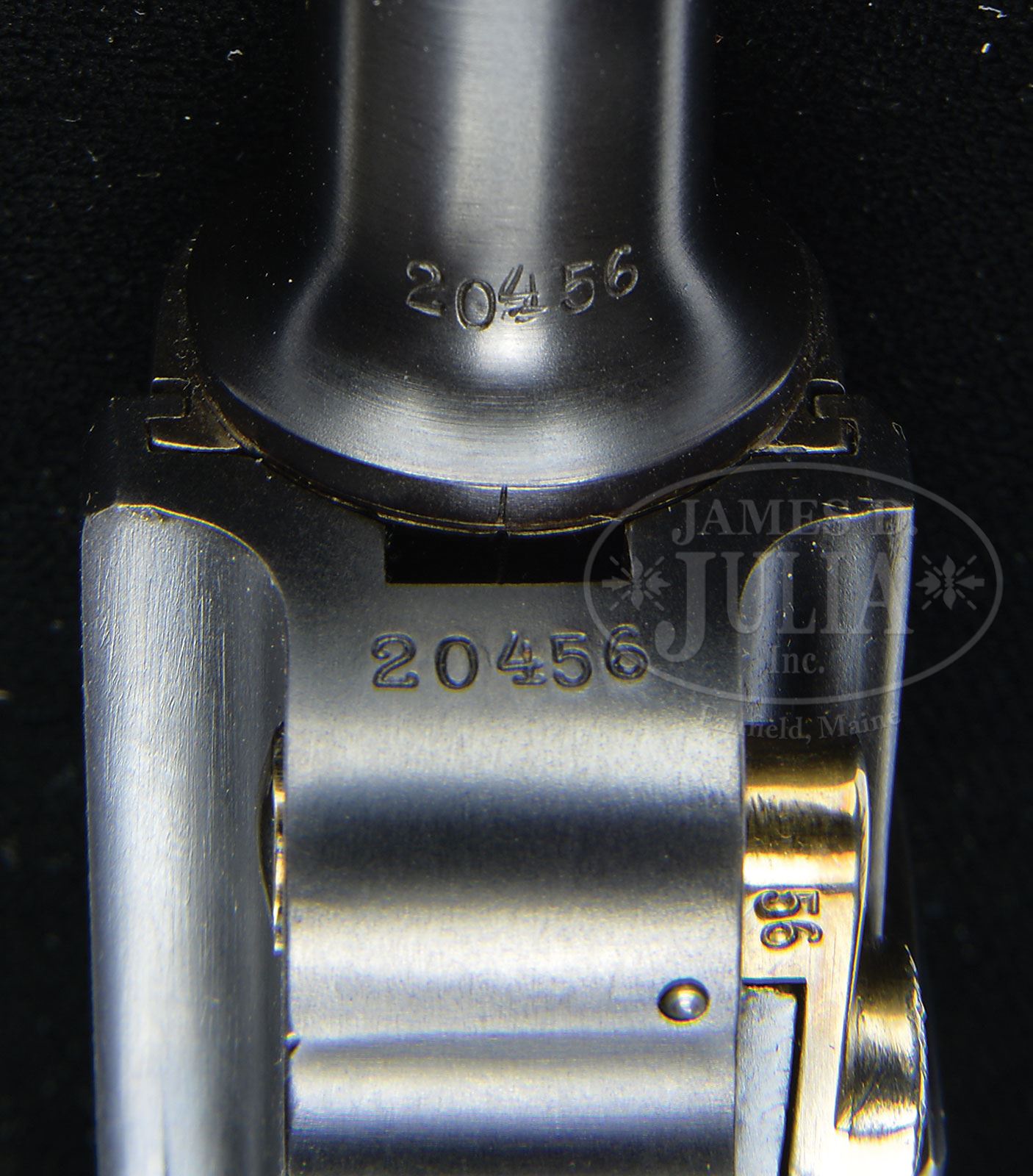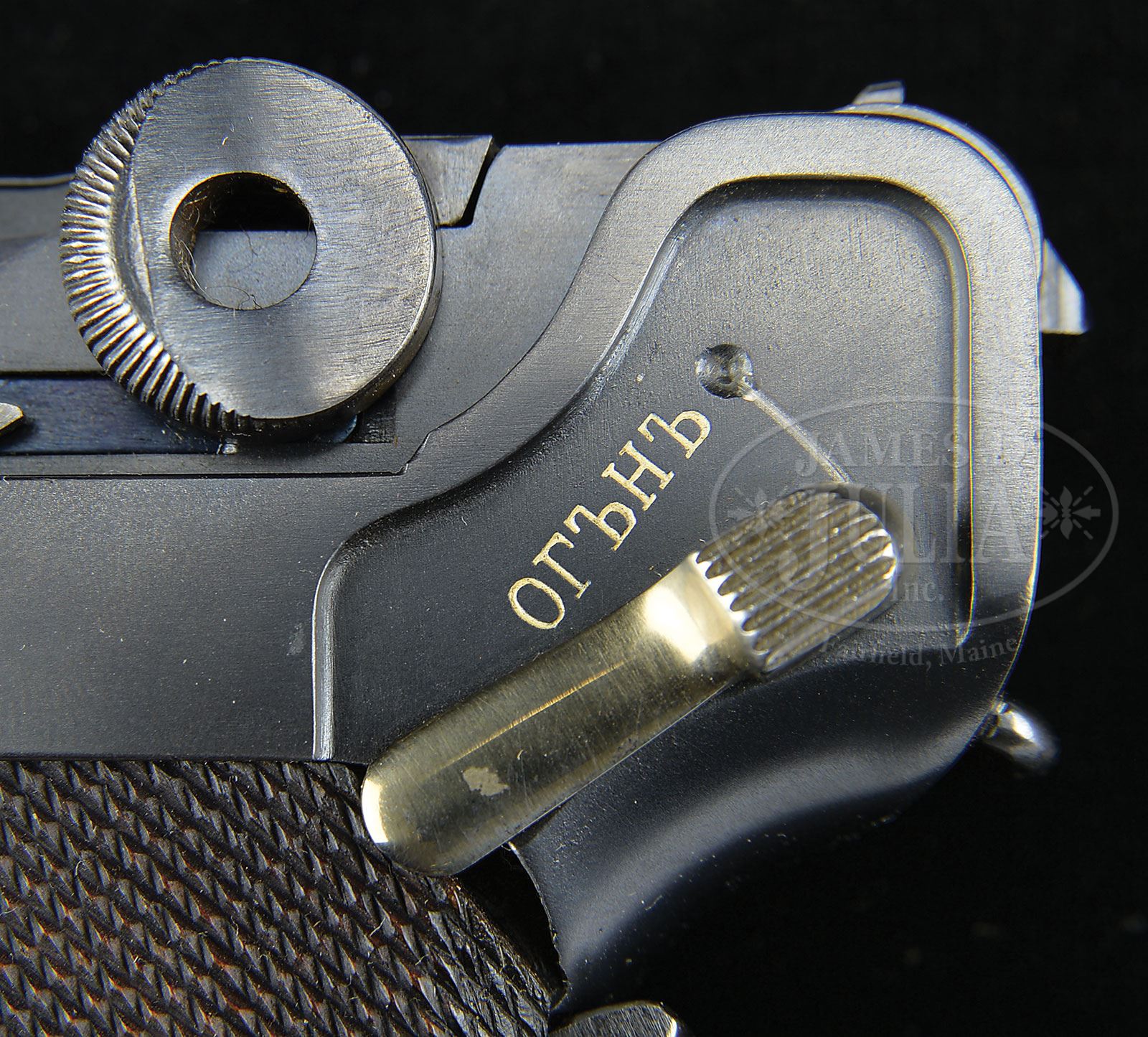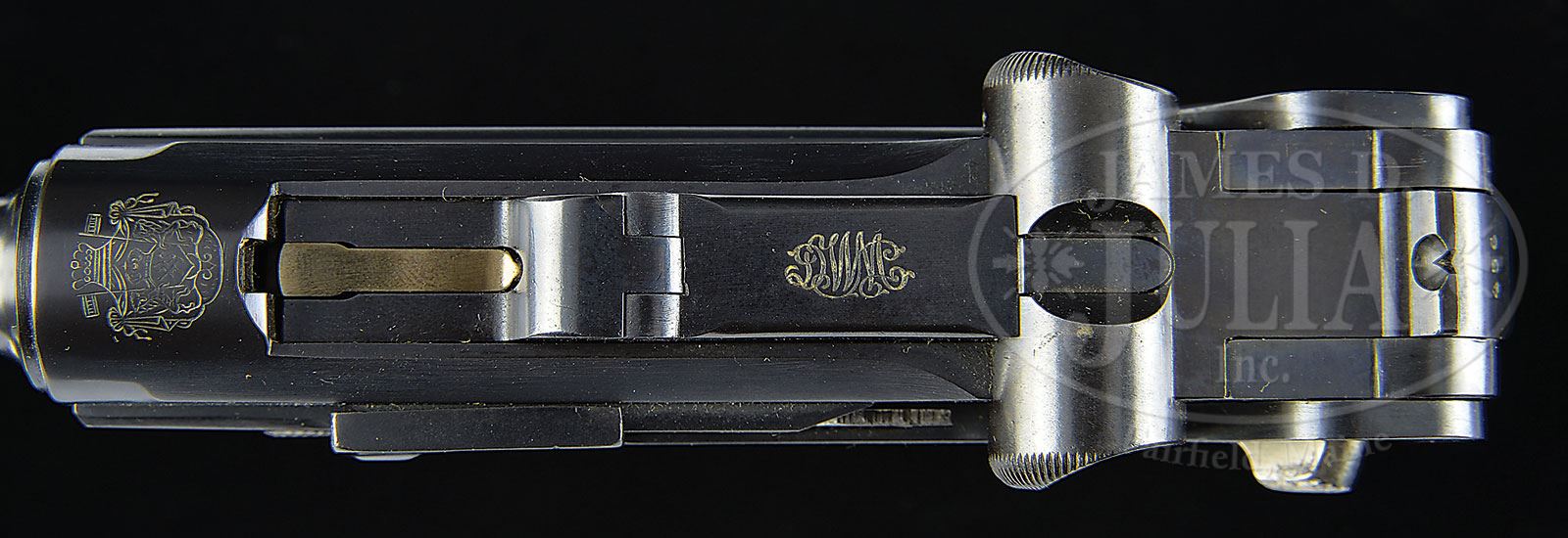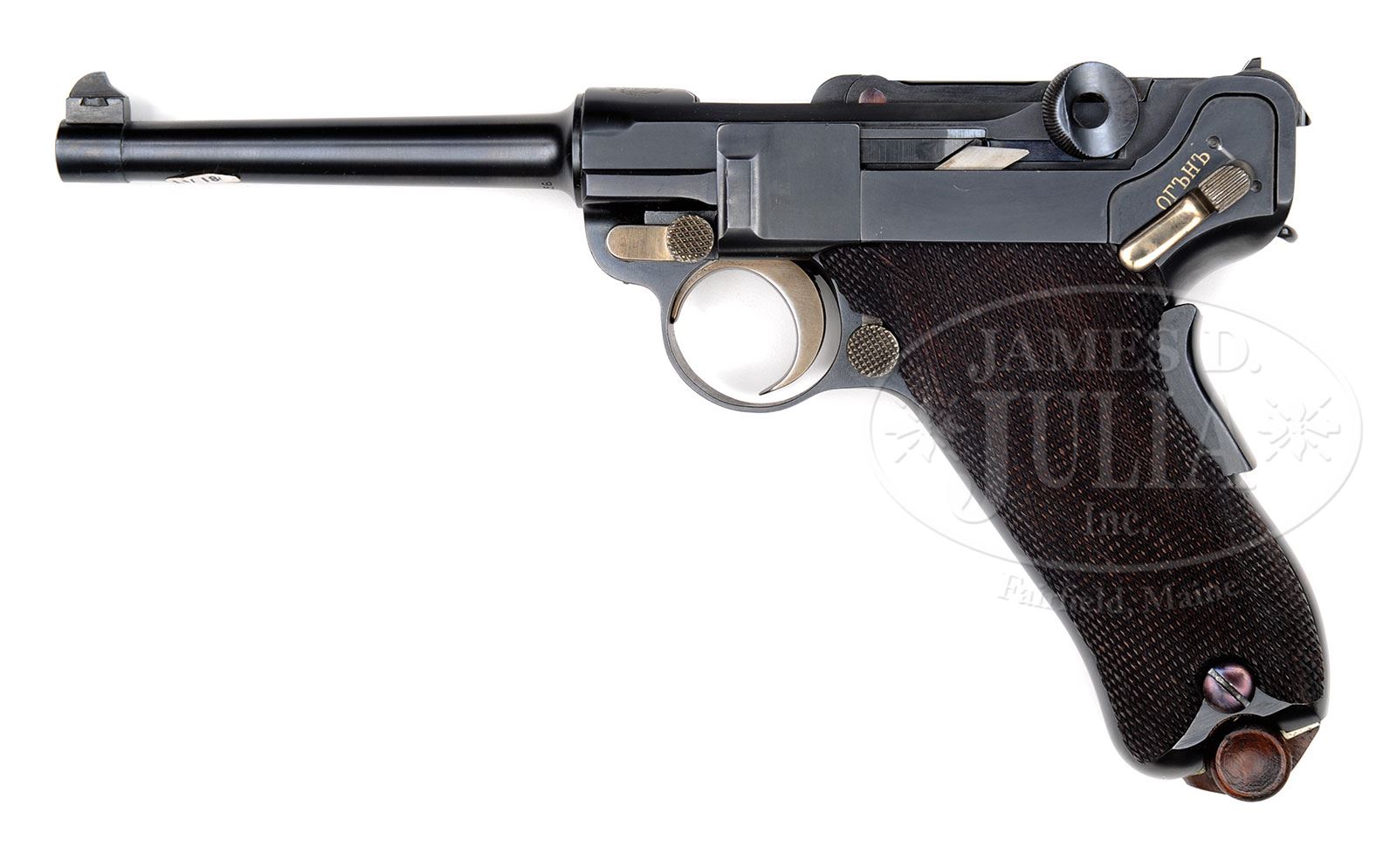 SN 20456. 4-3/4″ 7.65 mm cal. bbl with full SN on bottom. Bulgarian crest above chamber. DWM scroll on center toggle link. Dished toggles with toggle latch. Bulgarian marked safety. Grip safety. All numbered parts are matching. Checkered walnut grips. Plain wood bottom magazine. PROVENANCE: Collection of Dr. Geoffrey Sturgess. CONDITION: Excellent. Restored to near new condition. 99% blue and 99% straw. Grips are oil-soaked dark and have sharp checkering. There are a few minor chips and indents to checkering and left grip has a chip missing under the safety lever. Magazine has little wear and a couple minor dings to wood bottom. Holdopen is missing. Bore is worn with light pitting. Mechanics are excellent. 4-52853 BWS147 (3,500-7,000) – Lot 1170