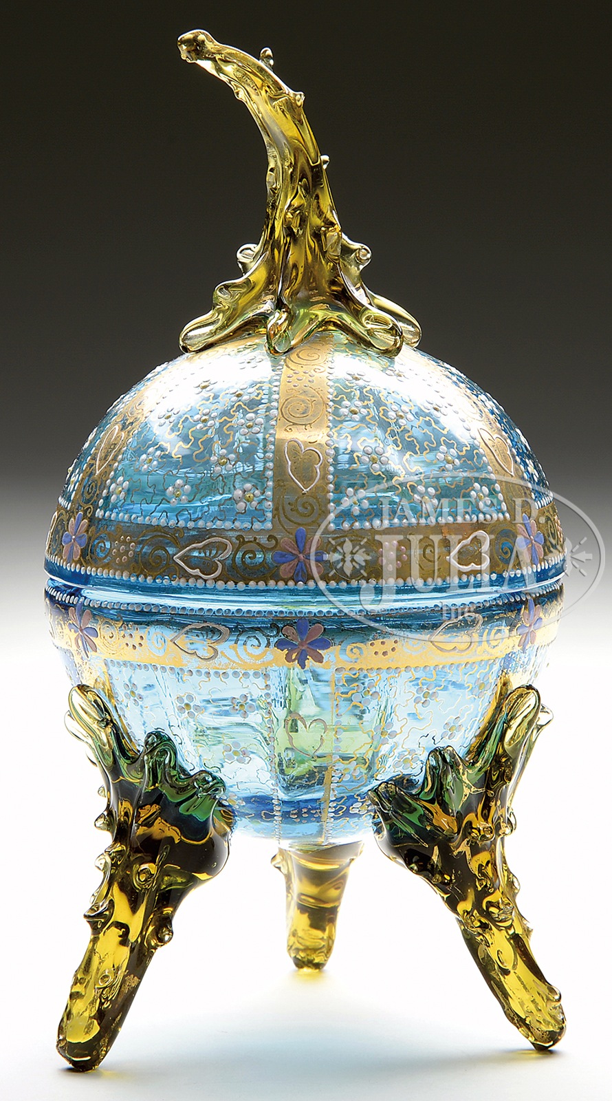 MOSER COVER BONBON.Moser Bonbon has blue glass body with white and yellow enameled flowers and gilded bands. The base is finished with three applied amber glass feet and the bonbon is topped with a matching domed lid with applied amber glass finial. SIZE: 9-1/4″ t. PROVENANCE: George Klabin Collection. CONDITION: There is a heat check to the lid approx. 1″ long where finial meets the lid. 5-67264 (100-200) – Lot 1172