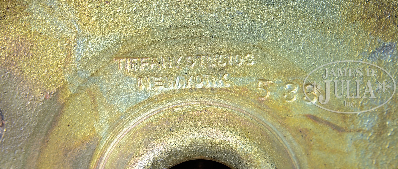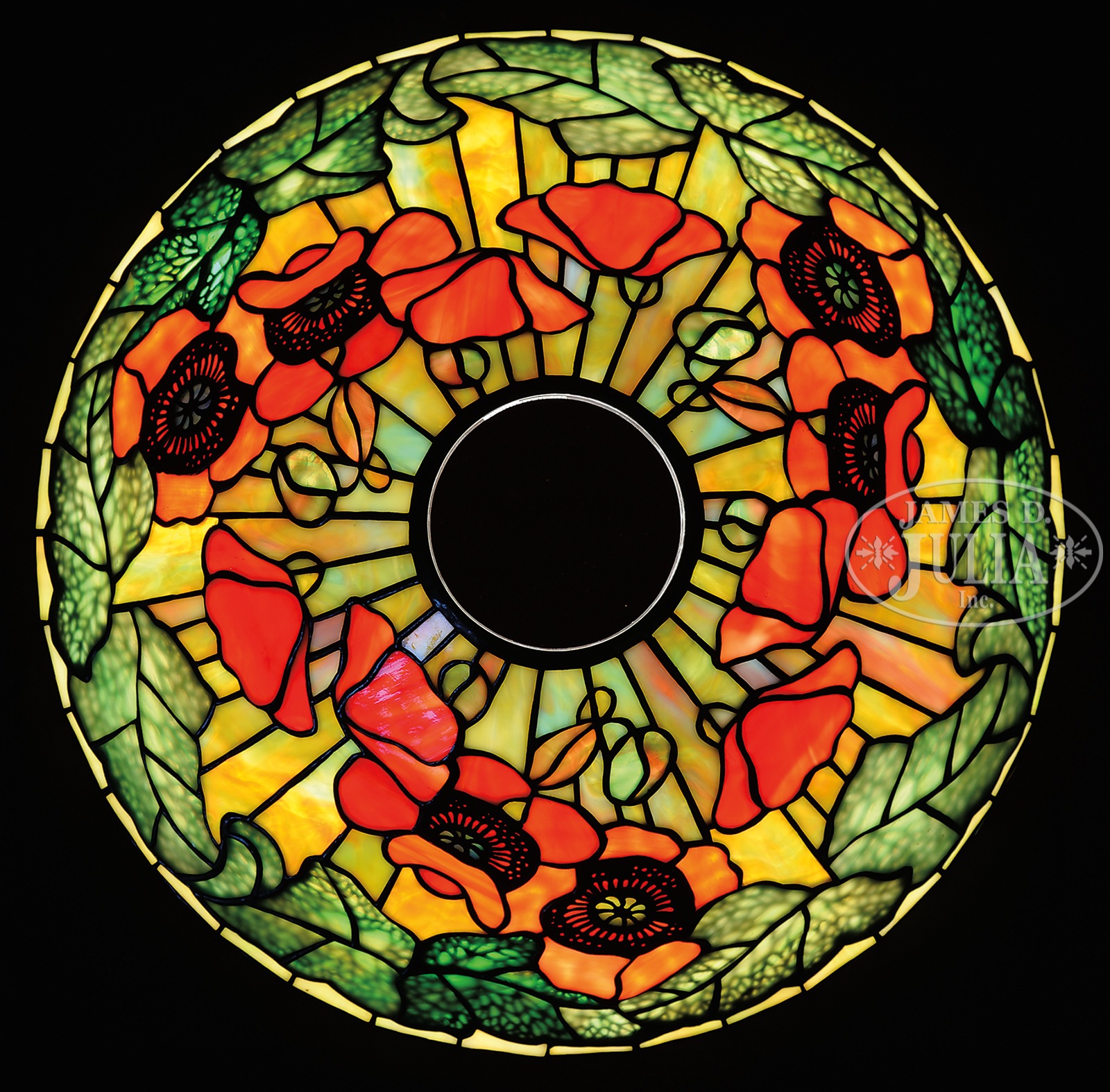 TIFFANY STUDIOS POPPY TABLE LAMP.Tiffany Studios table lamp has leaded shade with orange and red poppies against a striated green, yellow and brown background. Poppies are bordered by a band of striated green leaves. Stamen of each open poppy is done with acid etched bronze overlay. Interior of shade is also finished with acid etched bronze overlay depicting the veining in the leaves. Shade is signed on interior edge “Tiffany Studios N.Y. 1461”. Shade rests on a Tiffany Studios stick base with 3 socket cluster and replacement heat cap. Base is finished in a statuary patina and has been re-wired with appropriate cloth cord. Lamp retains a Sotheby’s Auction tag. Base is signed on the underside “Tiffany Studios New York 533”. SIZE: Shade 16-3/4″ dia. Lamp 21-1/2″ t. PROVENANCE: Jean Paul Loup Collection. CONDITION: Shade is very good to excellent with very few if any tight hairlines. Base is very good to excellent with some minor wear and discoloration to patina. 49647-4 (25,000-35,000) – Lot 1172