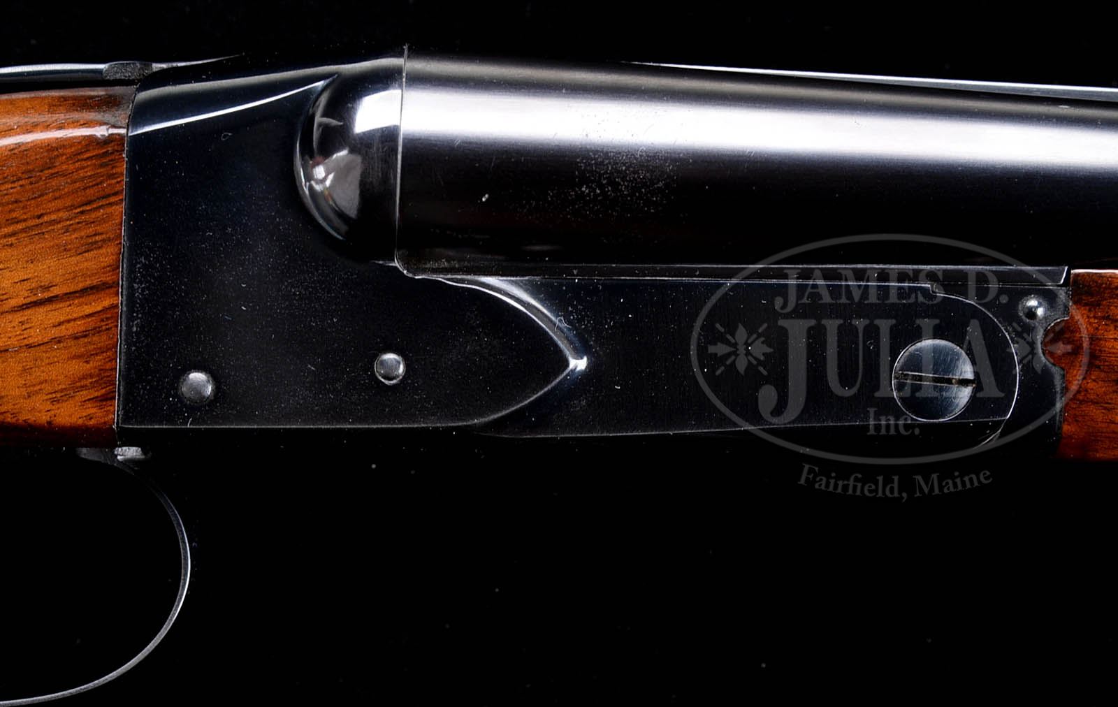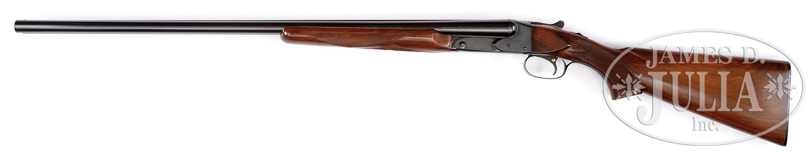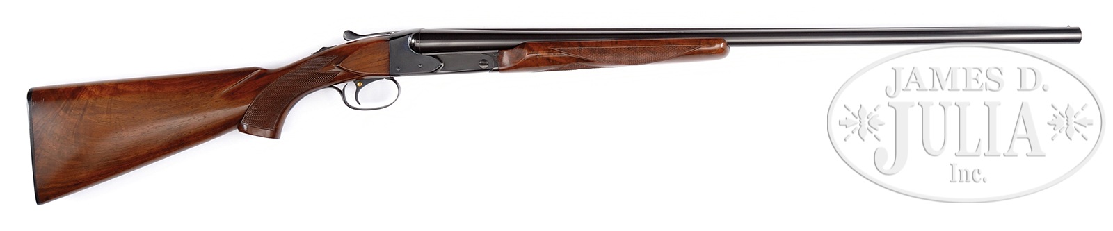 *GREAT WINCHESTER MODEL 21 16 GAUGE SHOTGUN.SN 24504. Cal 16 ga. 28″ bbl. 2-3/4″ chamber marked M/F, but measures cyl/mod. Ejectors. Single selective trigger. Classic pistol-grip beavertail Winchester American walnut stock. 14″ LOP over Winchester poly buttplate. Cased in later Winchester hard case. CONDITION: Good overall orig condition with nearly all orig blue in varnish intact. Slight freckling on bottom of receiver and faint wear on edges of frame and muzzle. 50994-5 FTL (4,000-6,000) C&R – Lot 1173