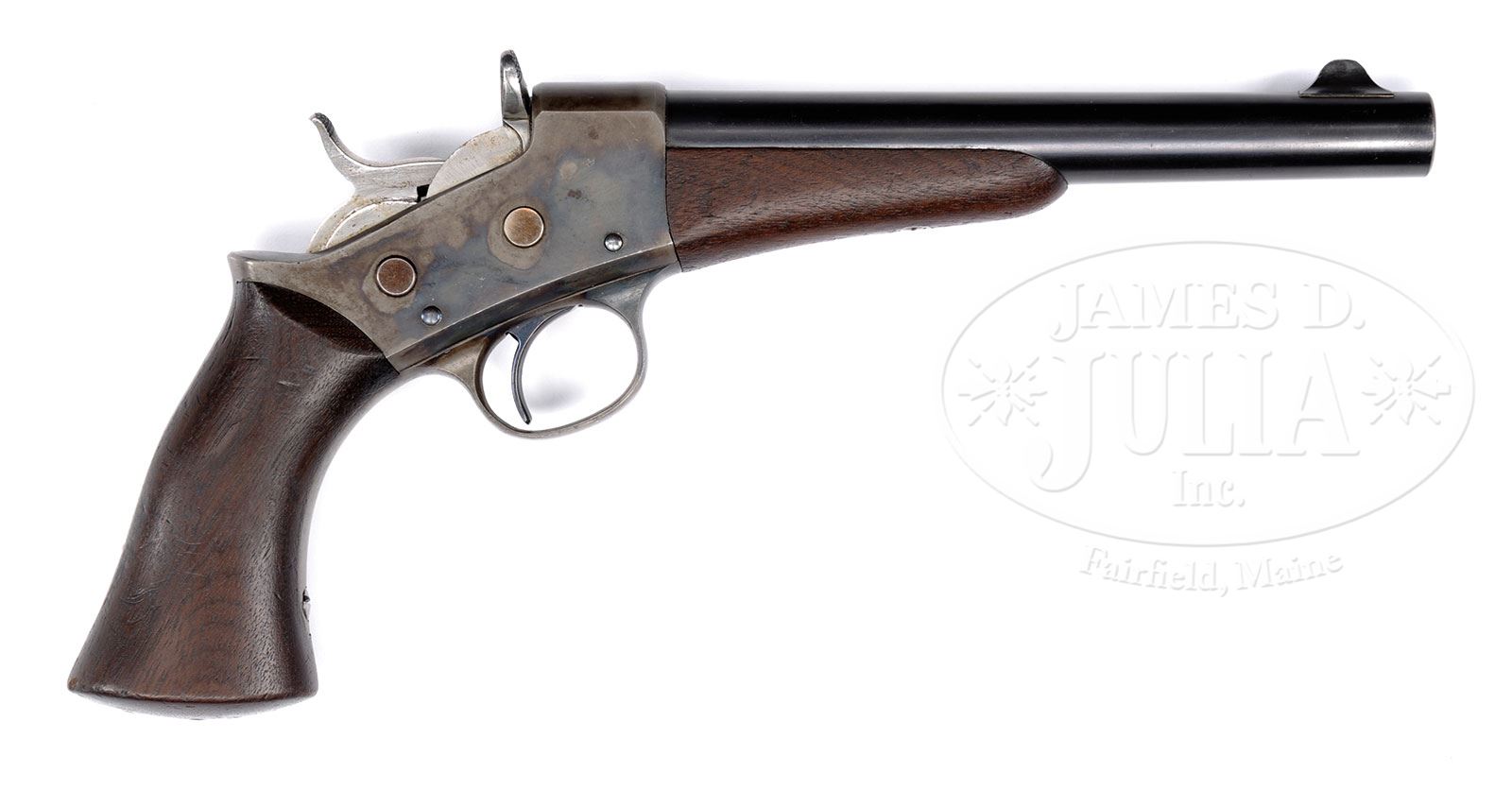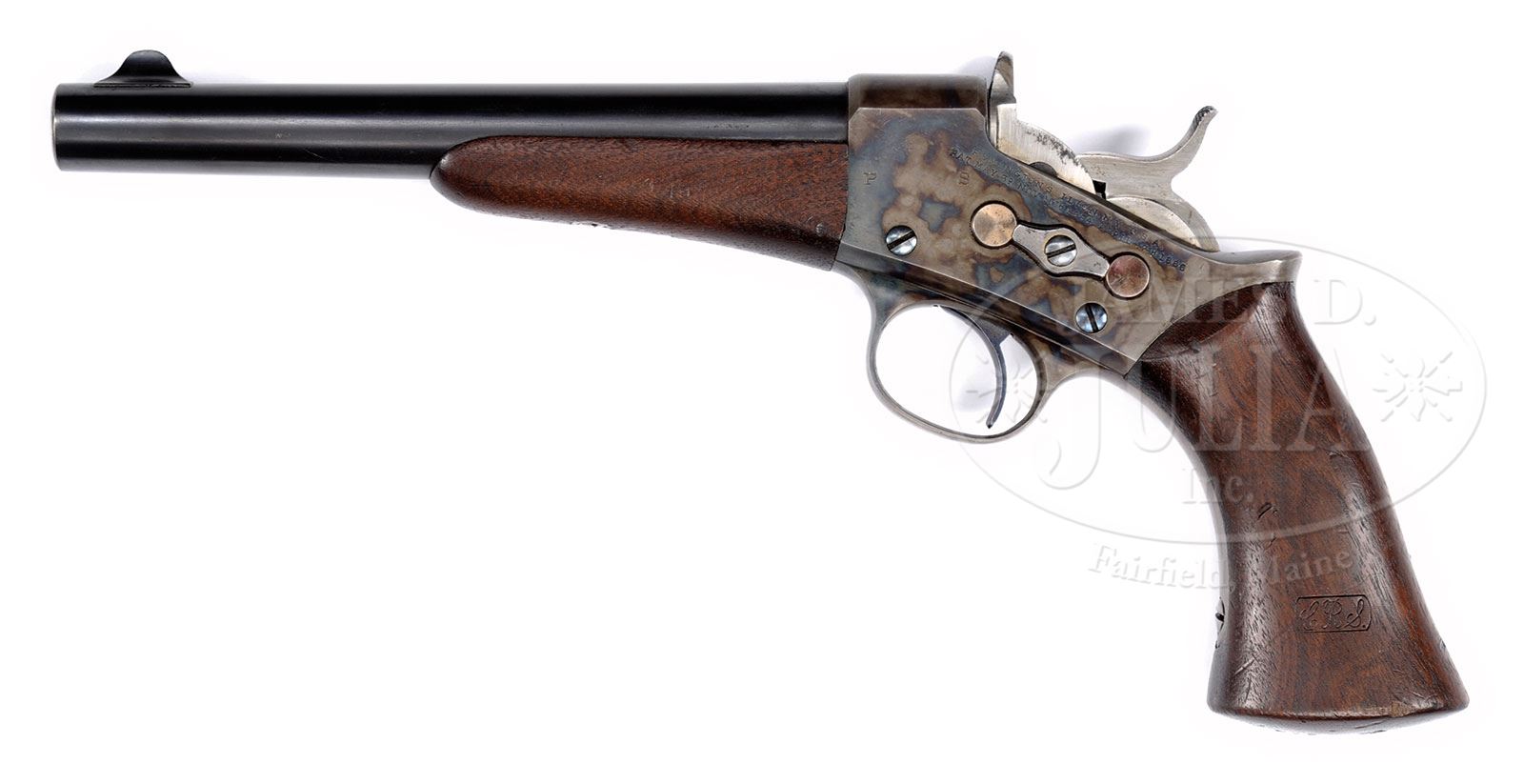 SCARCE REMINGTON MODEL 1871 ROLLING BLOCK ARMY PISTOL.SN 3077. Cal 50 CF. Fine Remington rolling block pistol with 8″ rnd bbl, pinched blade front sight and V-notch rear sight integral with the breech block. Frame, trigger guard and grip straps are color case hardened. Breech block and hammer are finished bright. Screws are bright fire blue, as is the trigger. Breech block and hammer pins are straw colored. Mounted with uncheckered 1-pc walnut grip matching numbered to this pistol and a tiny forearm. Left side of grip has a crisp “CRS” military inspection cartouche. About 6,000 of these pistols were produced 1872-1888. They were mostly issued and saw hard service and are rarely found today in orig configuration or with any orig finish. Large numbers of these pistols were altered or “customized” by ensuing generations of target shooters which has further reduced the numbers of orig specimens available. PROVENANCE: The Elliott Burka Estate Collection. CONDITION: Extremely fine plus. Bbl retains about 98-99% bright orig blue with one small scratch. Frame and backstrap retain strong, bright case colors, moderately faded on the right side. Trigger guard retains brilliant case colors in sheltered areas, moderately faded on front strap and trigger bow. Breech block and hammer pins retain most of their orig straw colors and the trigger about all of its bright fire blue. Screws also retain about all of their bright fire blue. Grip has a couple of chips and ding s with some battering on the butt, otherwise wood is sound with a smooth, orig oil finish. Mechanics are crisp. Brilliant shiny bore. 4-56335 JR183 (3,500-5,000) – Lot 1174