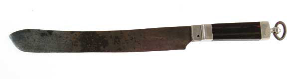LARGE ENGLISH BUTCHER KNIFE. Northwest coast trade knife with 11″ blade, 16″ overall. Left side of the blade marked “WILLIAM LANDELL” with the address. The handle is square Balleen with inlays on four sides. Bolsters are German silver with a long pommel cap containing a round iron ring. CONDITION: Blade has been cleaned and polished with deep pitting on both sides. Handle has a crack on each side and is missing some of the inlay on both sides. Also missing one of the front bolster rivets. 4-47042 JR532 (200-400)