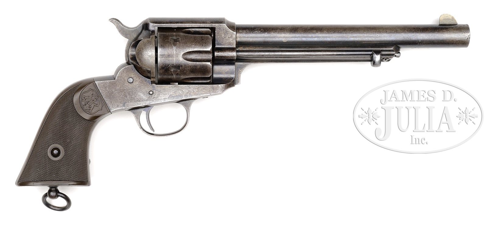 RARE REMINGTON MODEL 1890 SINGLE ACTION ARMY REVOLVER.SN 1894. Cal. 44 WCF (44-40). Scarce blue finish with 7-1/2″ bbl, German silver front sight and 1-line “REMINGTON ARMS CO. ILION. N.Y.” address. Left side of frame is marked “44 C.F.W.” Mounted with 2-pc checkered hard rubber grips with fancy Remington logo at the tops. Buttstrap has a factory stud and ring. The Remington Model 1890 was an improved version of their Model 1875 with cutout web on the ejector housing. There were only a little over 2,000 produced in the period 1891-1896. The Model 1875 & 1890 were produced as direct competitors for the Colt Model 1873 Single Action Army revolver. Unfortunately for Remington, even though the design was much more convenient for cleaning and cylinder removal, at the time they appeared on the scene Colt was already well established with the Army and civilians alike. No large military contracts were ever awarded to Remington and since Remington was more known for rifles and shotguns, their distribution and advertising were inadequate, and therefore sales were slow. By the time the Model 1890 was produced, sales of large bore Single Action revolvers had waned substantially in favor of the more convenient dbl action revolvers, and after only a short run, Remington stopped production of their big bore revolvers. It has been the experience of this cataloger that nickeled Models 1890 far outnumber blued ones. Finding a blue Model 1890 with orig finish is quite rare. PROVENANCE: Tommy Rholes Estate Collection. CONDITION: Very good to fine. Overall retains 30-35% orig blue, mostly in sheltered areas with the balance flaked more than worn to a medium patina. Grips are sound showing light diamond point wear and have turned chocolate. Hammer will not catch in safety notch, otherwise mechanics are fine. Strong bore with good shine and scattered fine pitting. 4-50737 JR96 (7,500-12,500) – Lot 1178